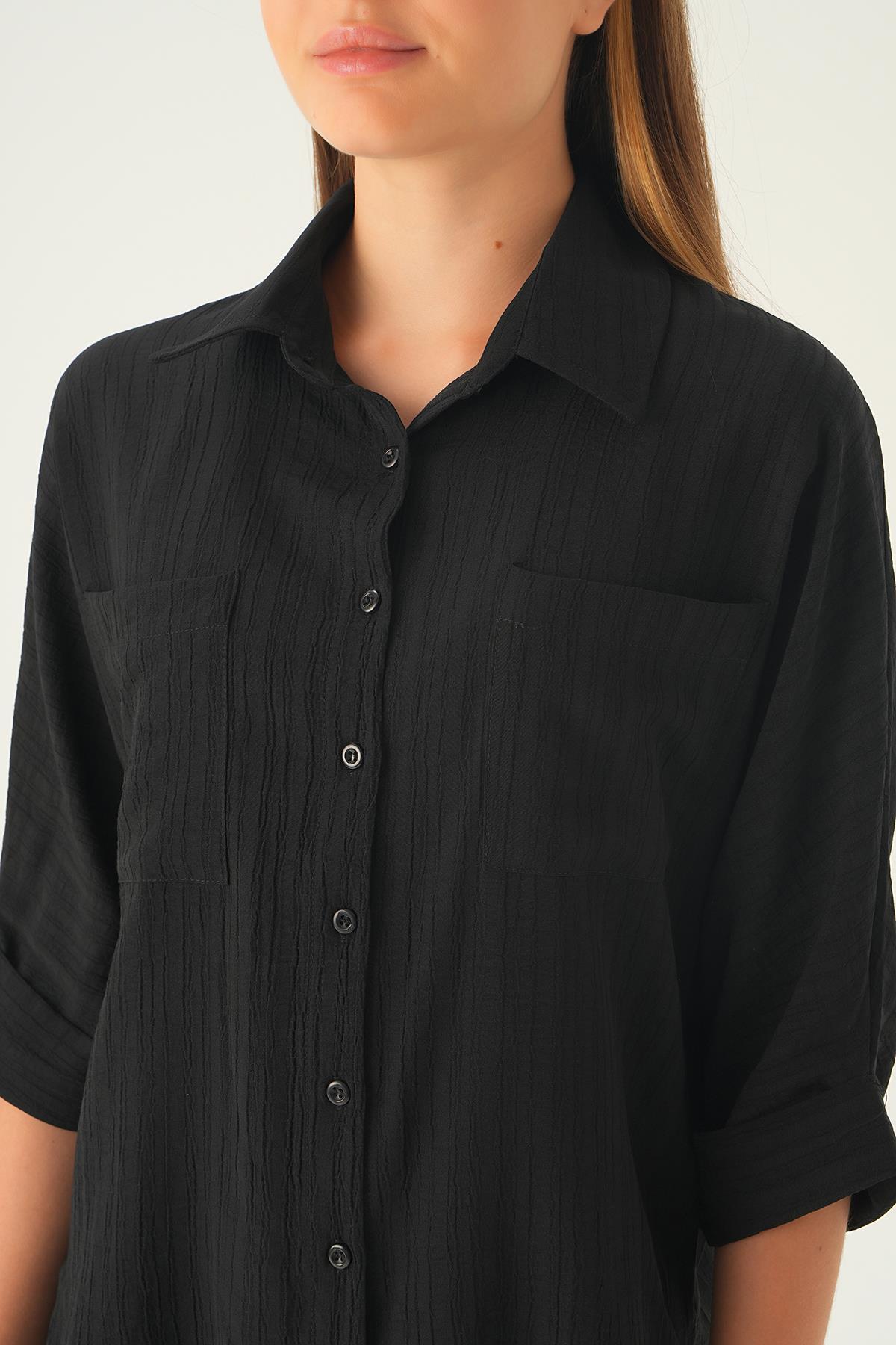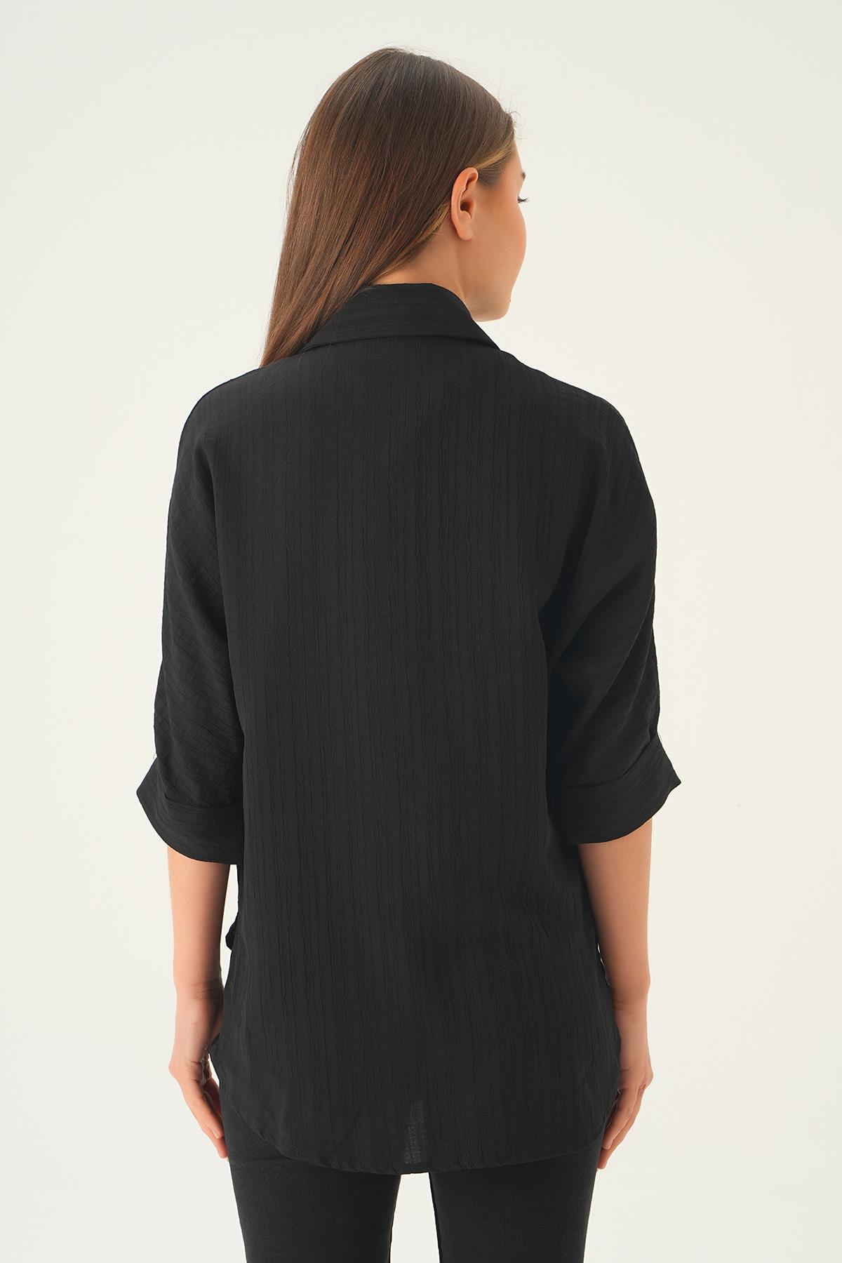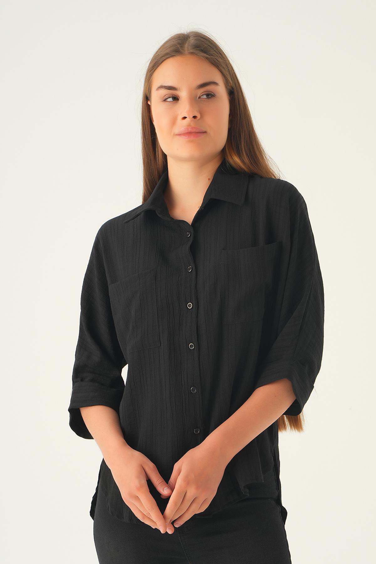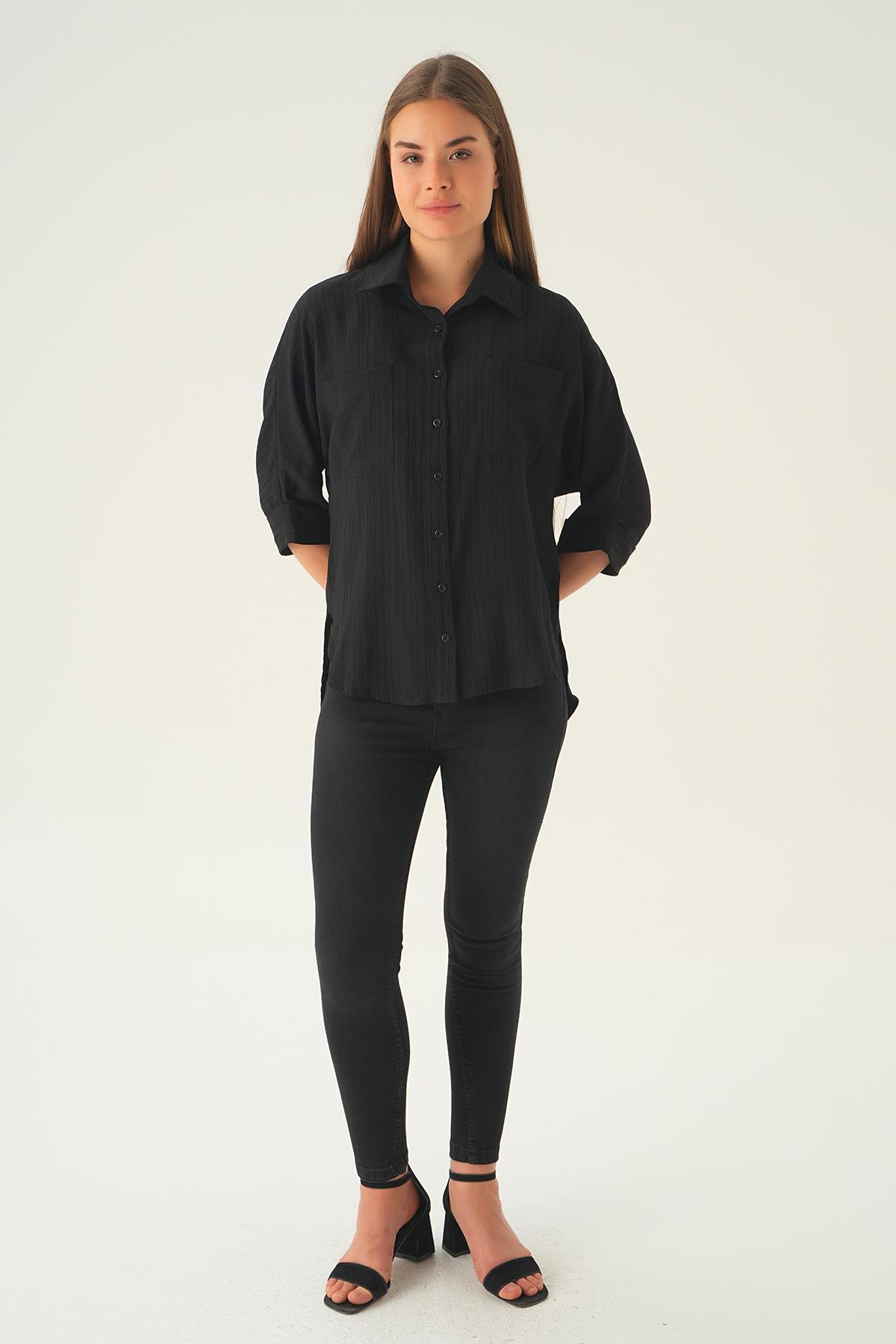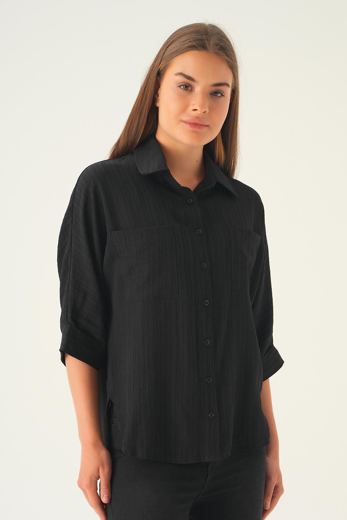 Siyah Kol Katlamalı Cepli Gömlek 4164A