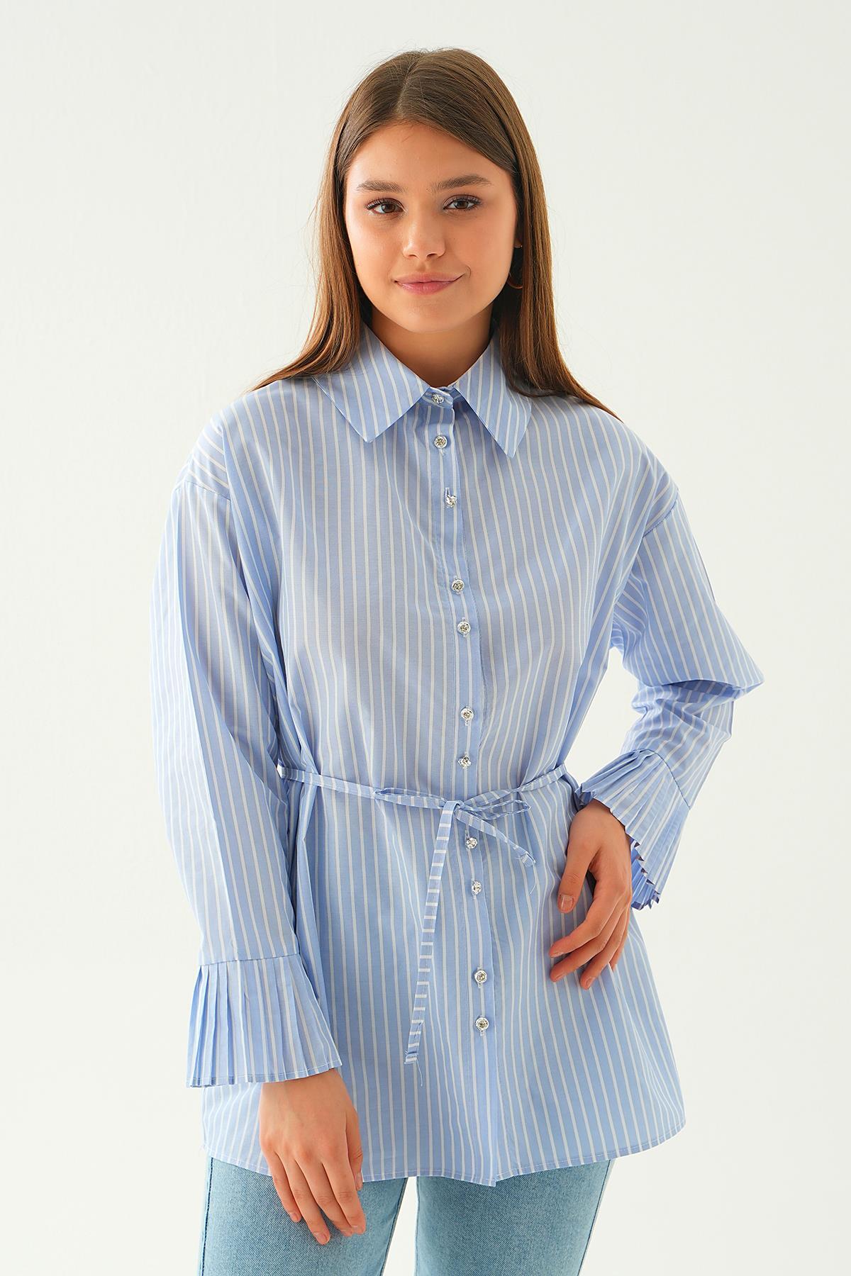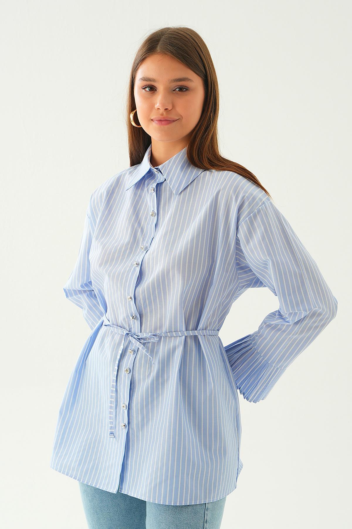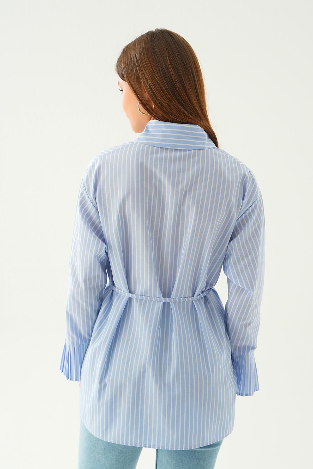 Mavi Bel Bağlama Detay Çizgili Gömlek 4188A