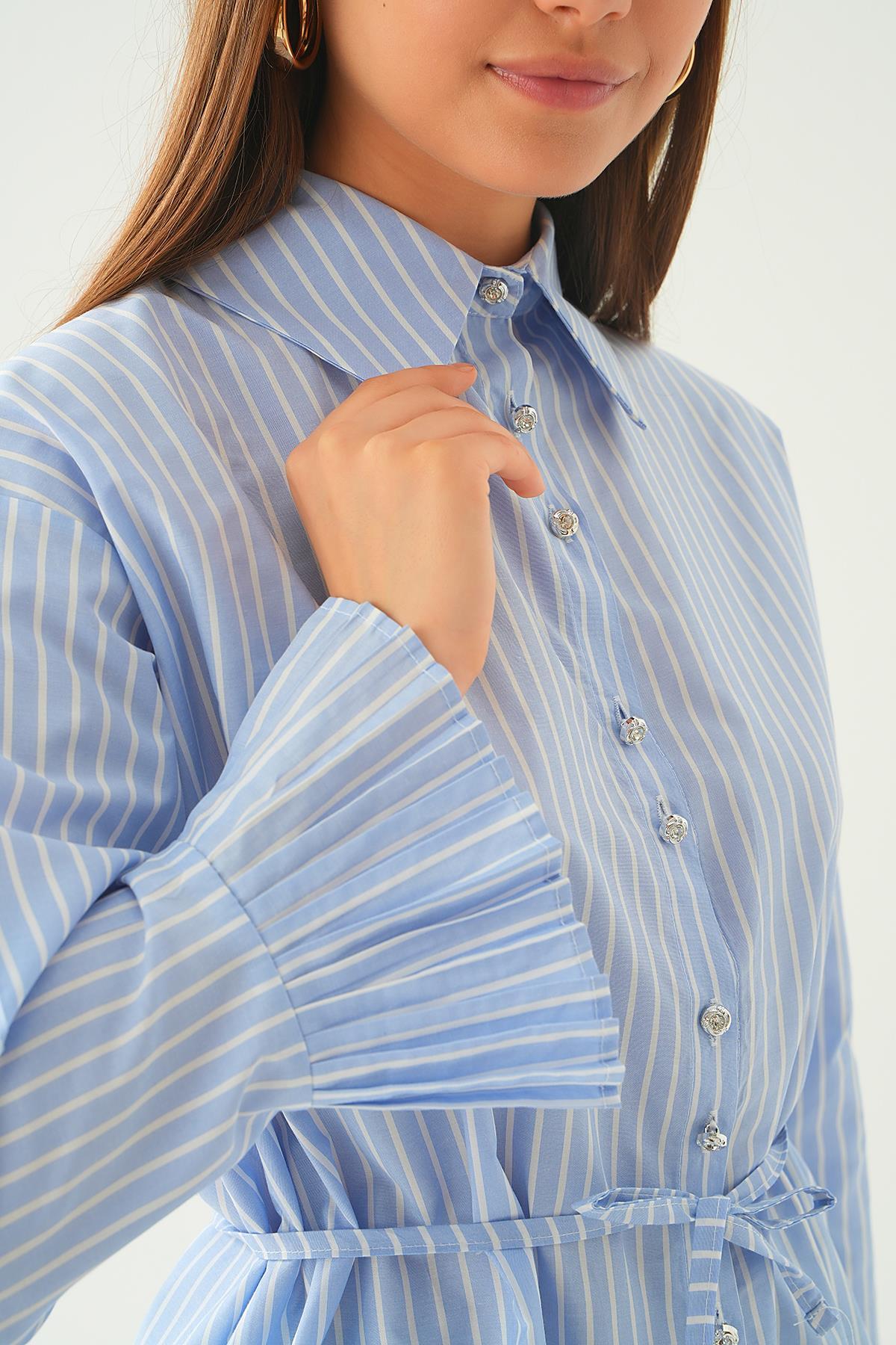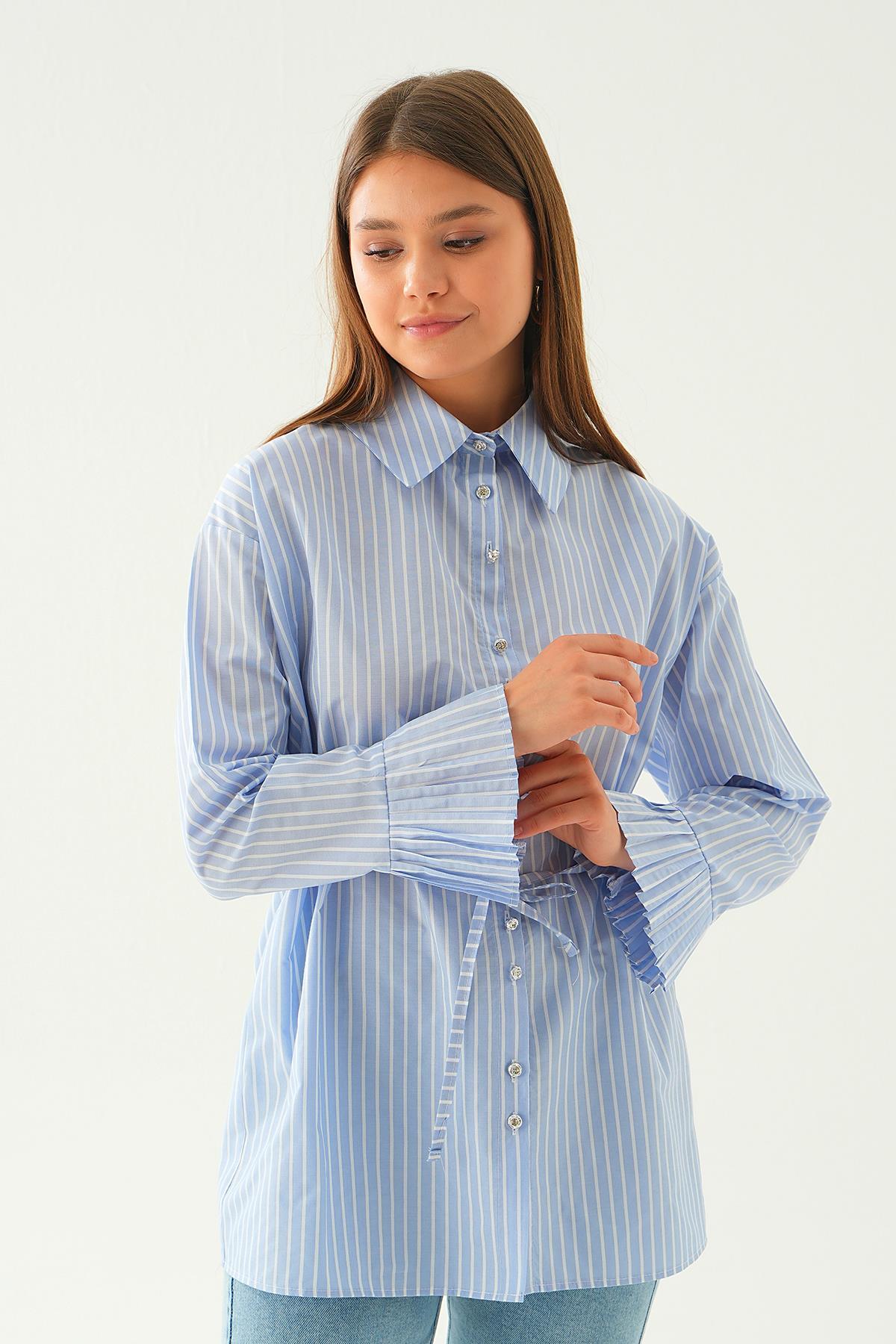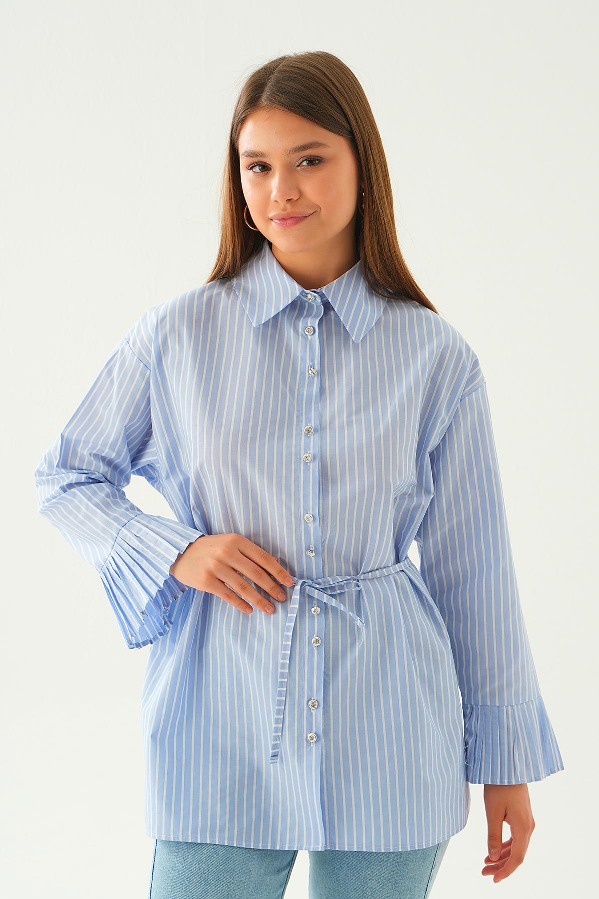 Mavi Bel Bağlama Detay Çizgili Gömlek 4188A
