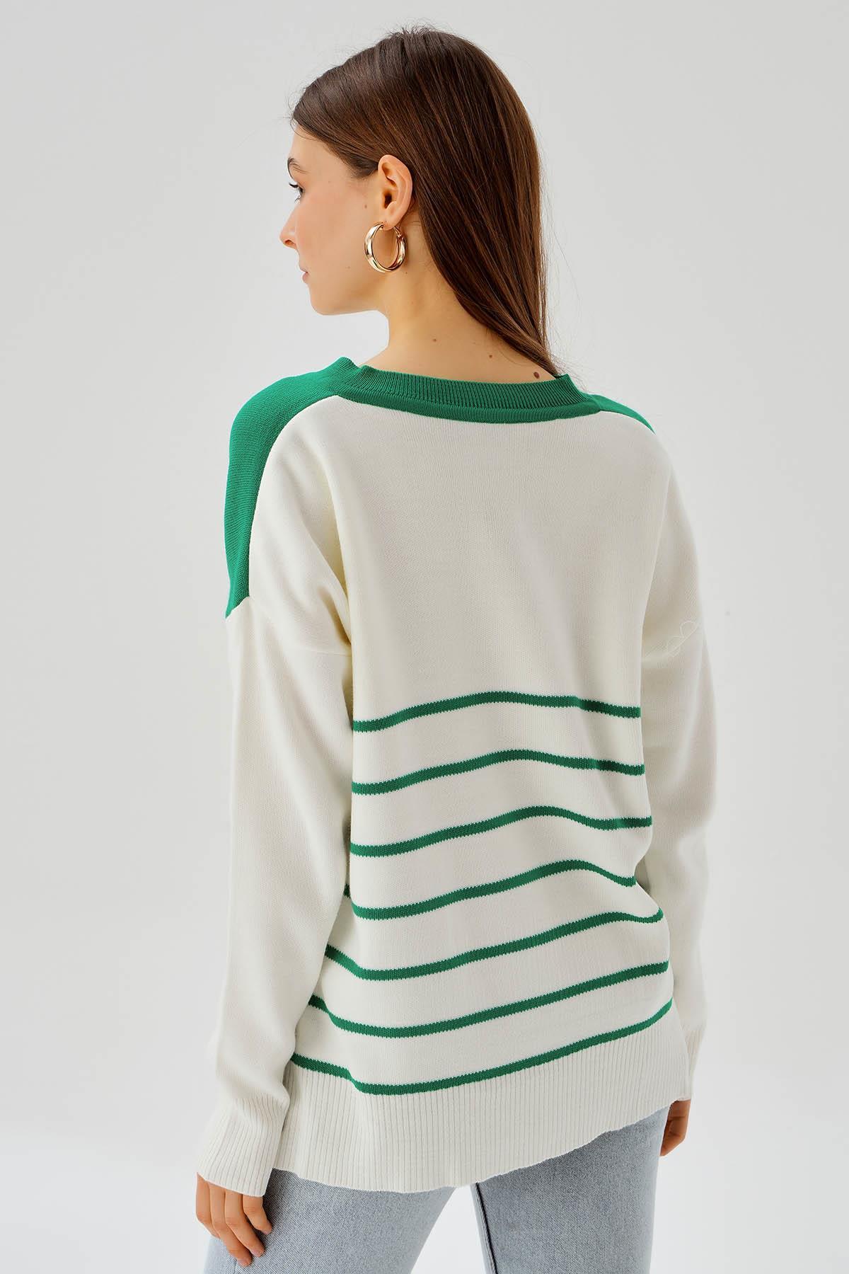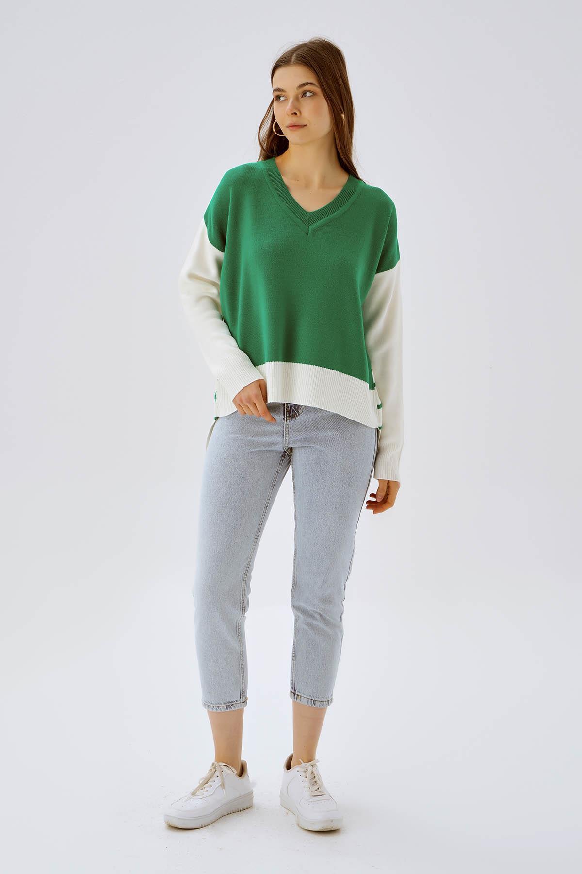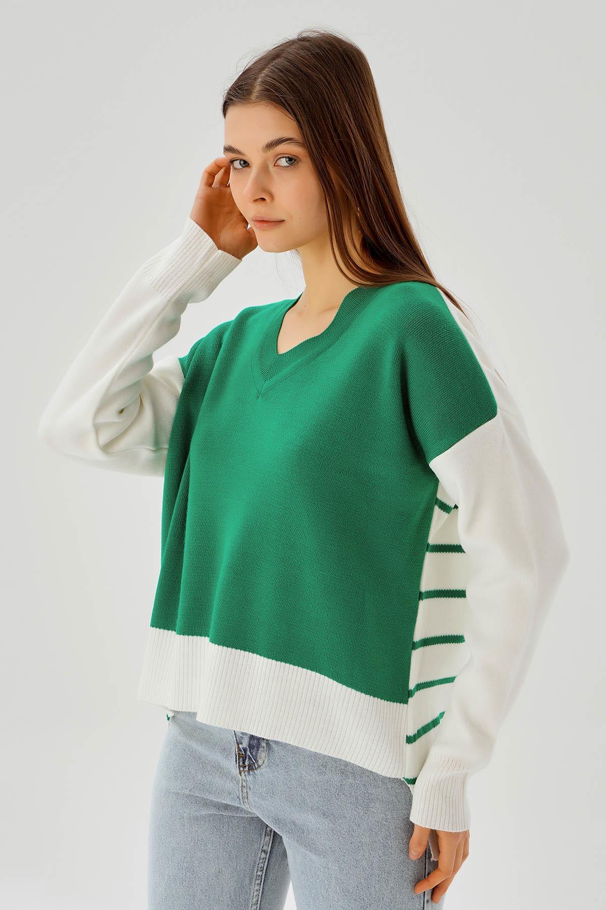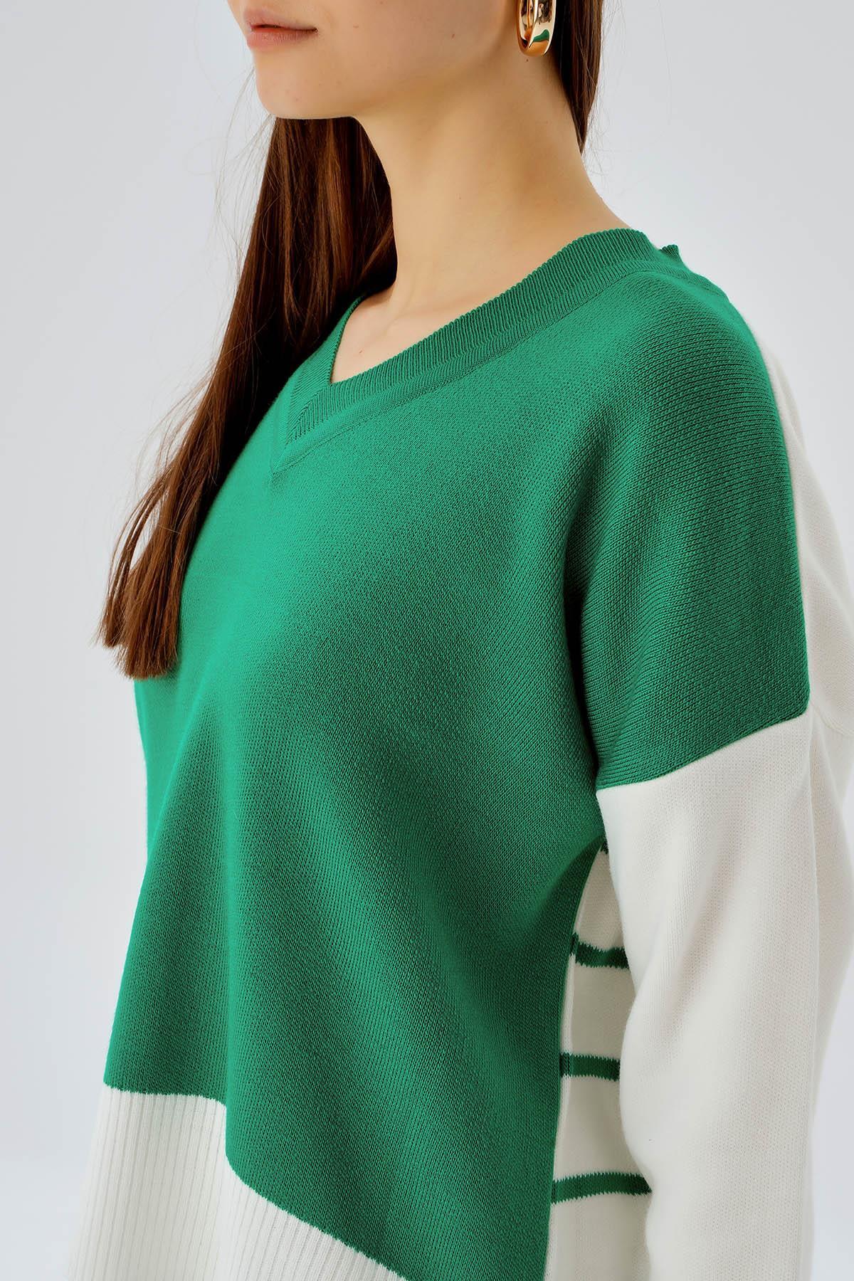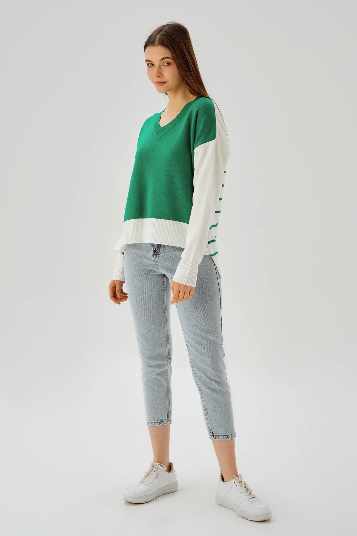 Benetton Yeşili V Yaka Arka Çizgili Kazak 4195