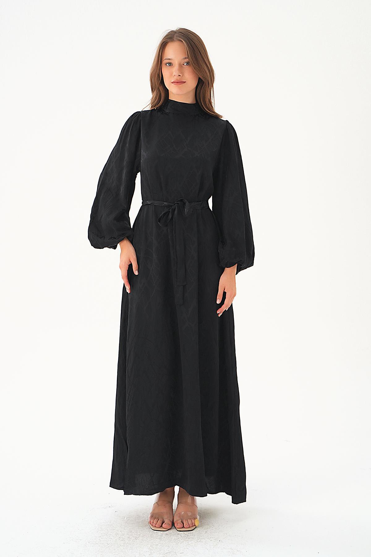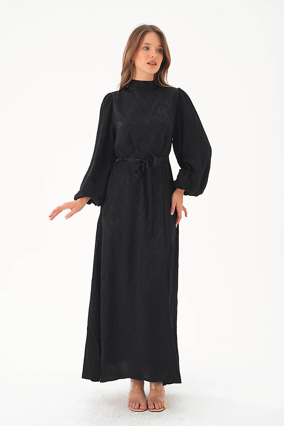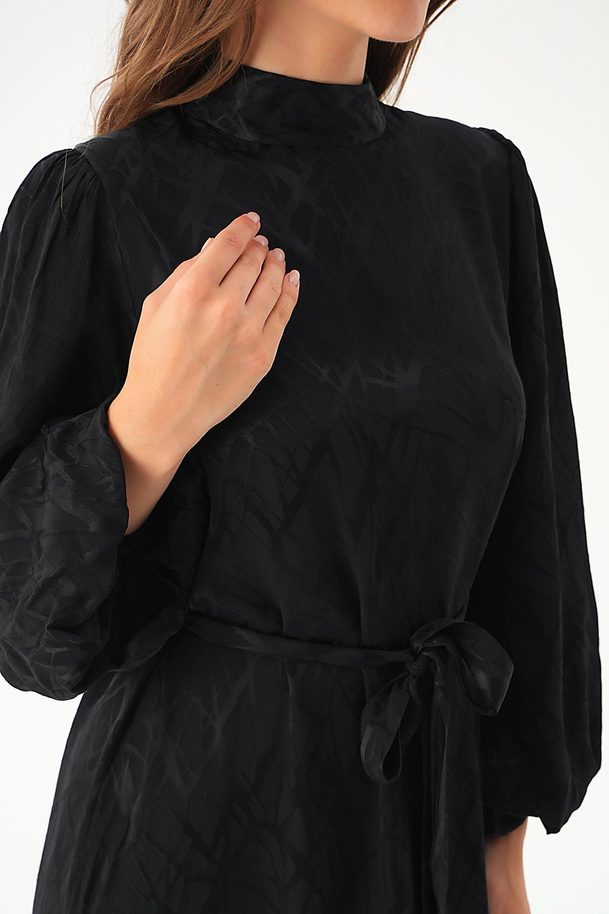 4210A Desenli Kuşak Detay Elbise Siyah