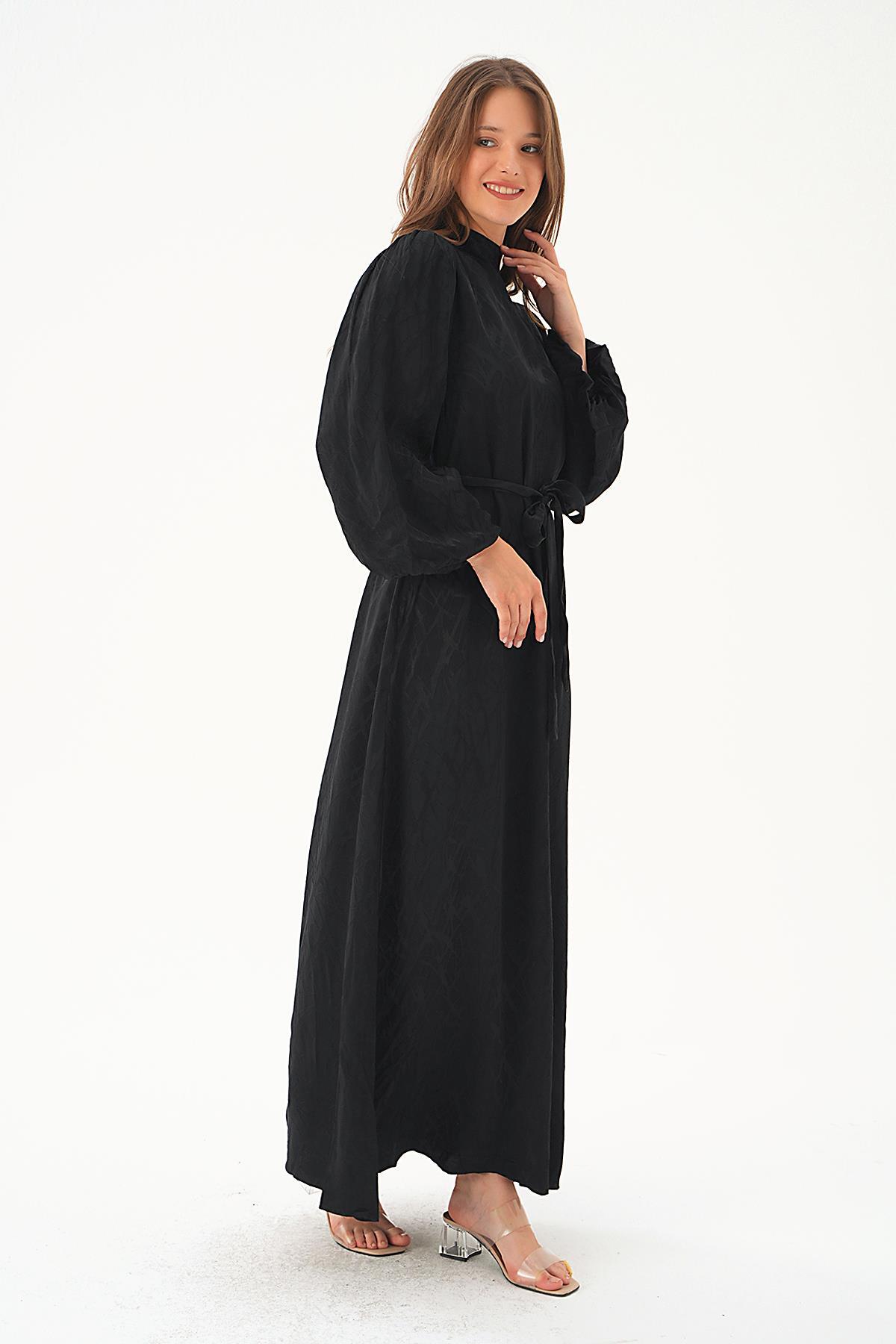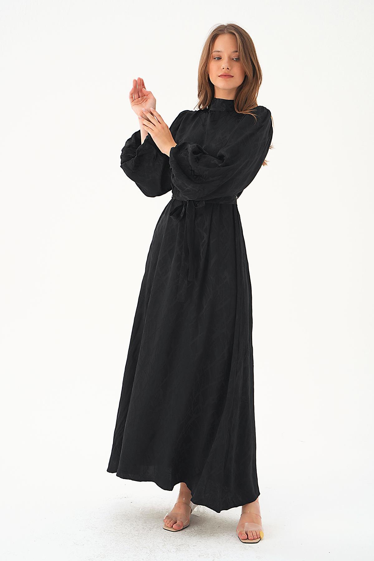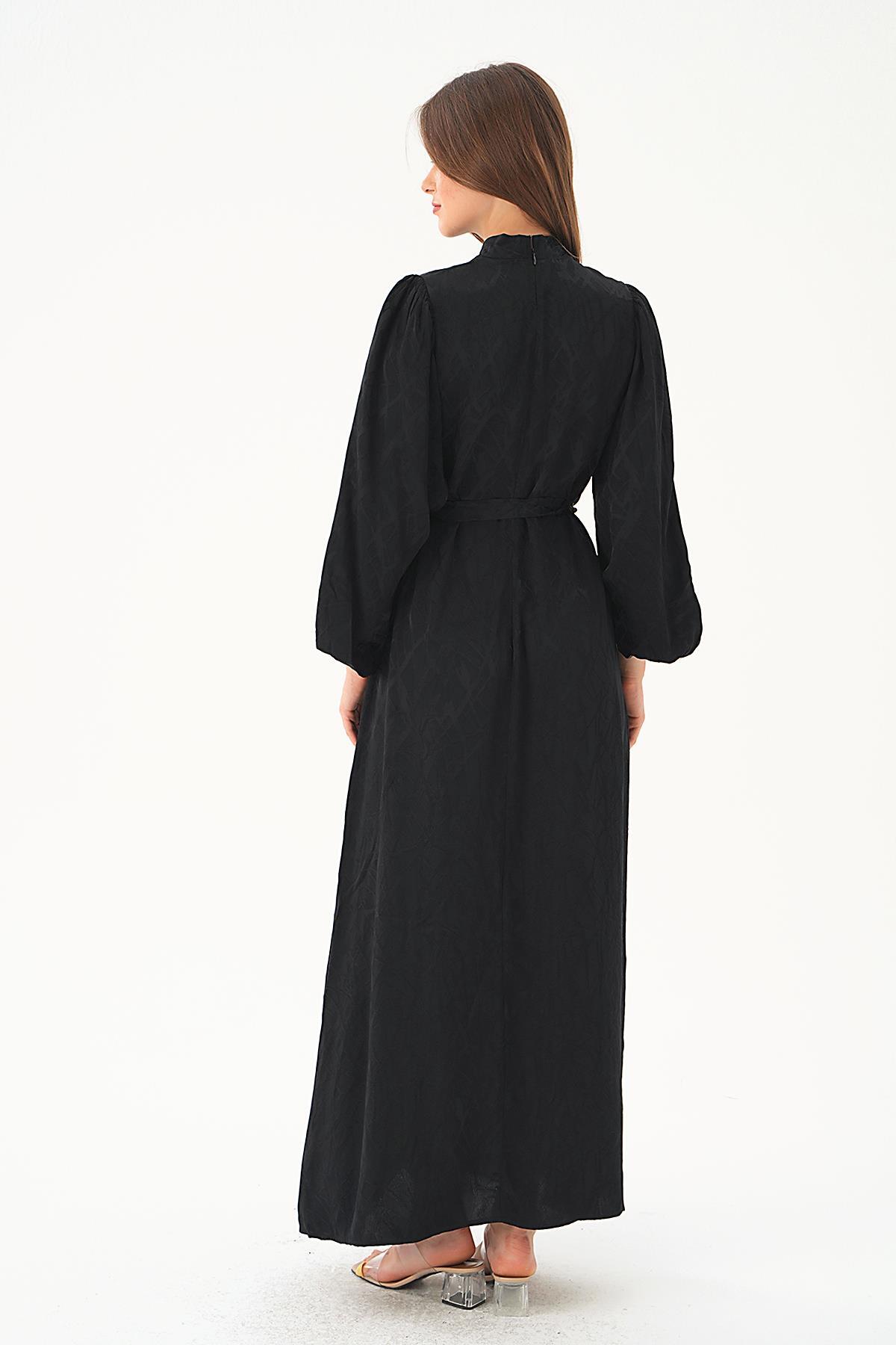 4210A Desenli Kuşak Detay Elbise Siyah
