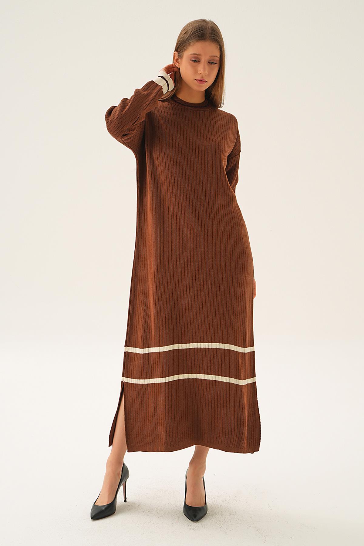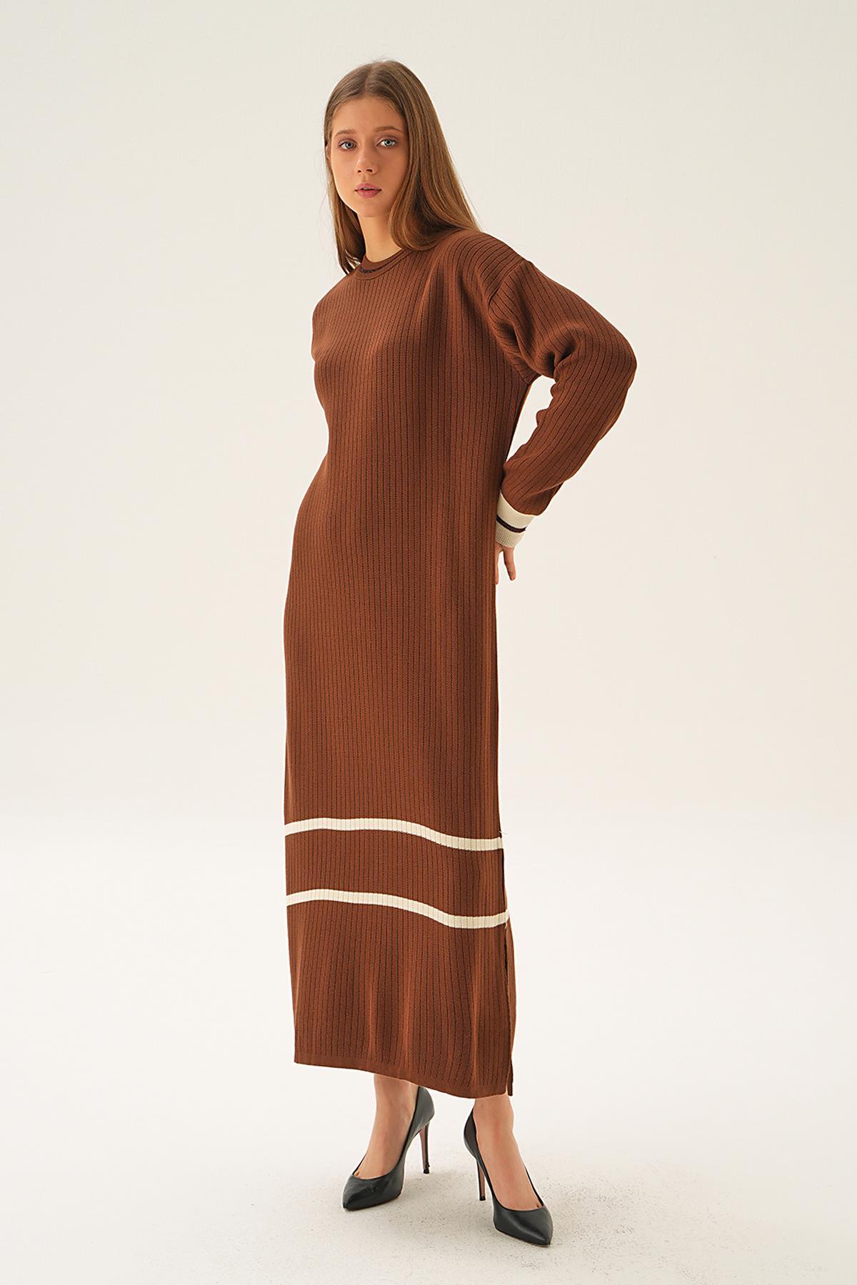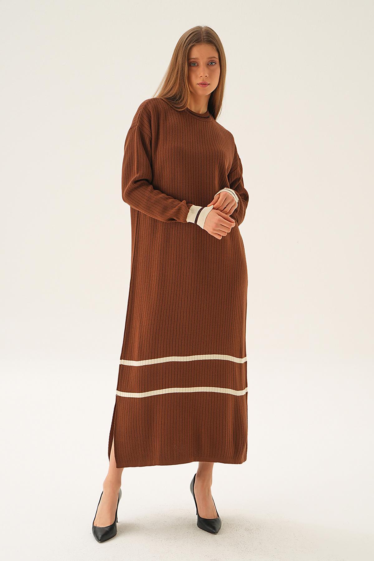 Kahve Çizgi Detay Triko Elbise 4215