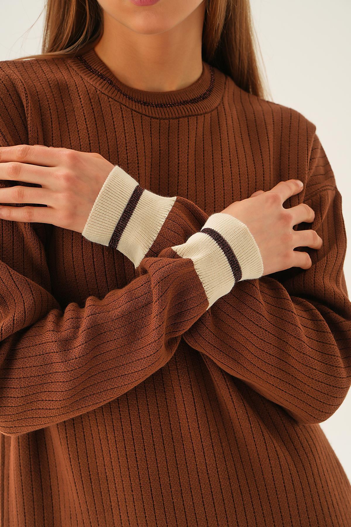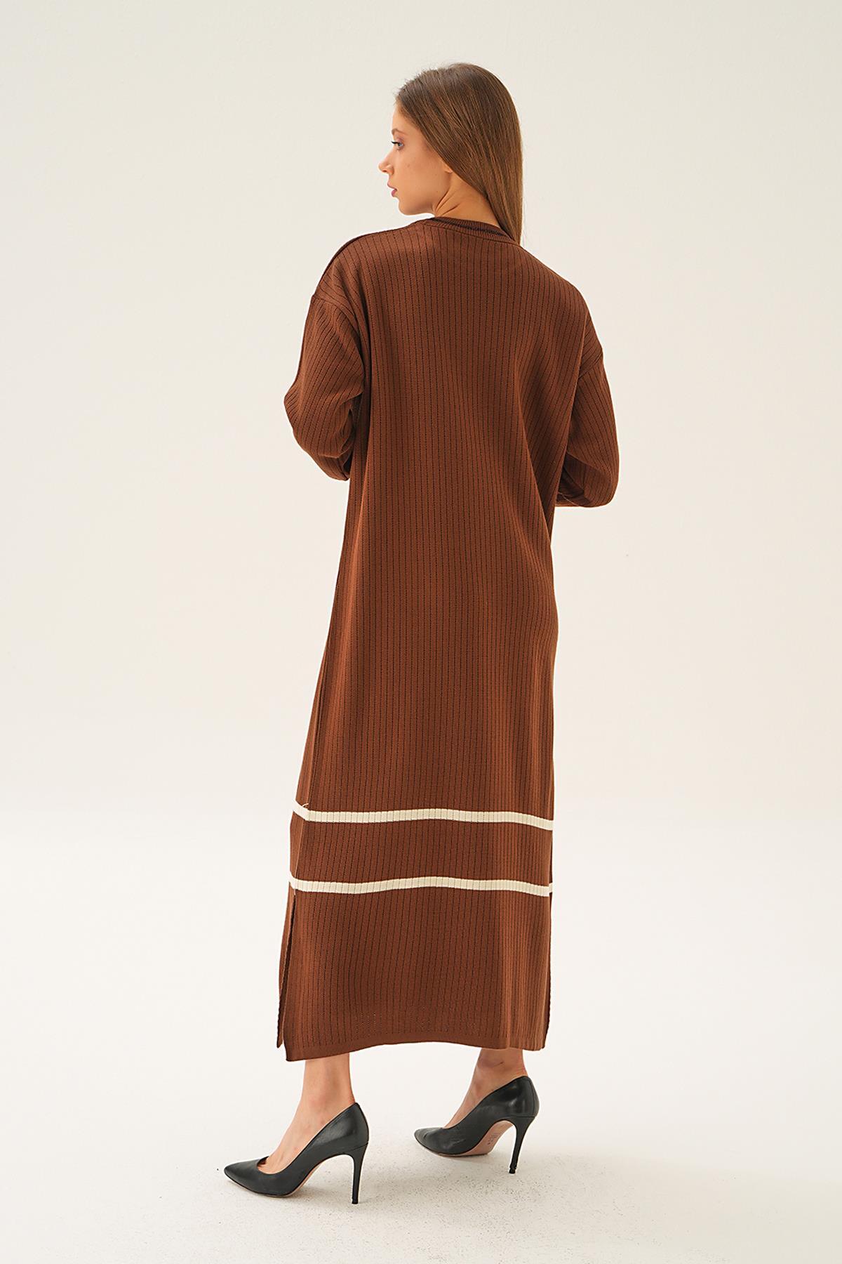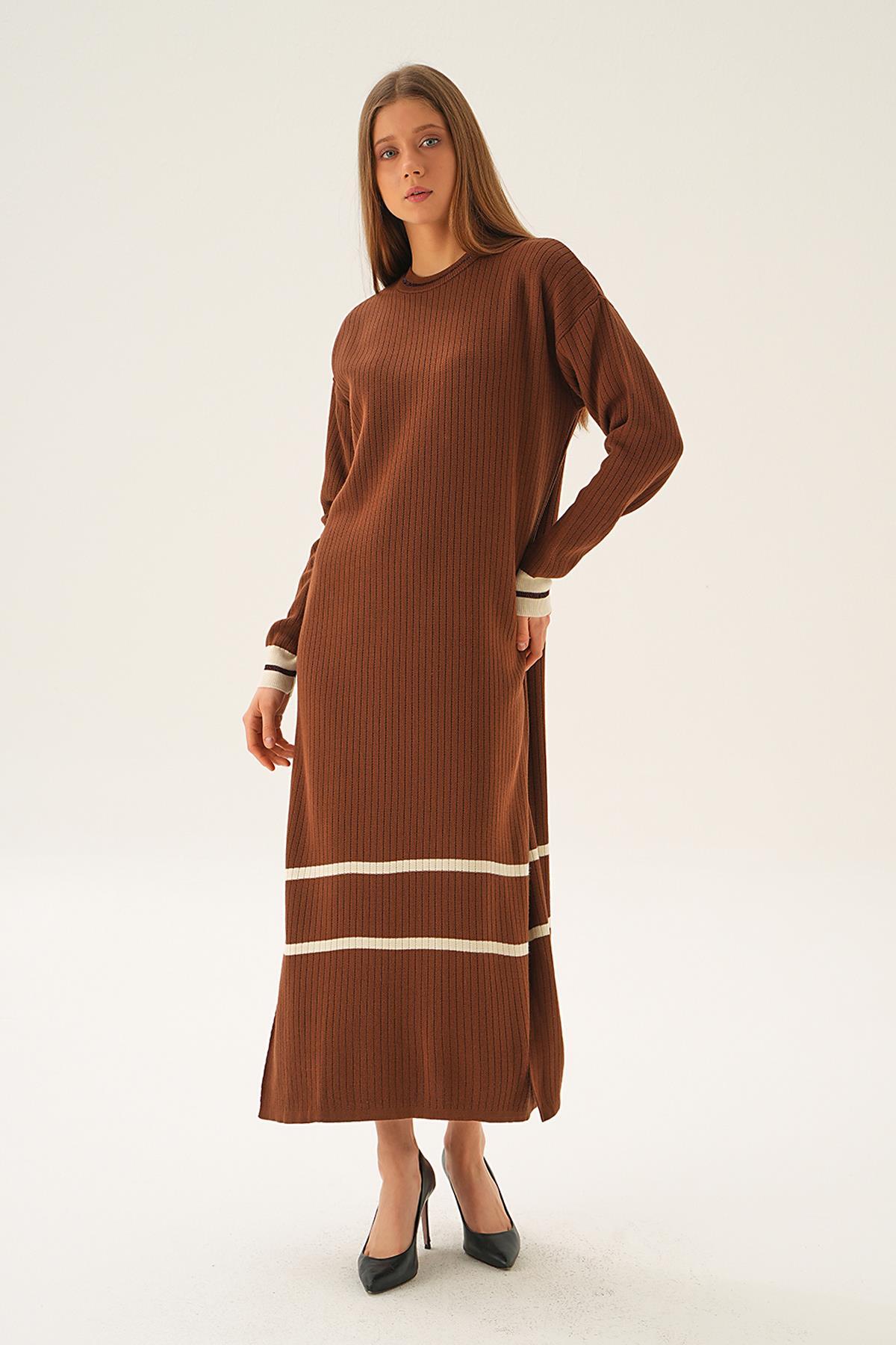 Kahve Çizgi Detay Triko Elbise 4215