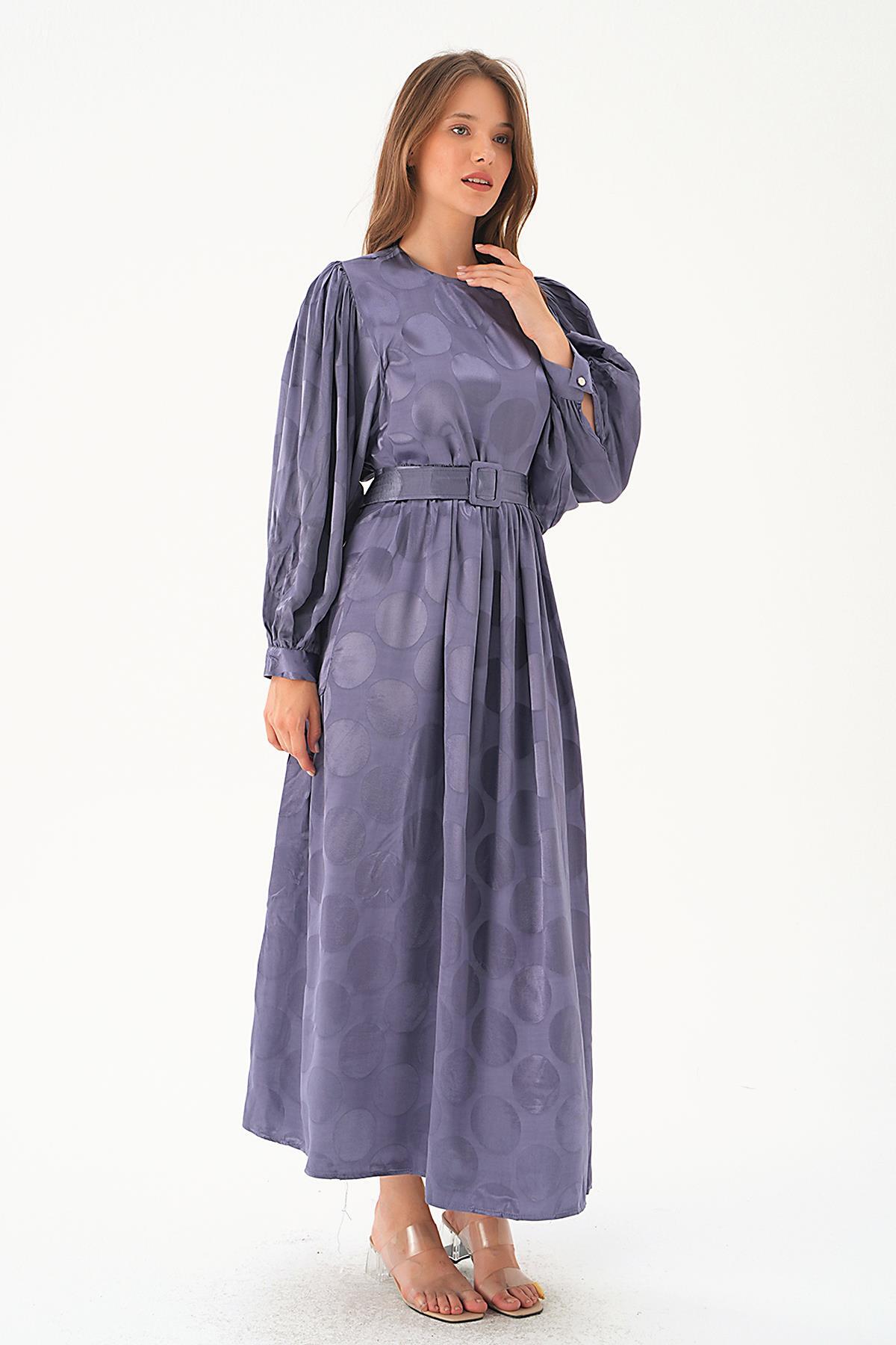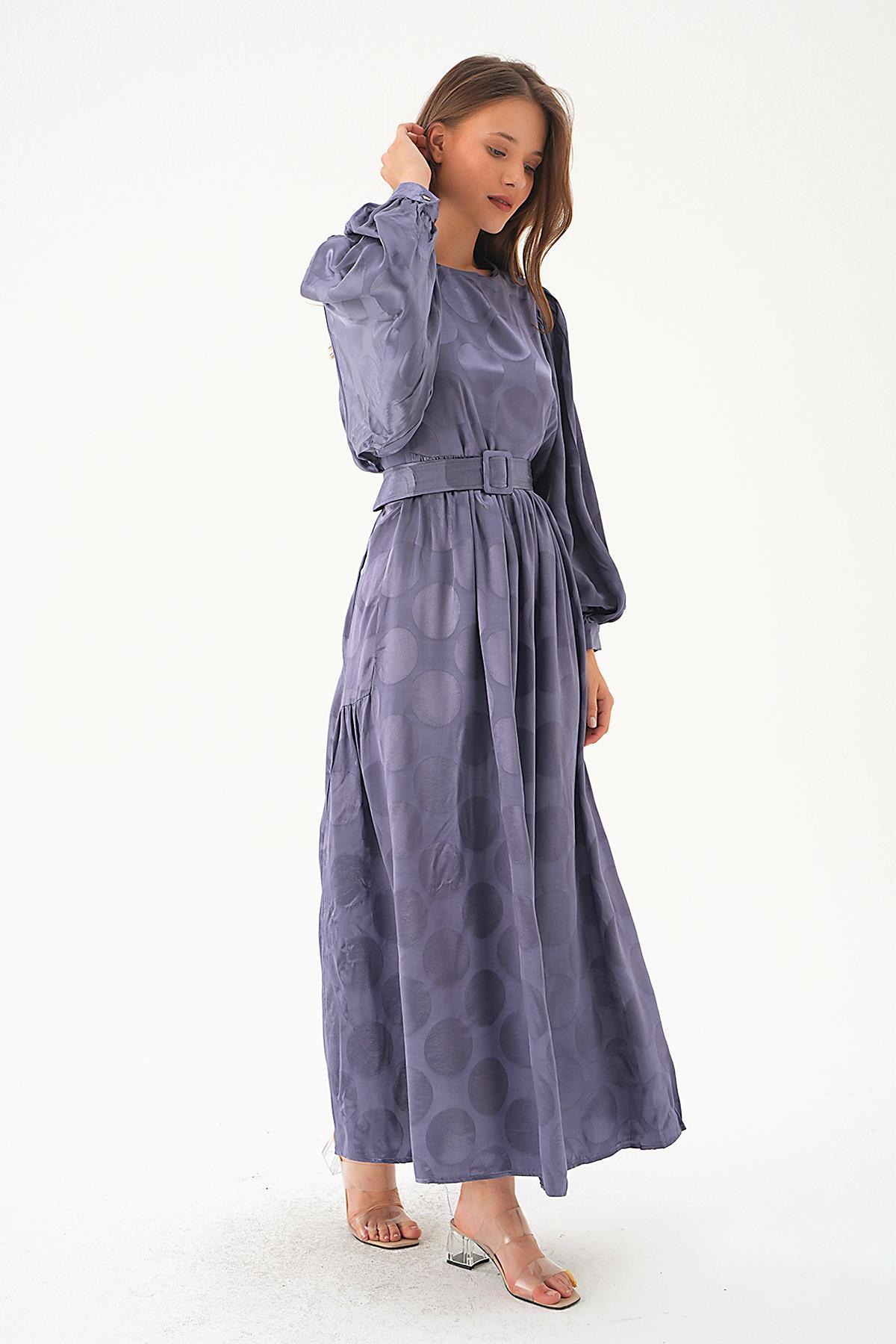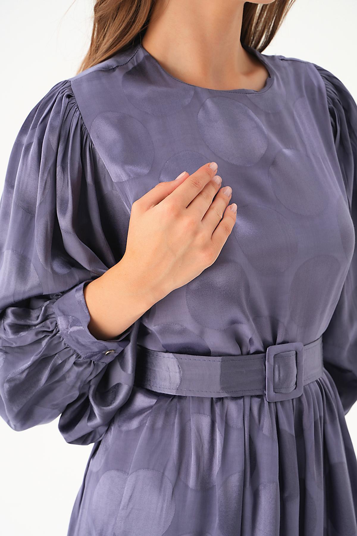 Leylak Puantiye Desen Kemerli Elbise 4215A
