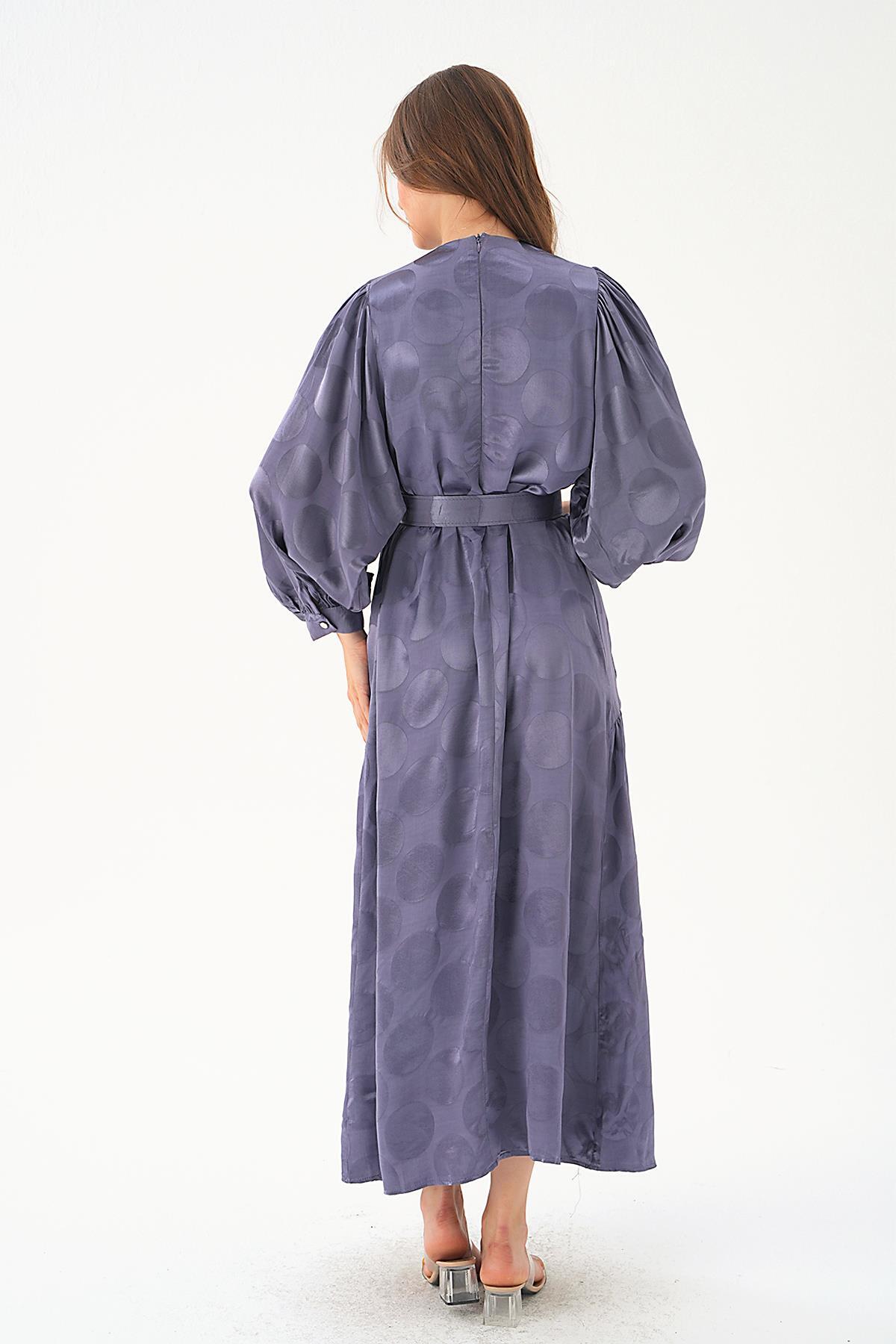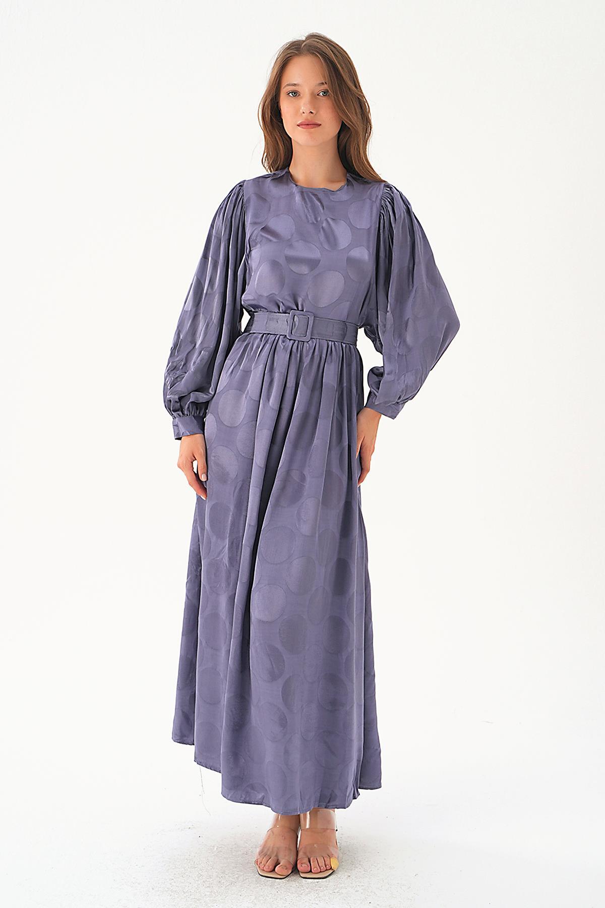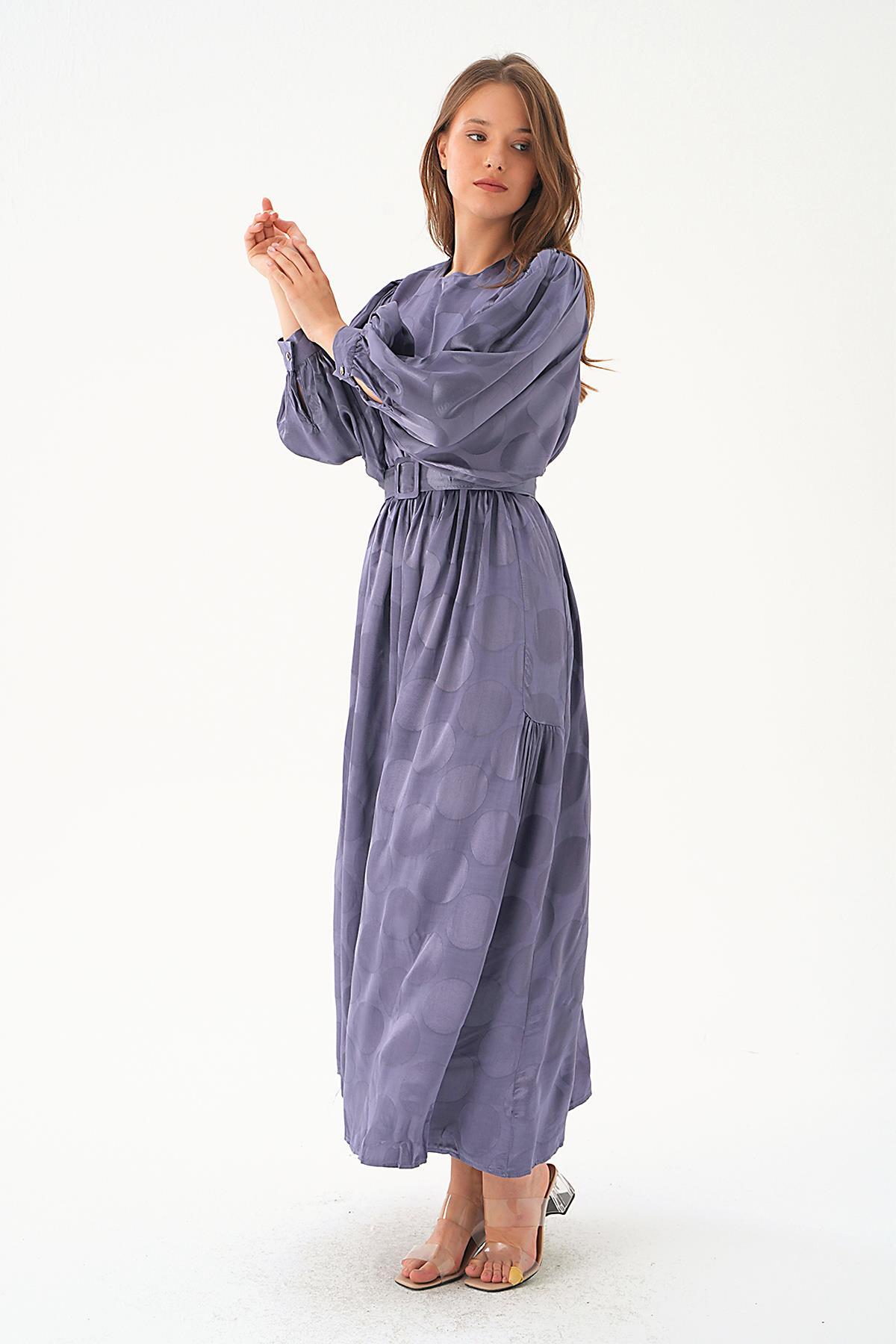 Leylak Puantiye Desen Kemerli Elbise 4215A