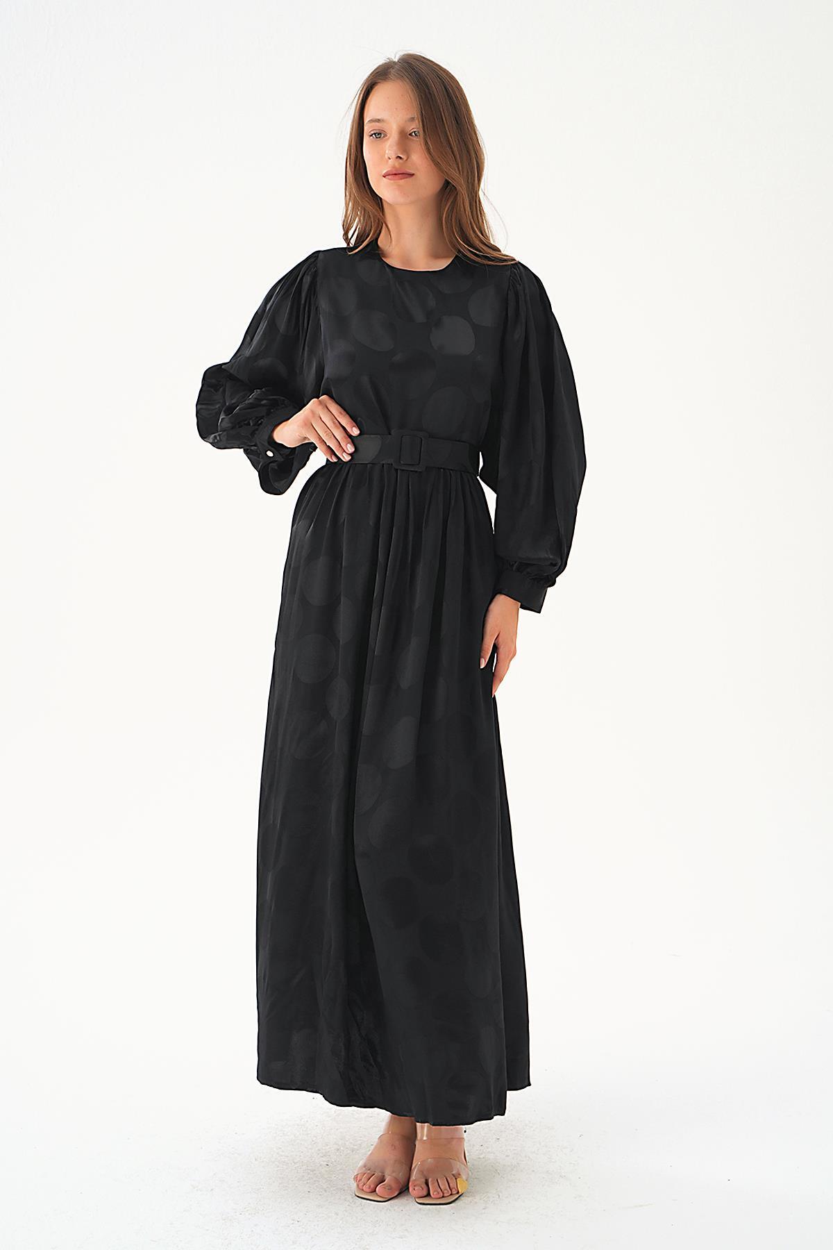 4215A Puantiye Desen Kemerli Elbise Siyah