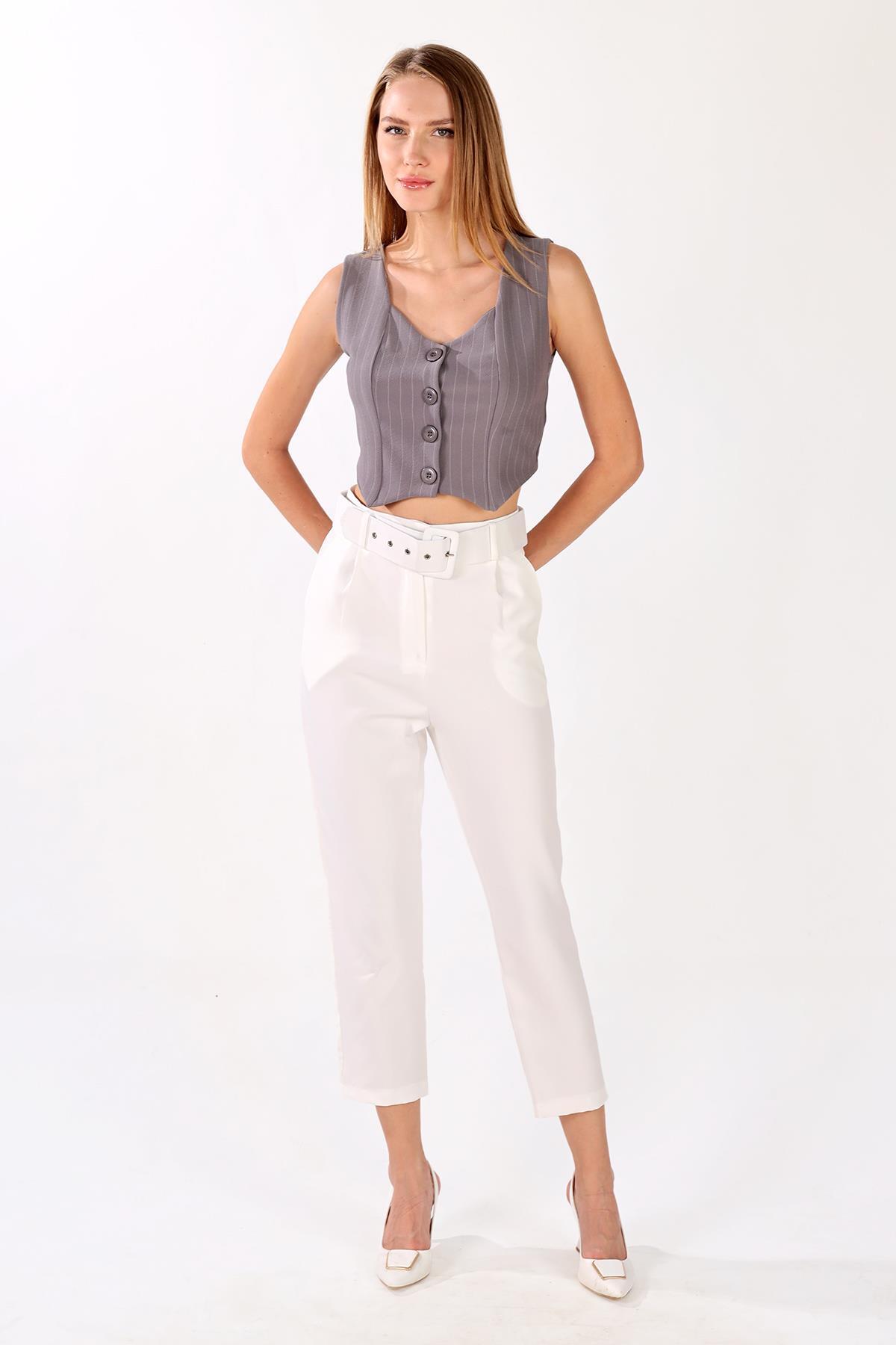 4288A Pens Detay Çizgili Yelek Gri