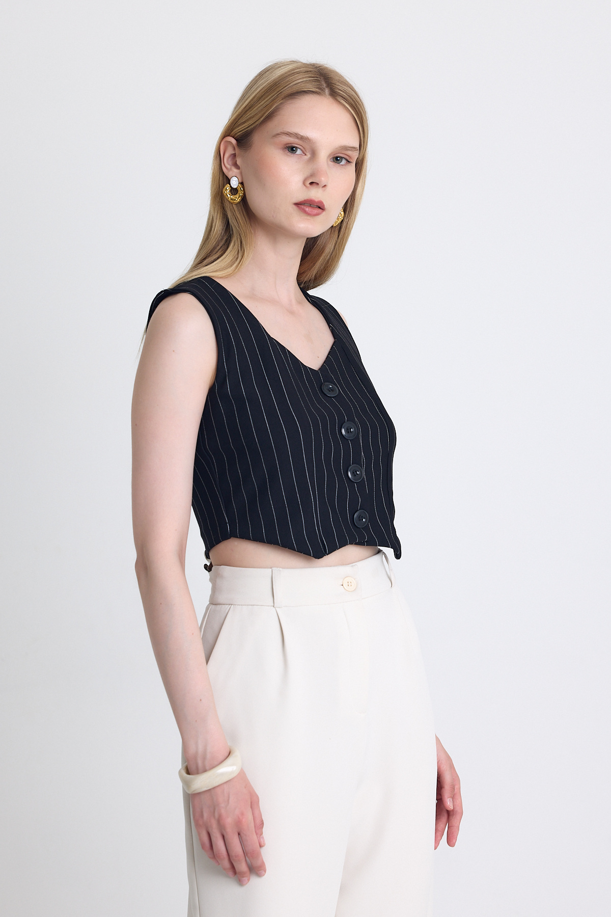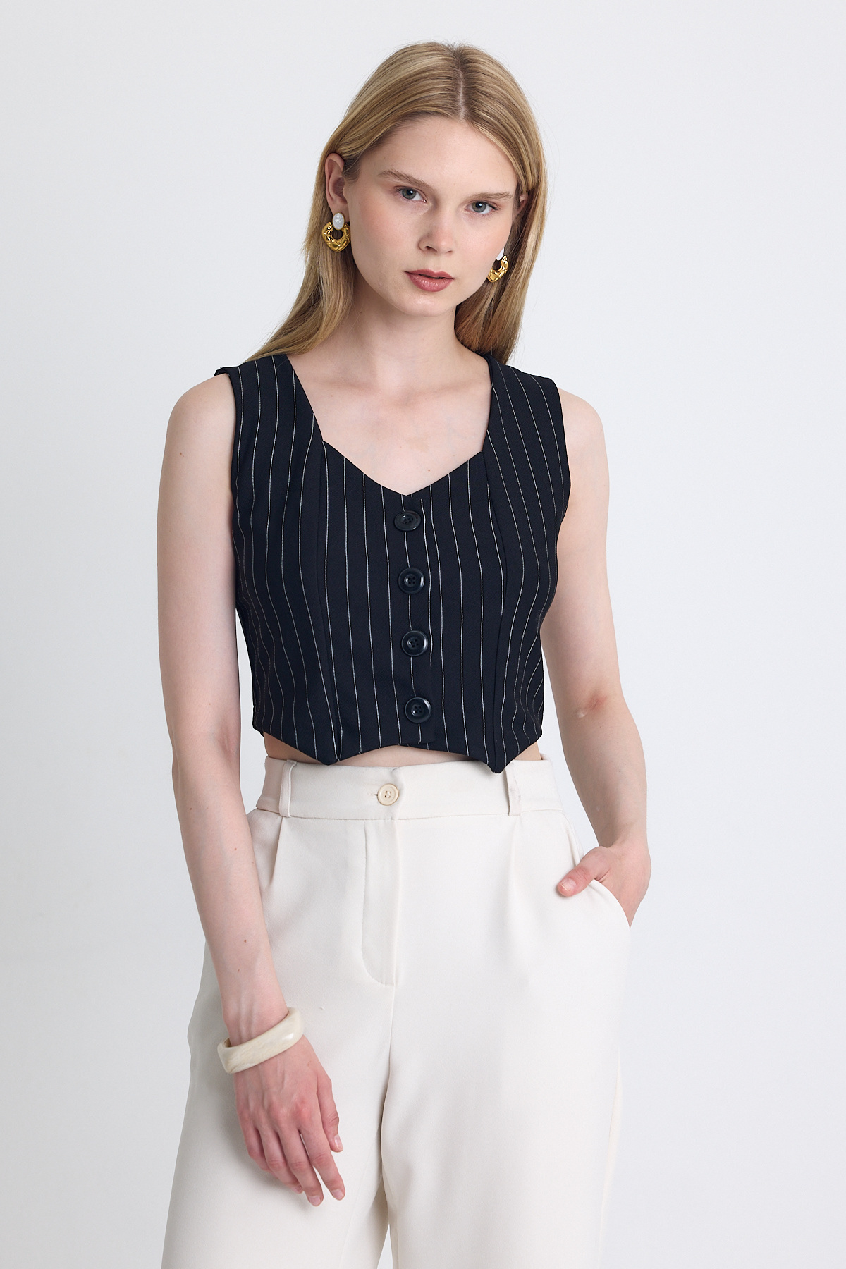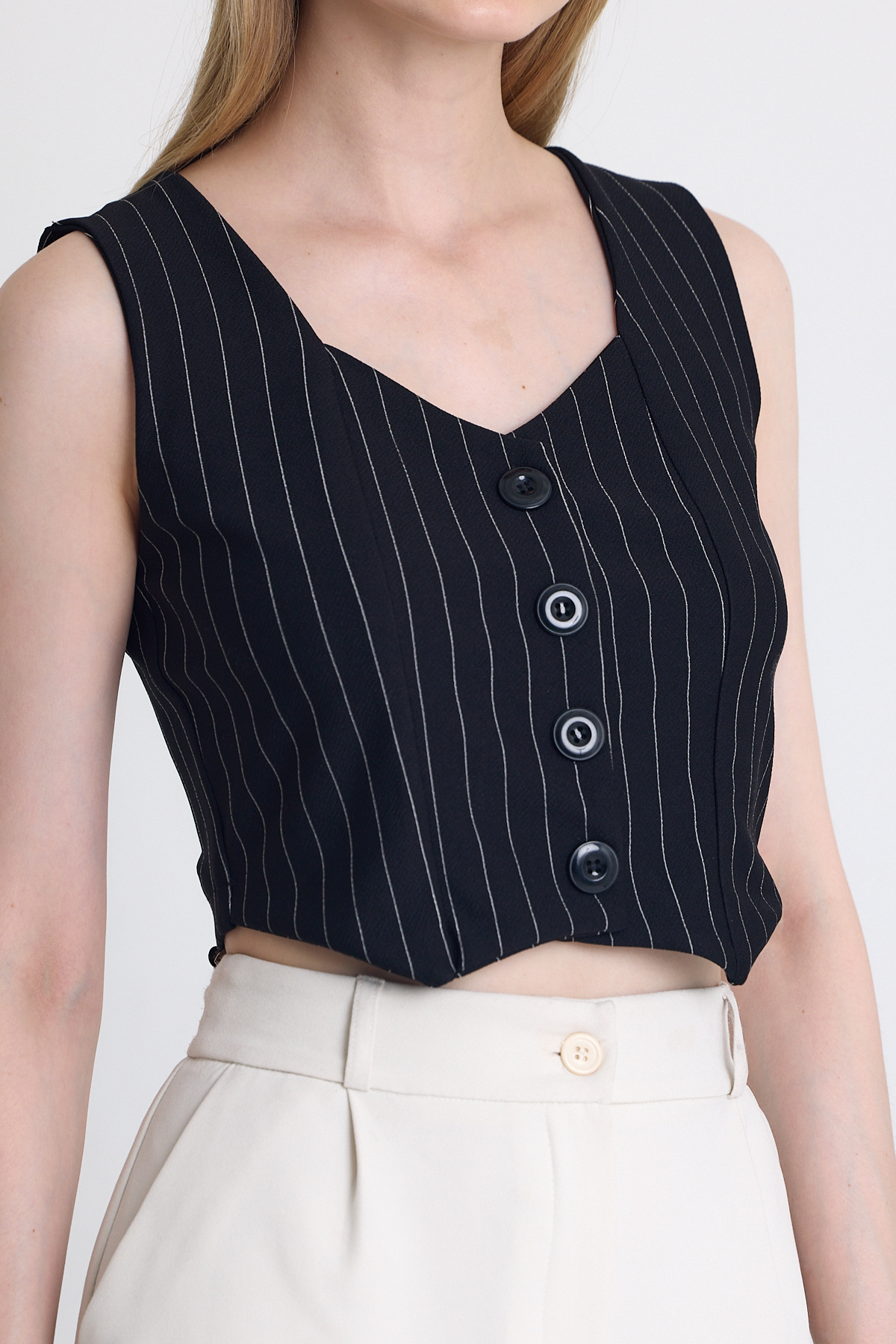 Siyah Çizgili V Yaka Pens Detaylı Düğmeli Crop Yelek 4288A