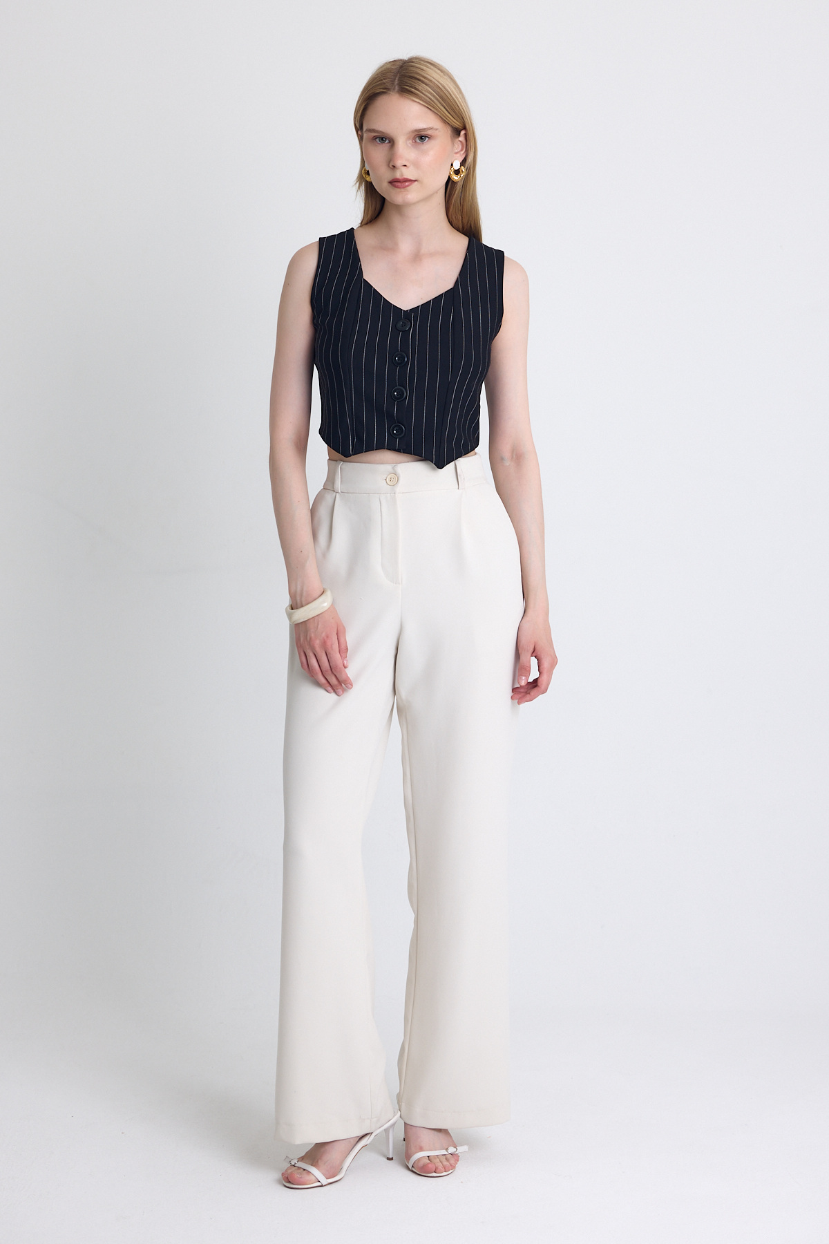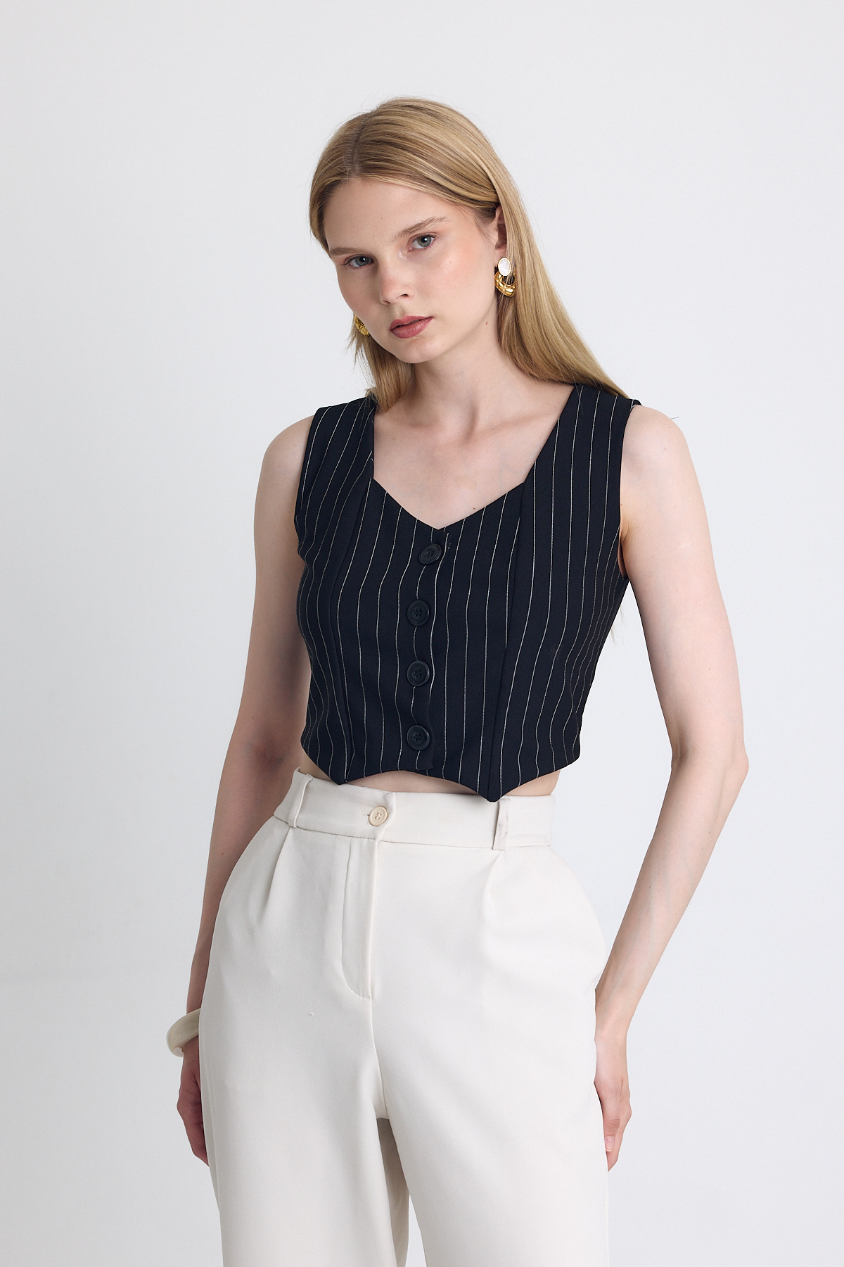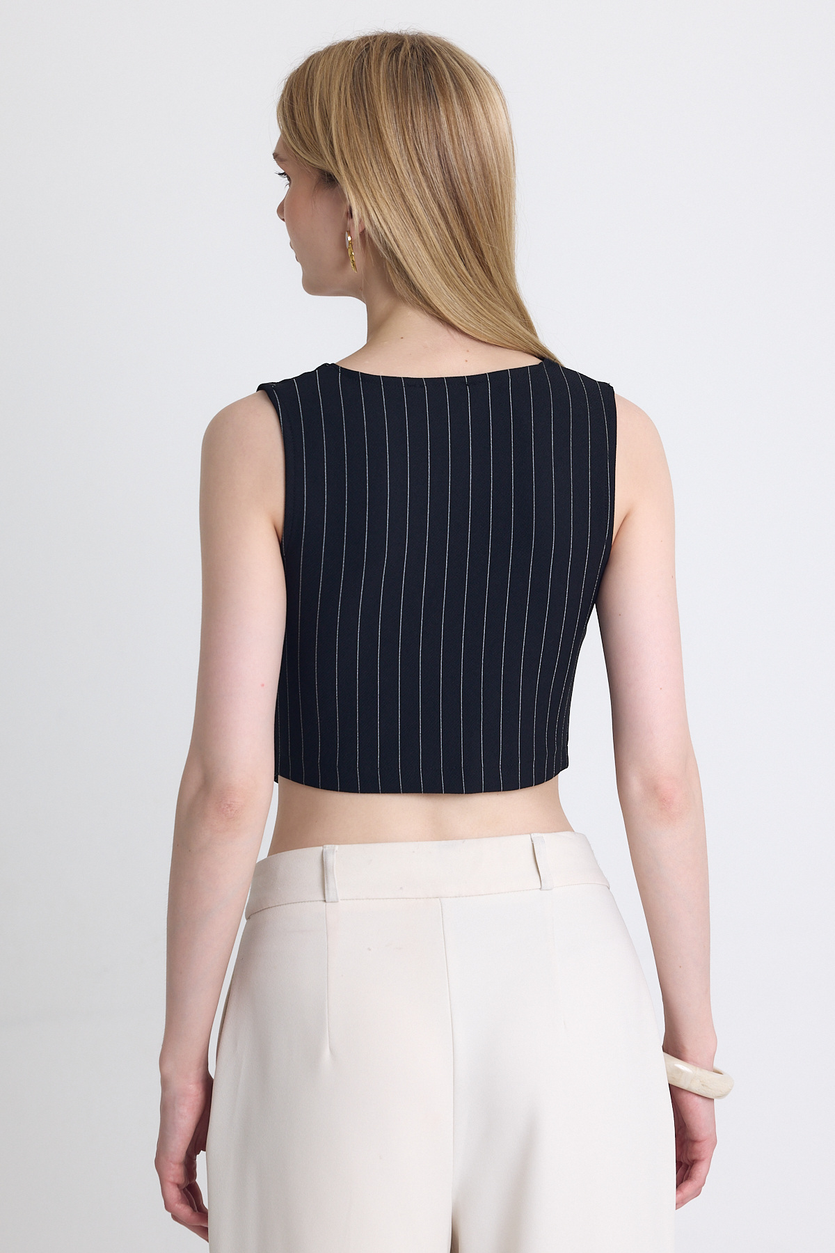 Siyah Çizgili V Yaka Pens Detaylı Düğmeli Crop Yelek 4288A