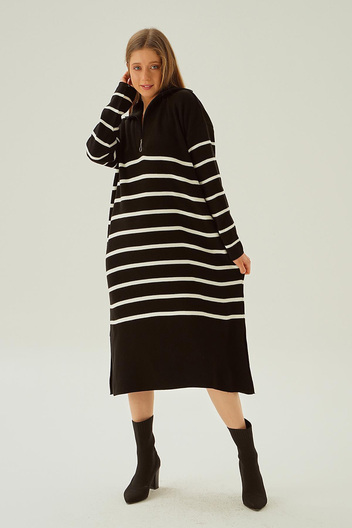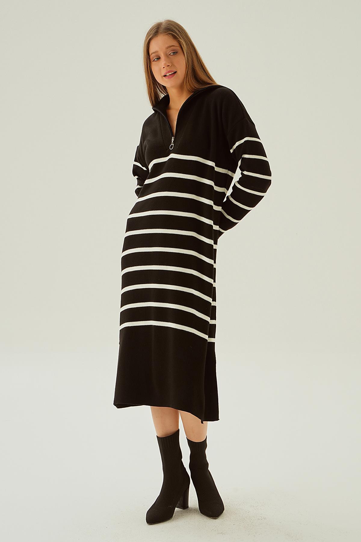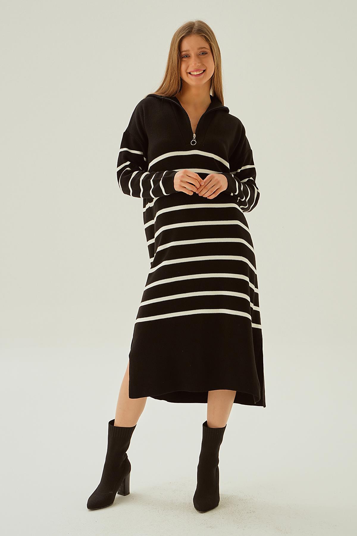 Siyah Çizgili Fermuarlı Elbise 4310