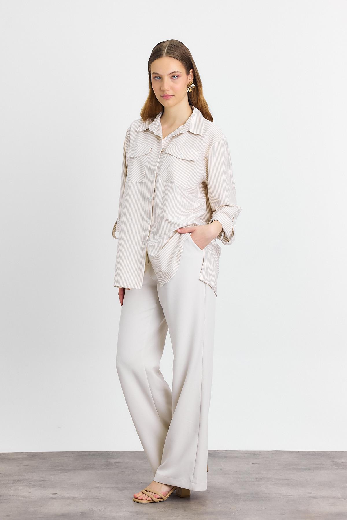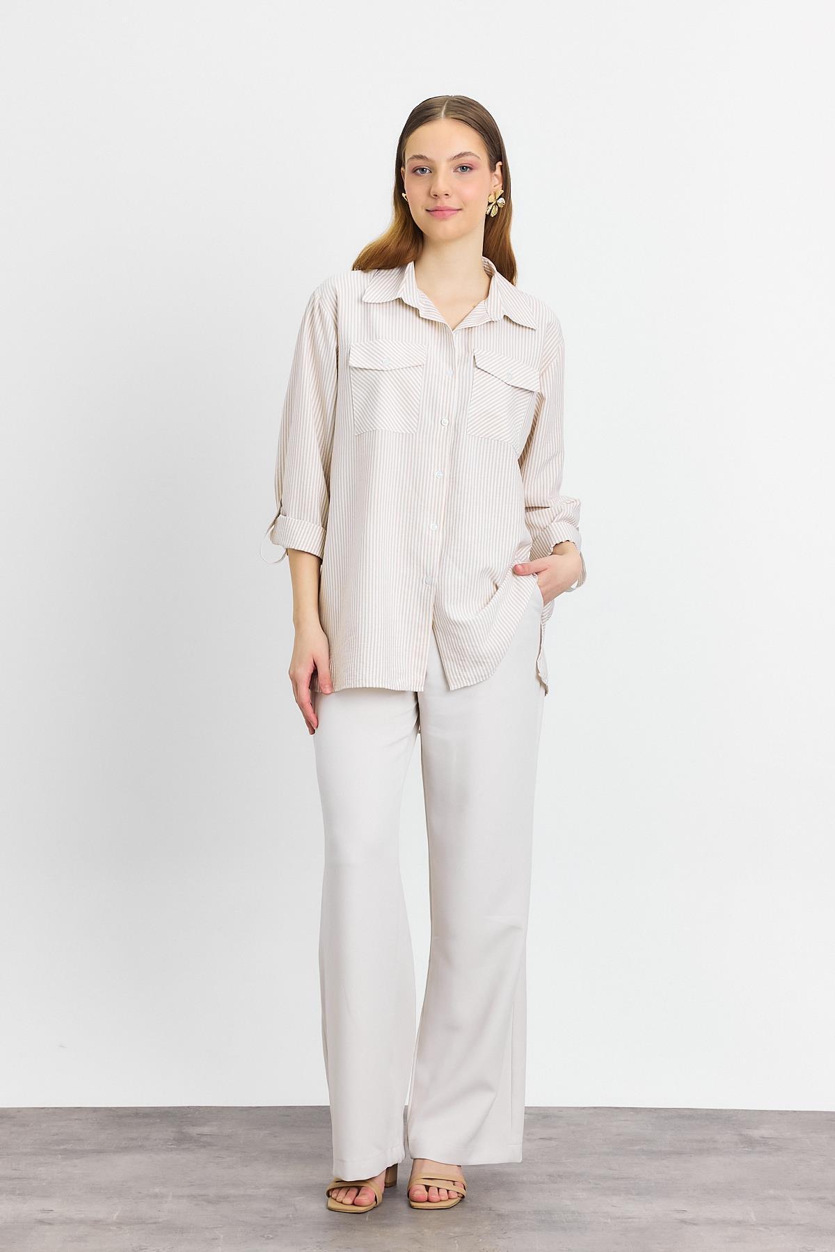 Bej Çizgili Çift Cepli Gömlek 4362A