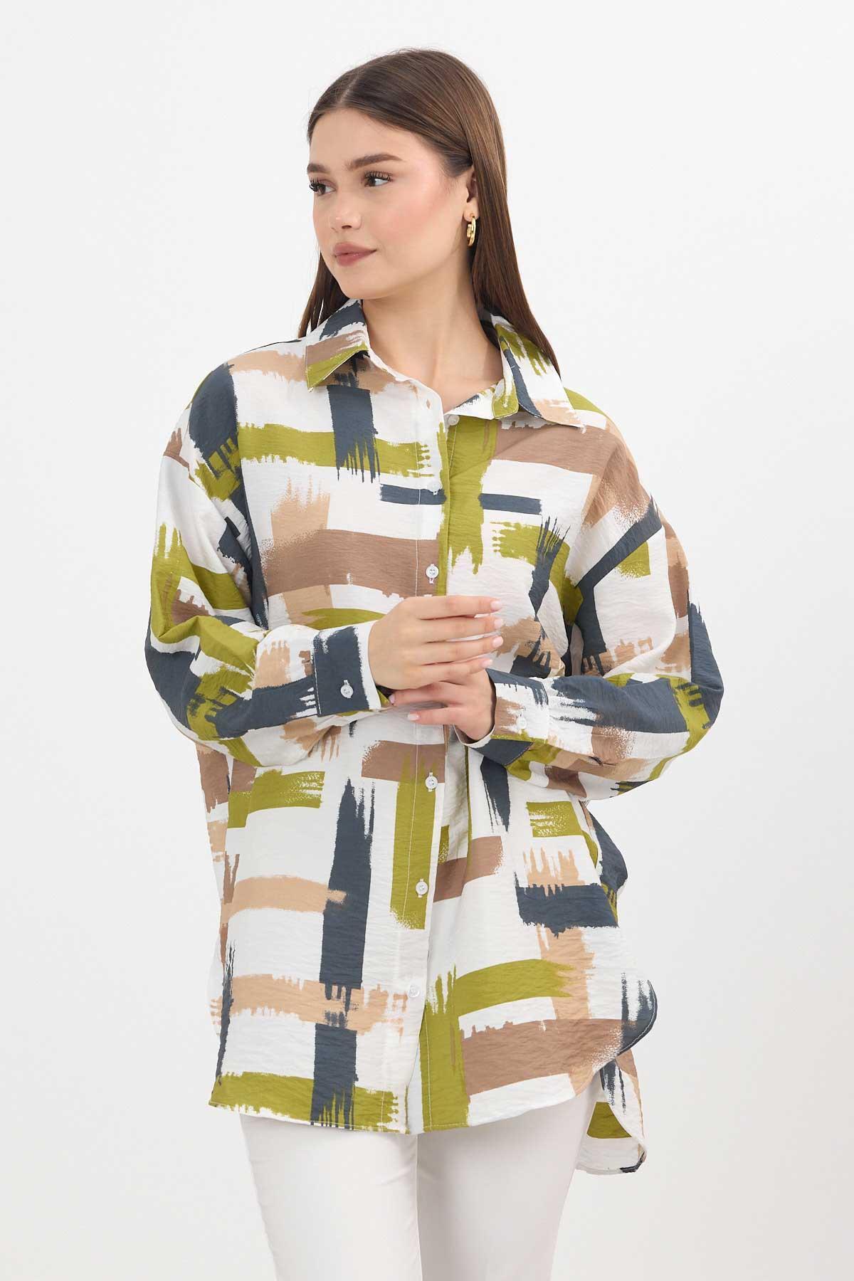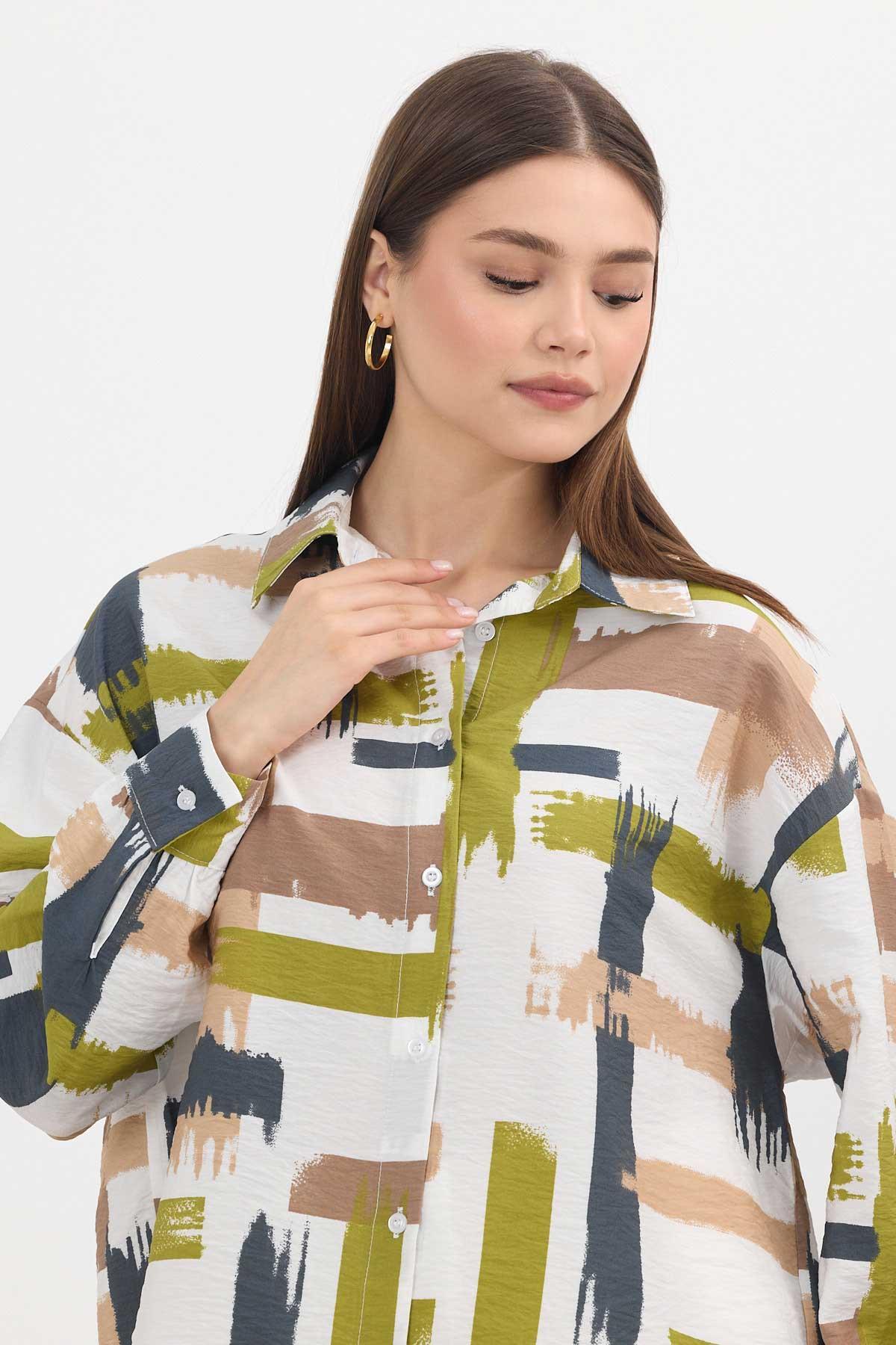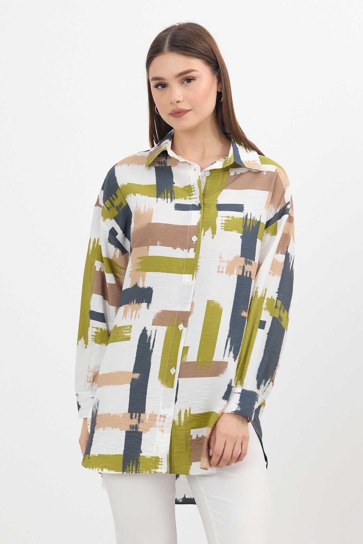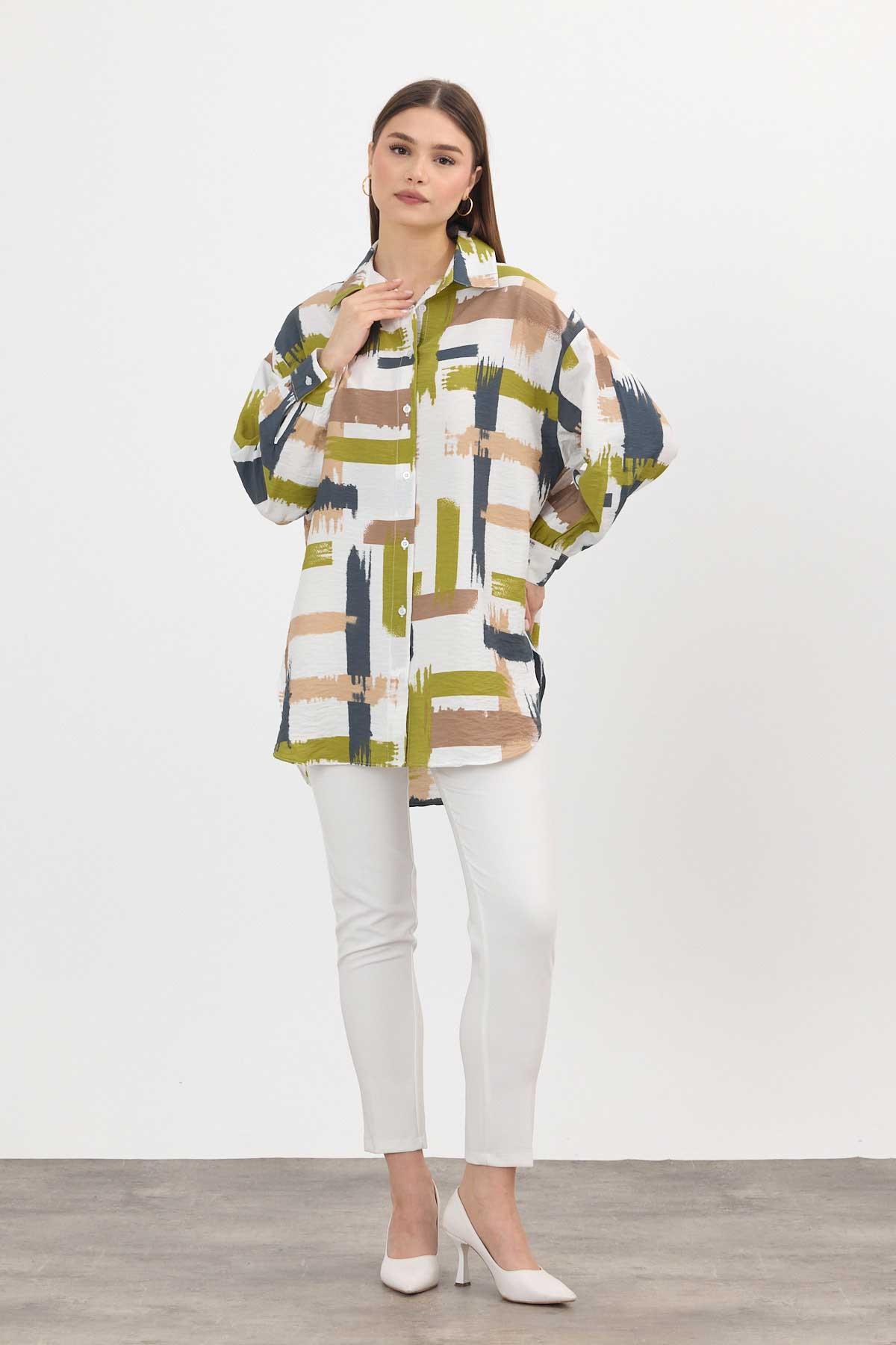 Olive Yeşili Desenli Uzun Gömlek 4369A
