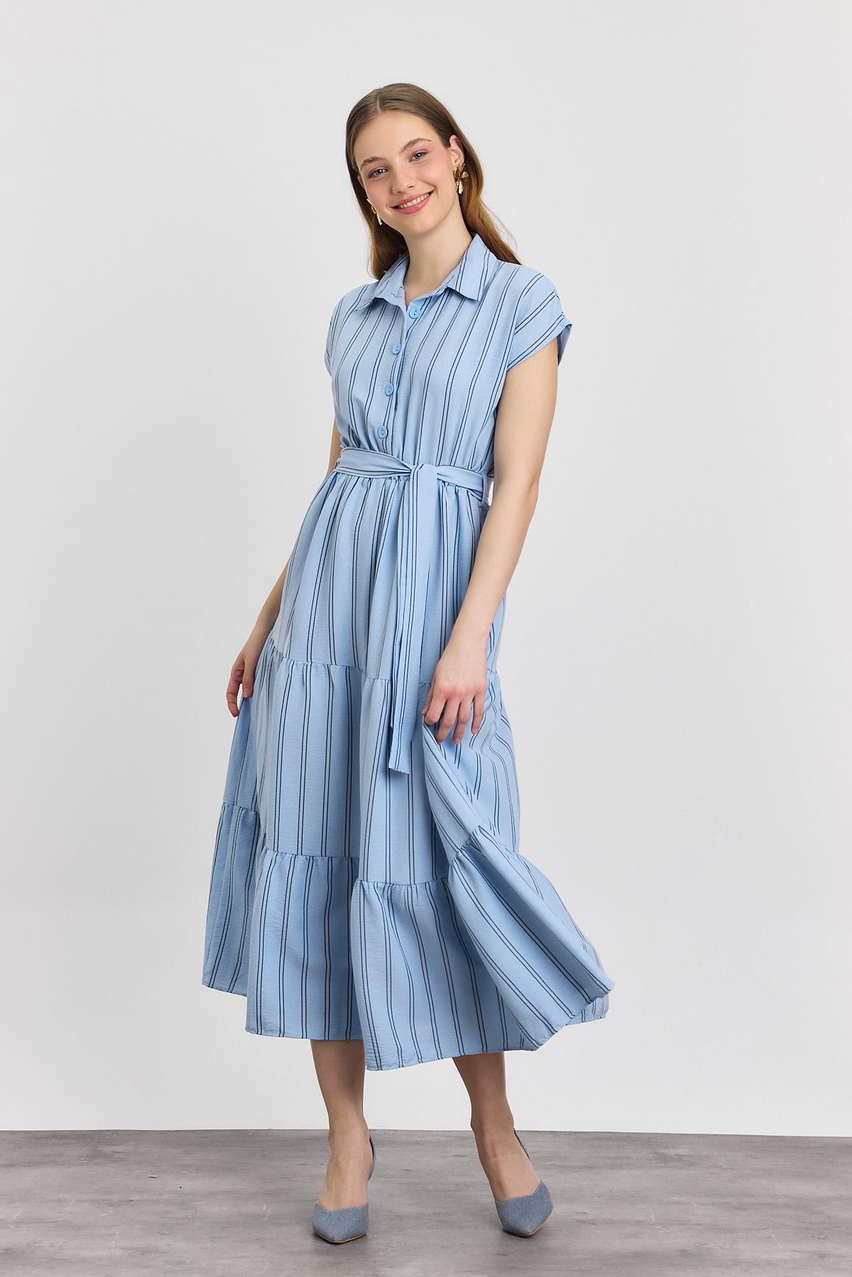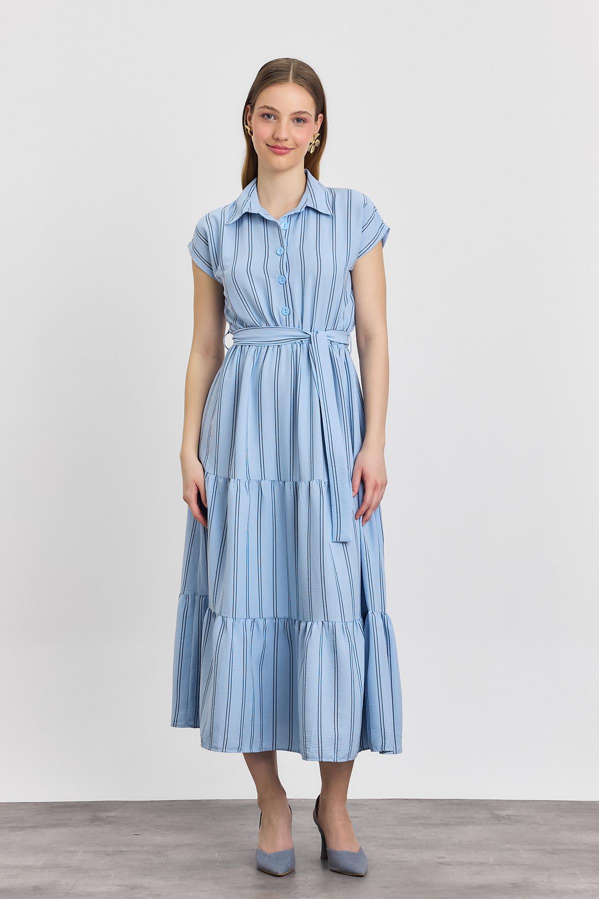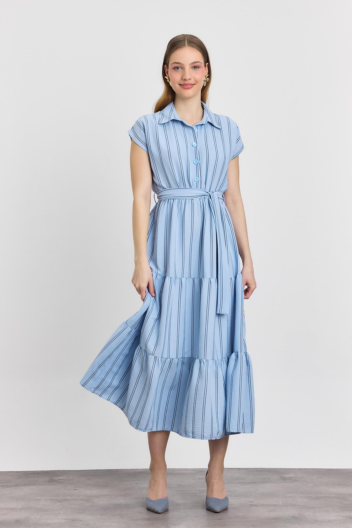 Mavi Çizgili Bel Bağlamalı Uzun Elbise 4443A