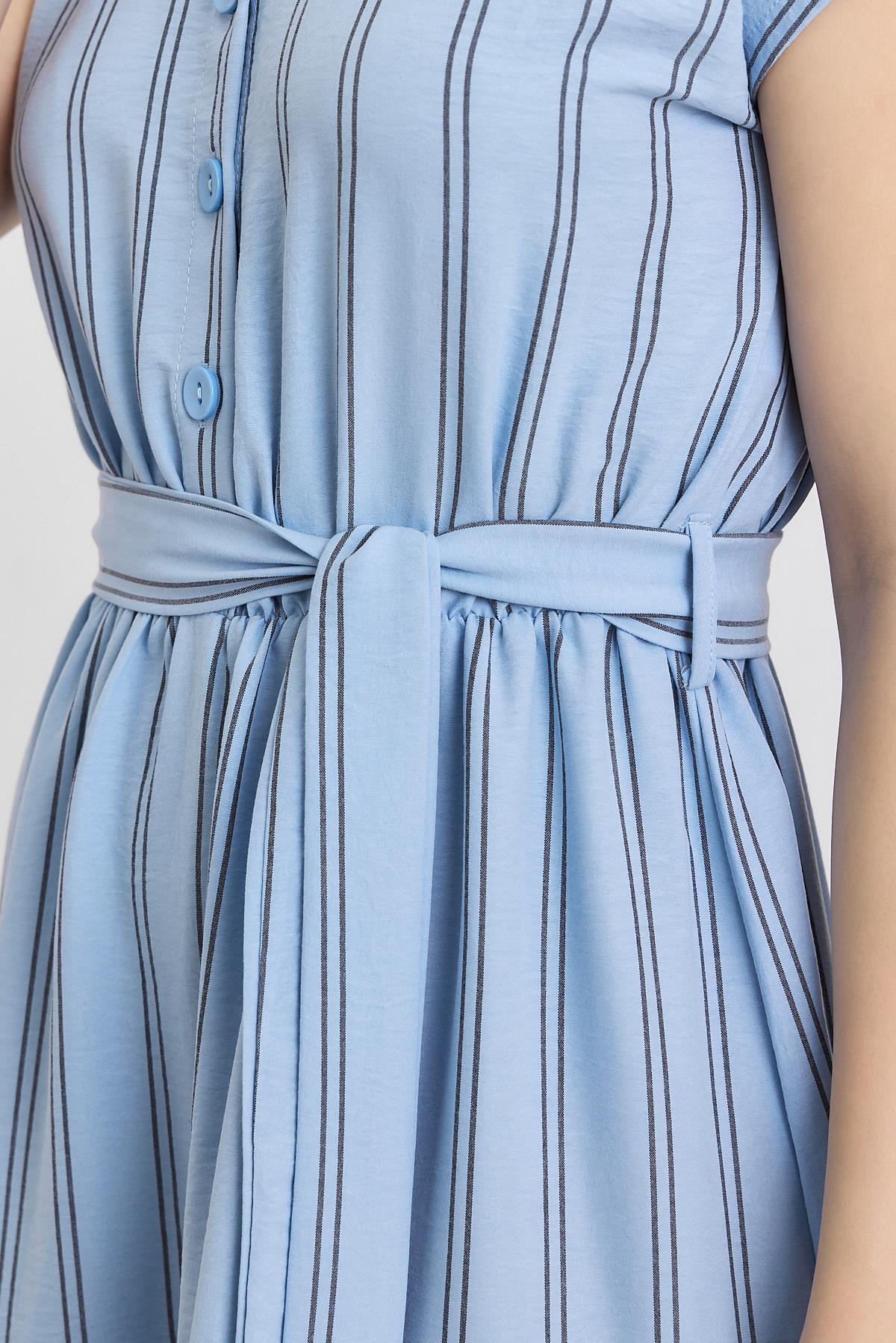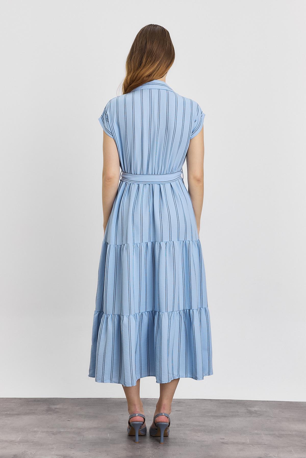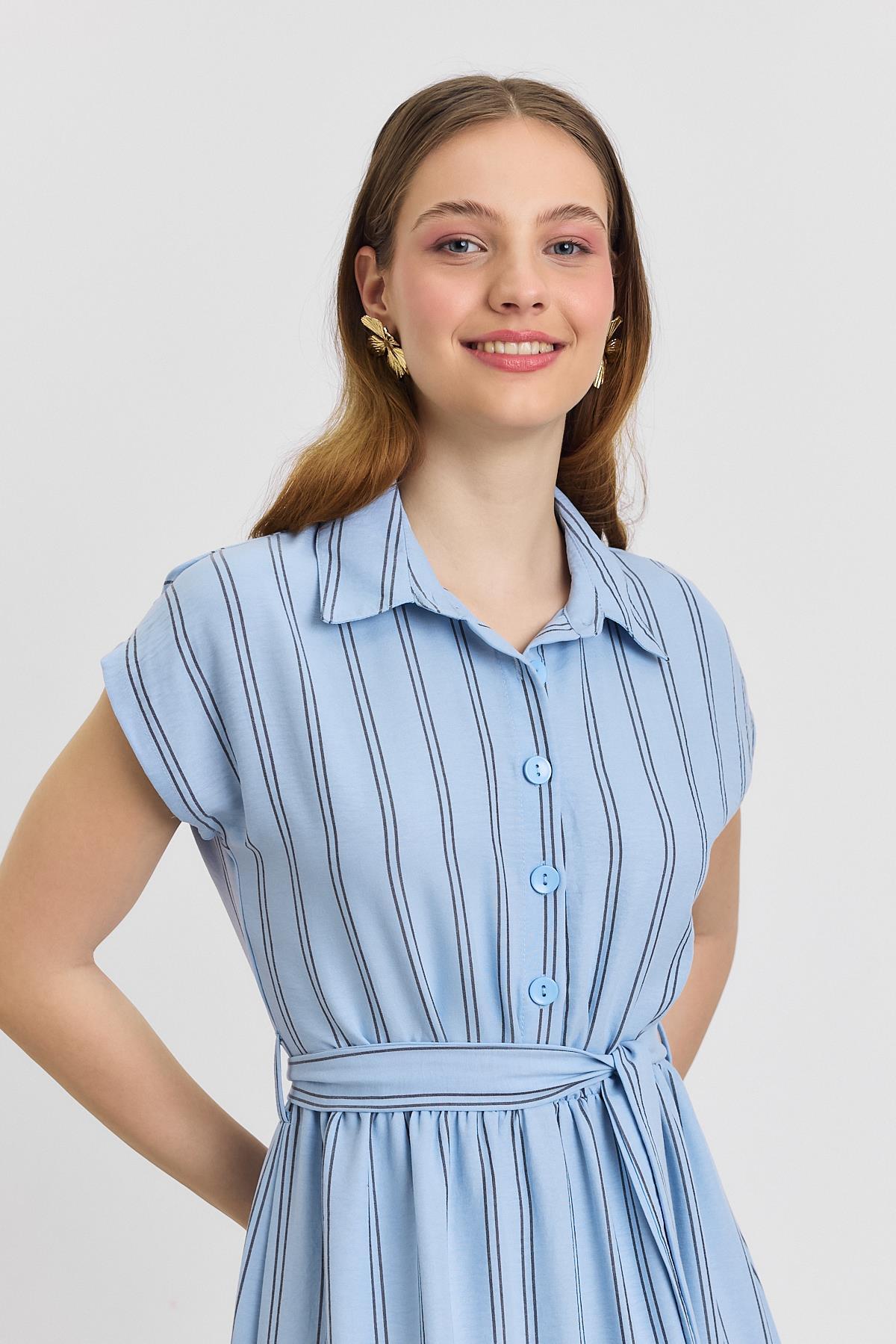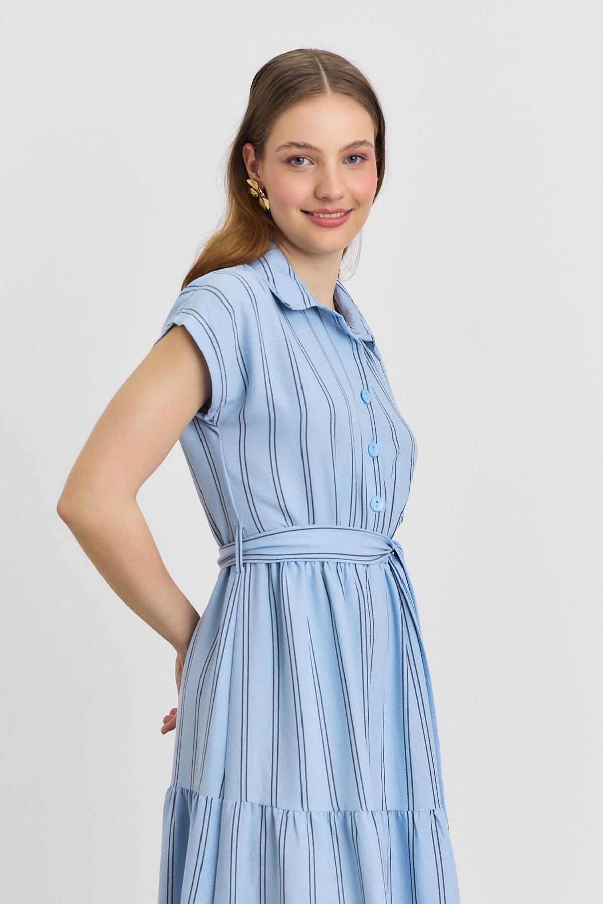 Mavi Çizgili Bel Bağlamalı Uzun Elbise 4443A