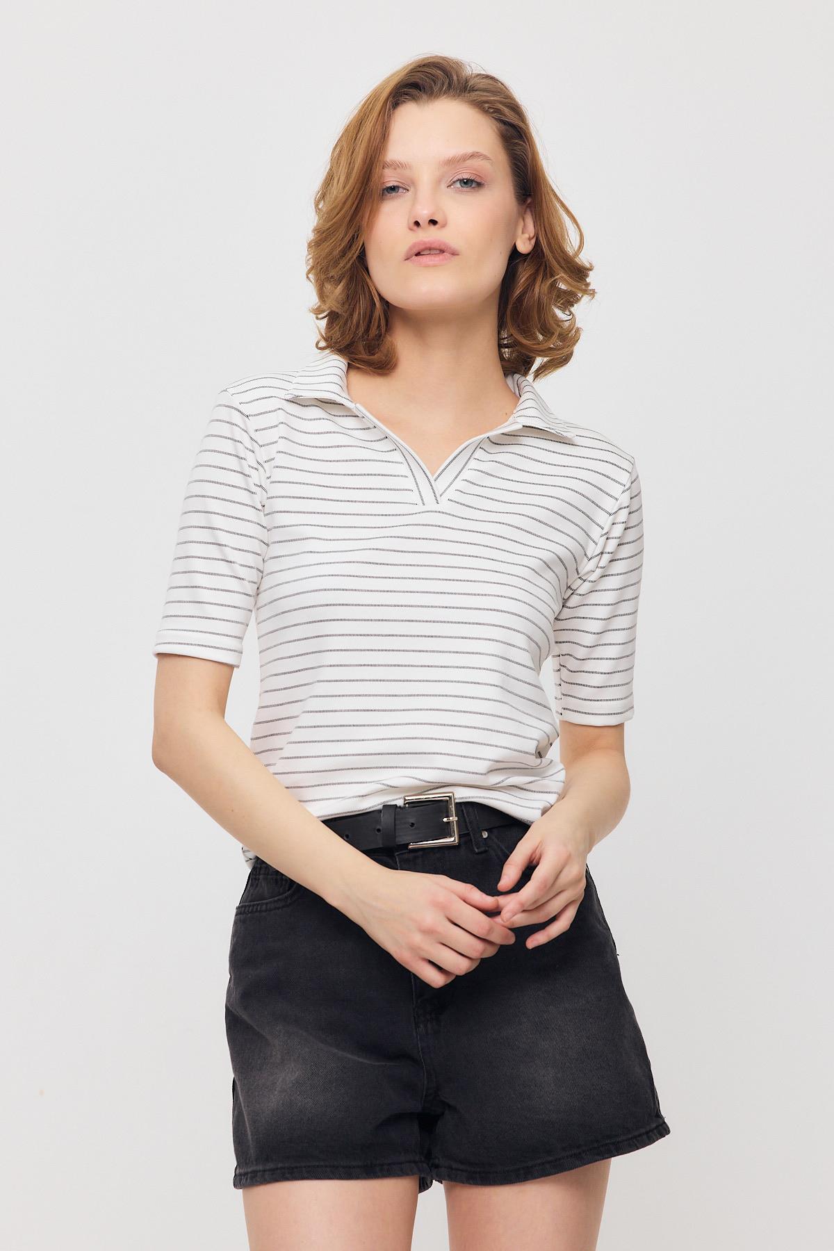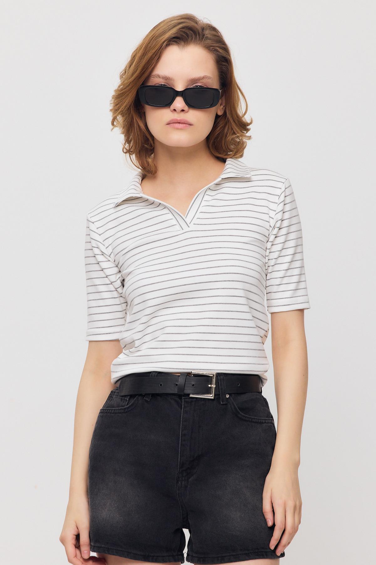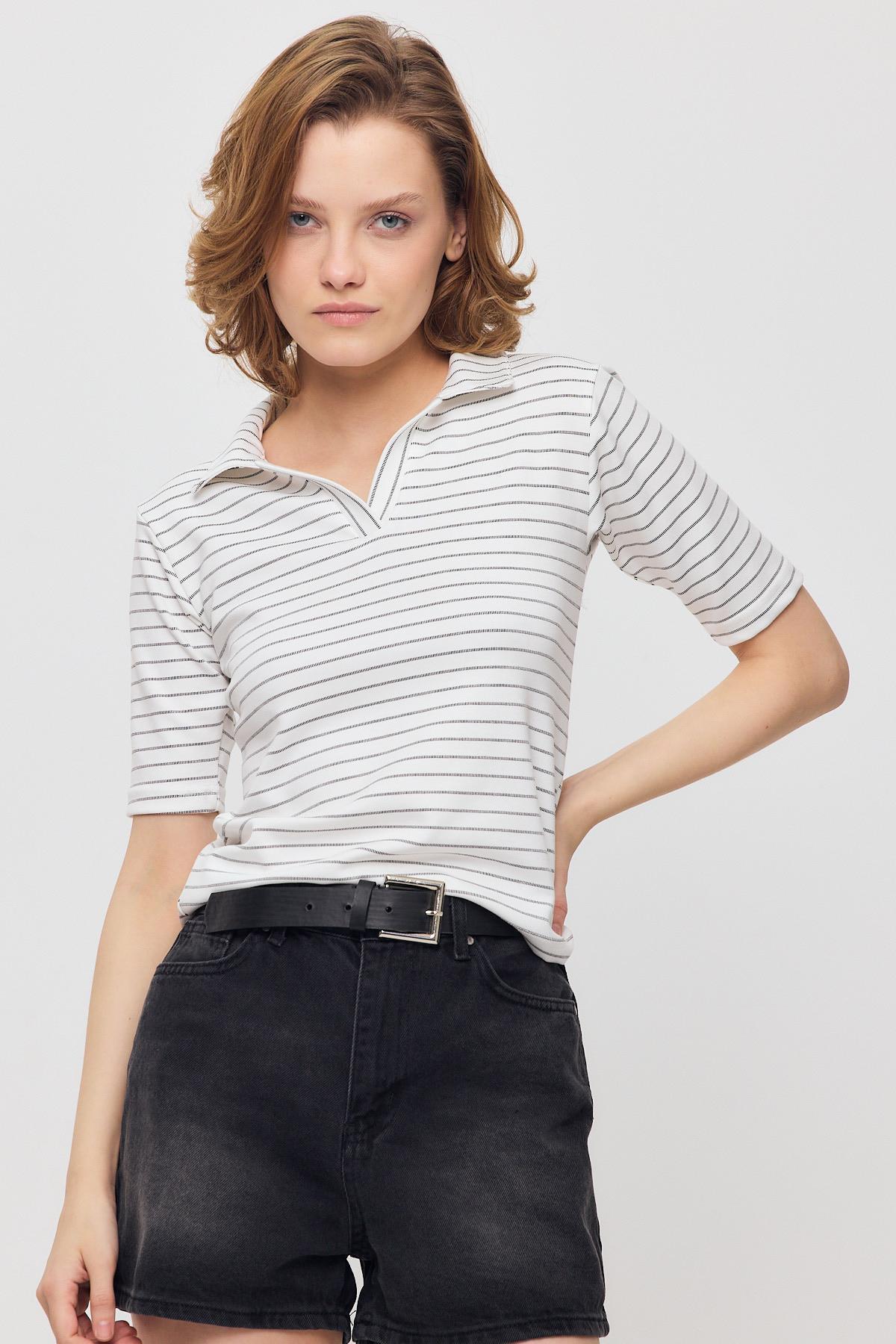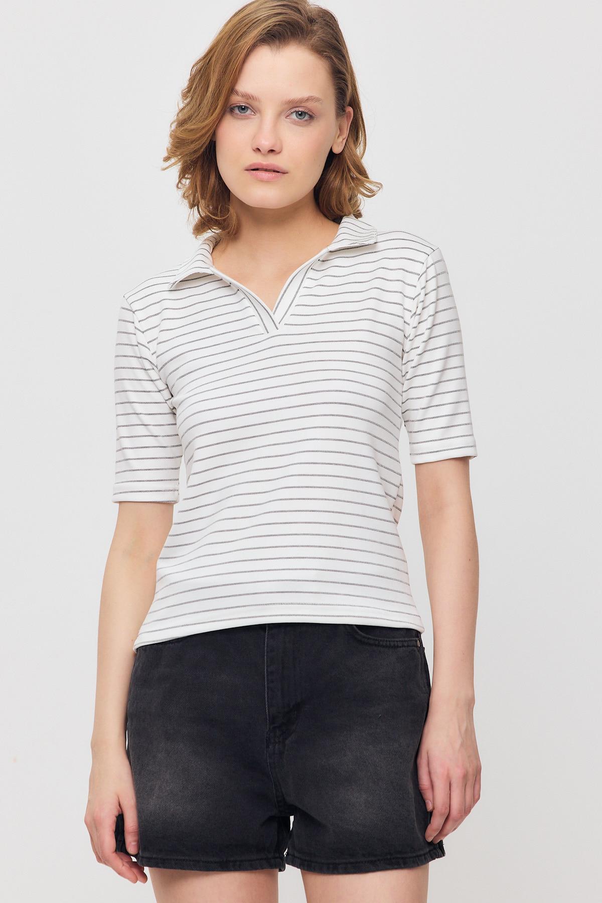 Beyaz V Yaka Çizgili Kısa Tişört 4449A