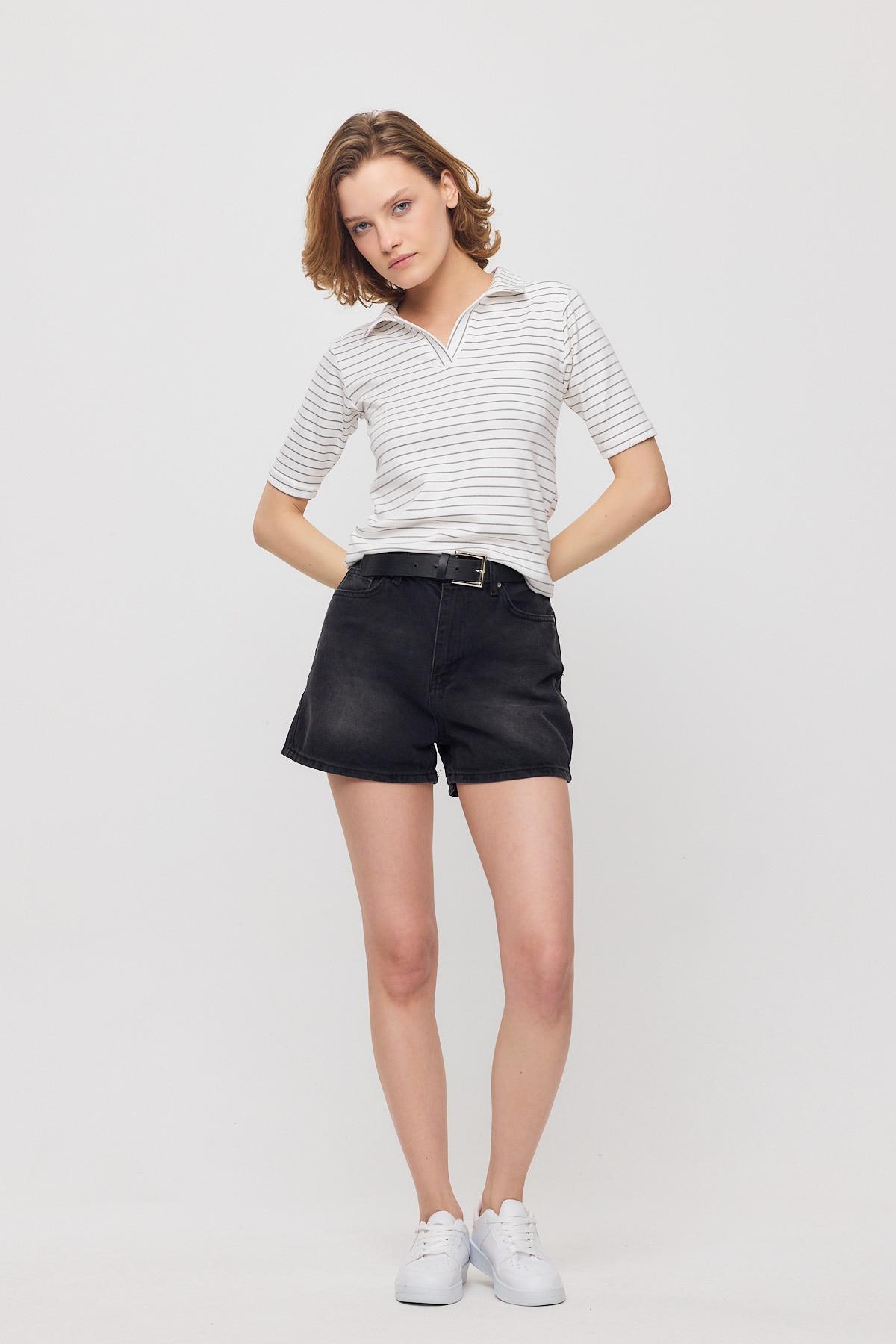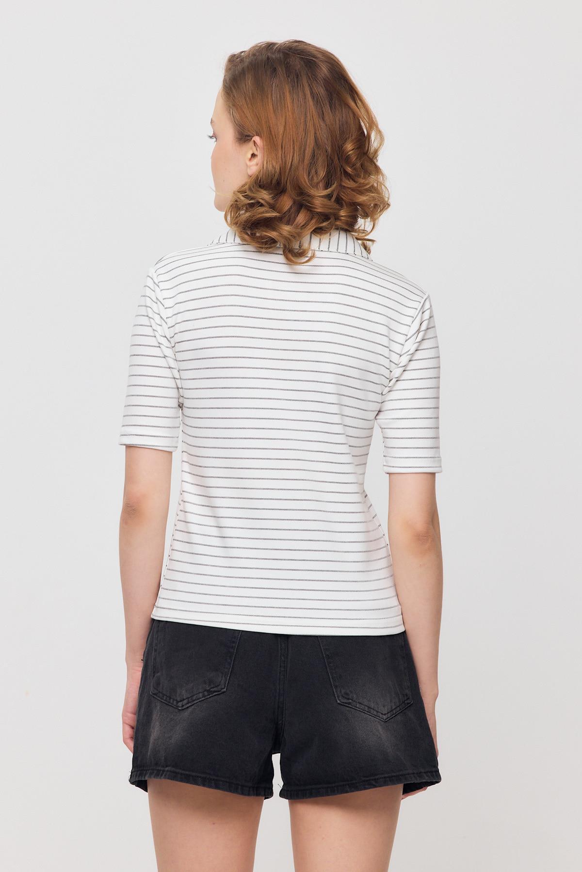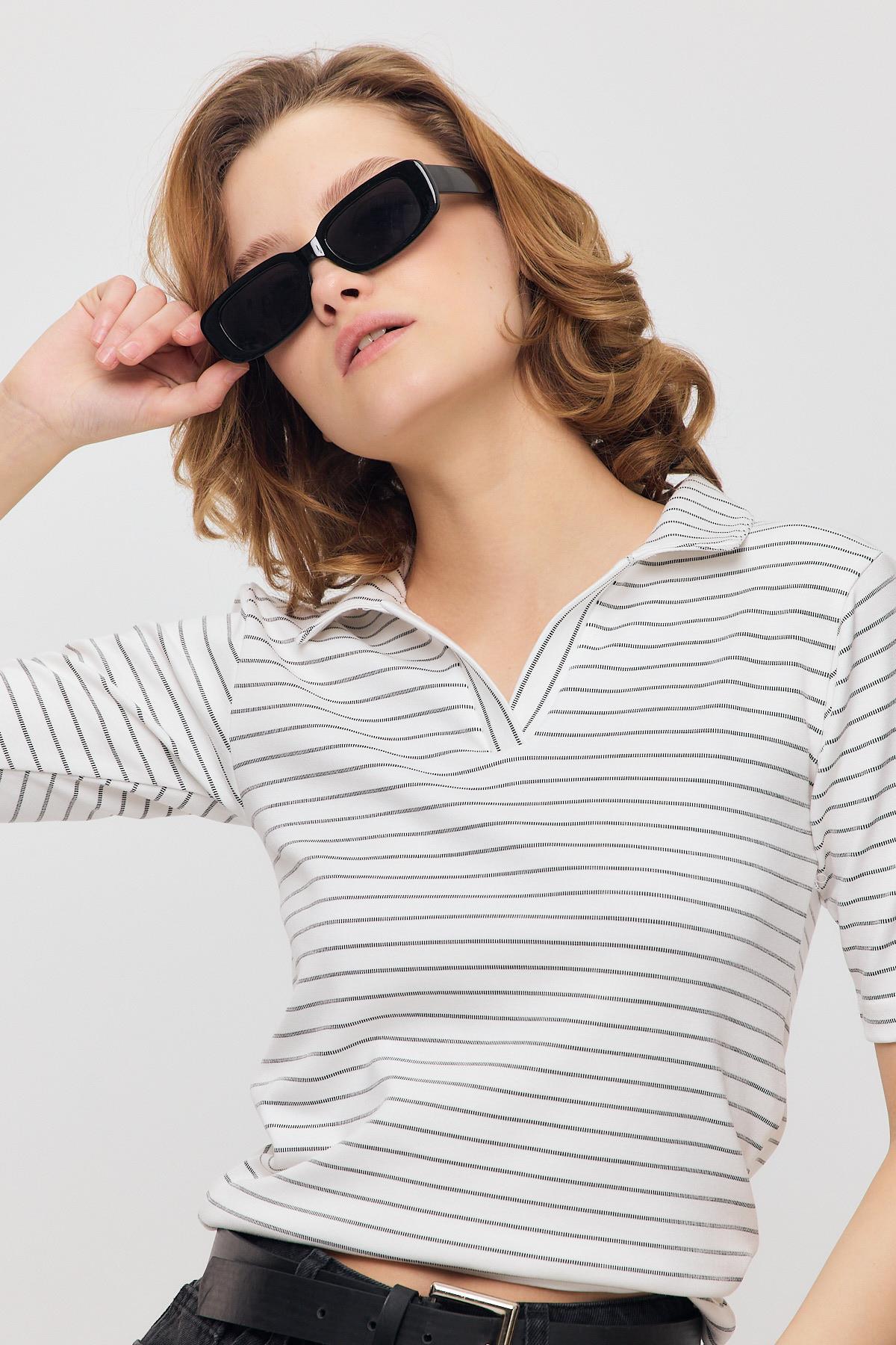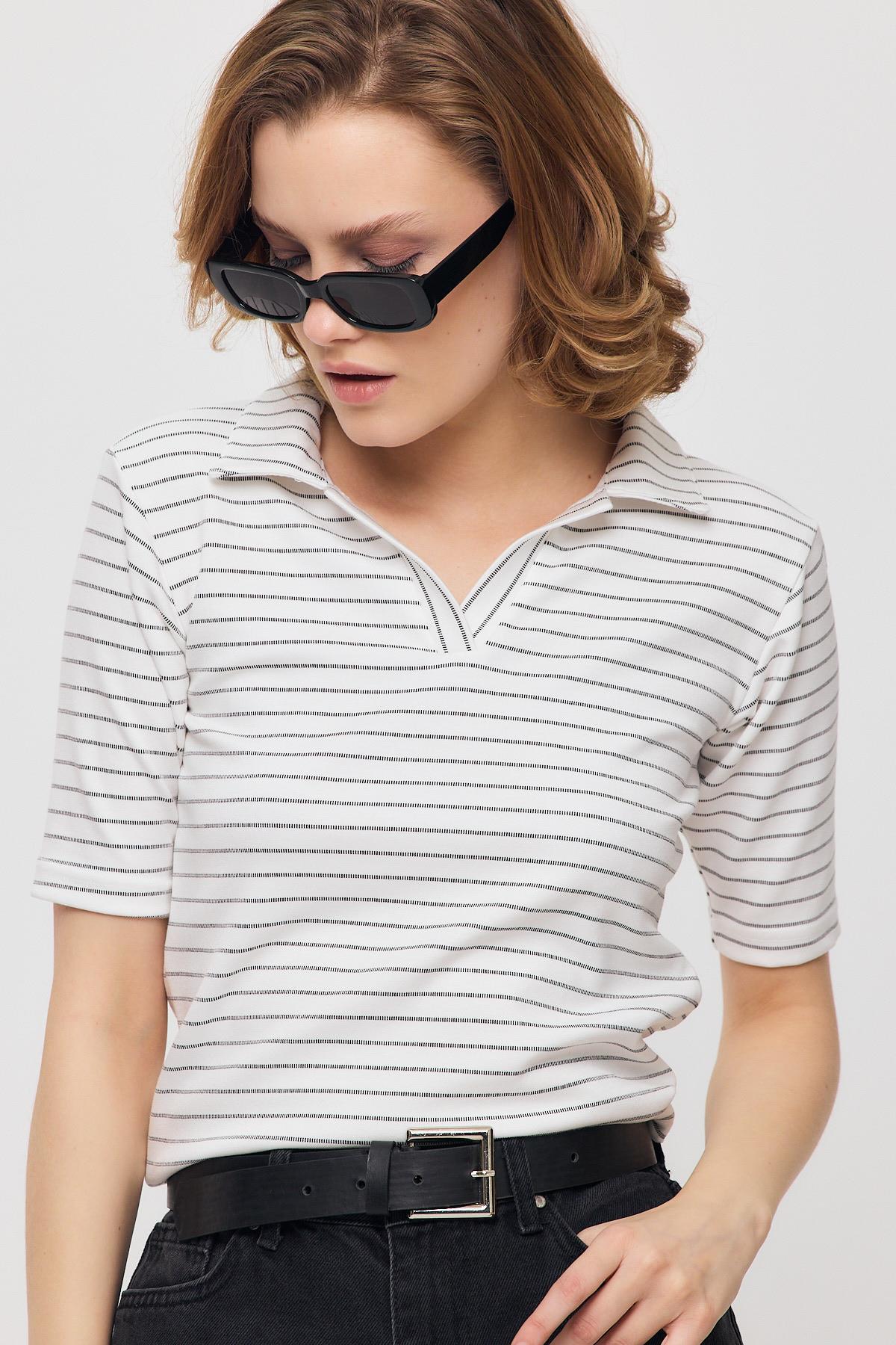 Beyaz V Yaka Çizgili Kısa Tişört 4449A