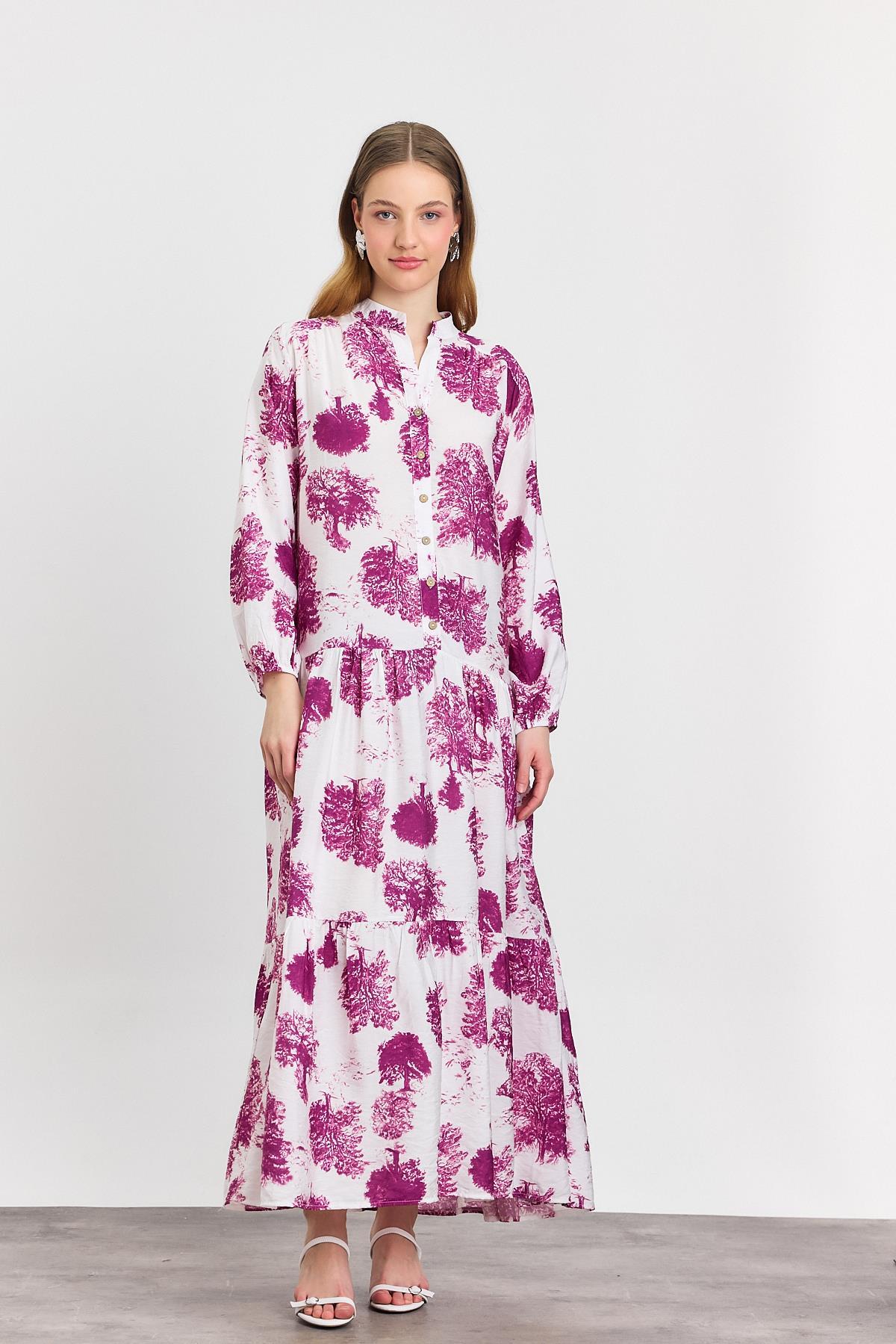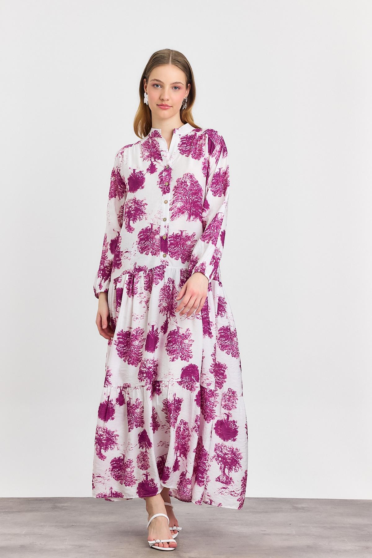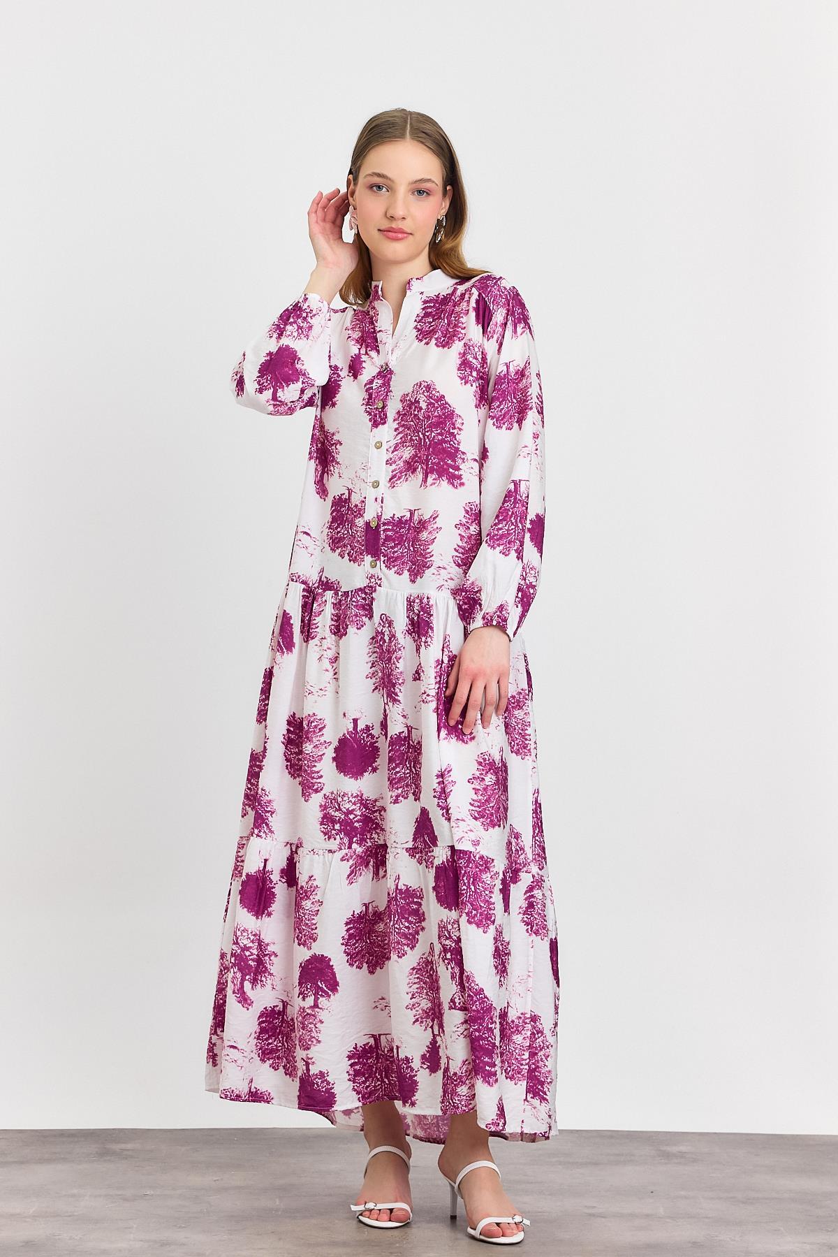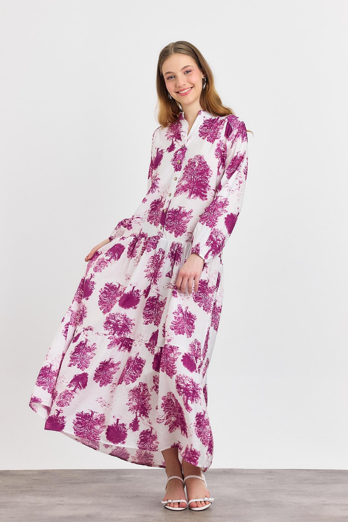 Fuşya Ağaç Desen Düğmeli Elbise 4465A