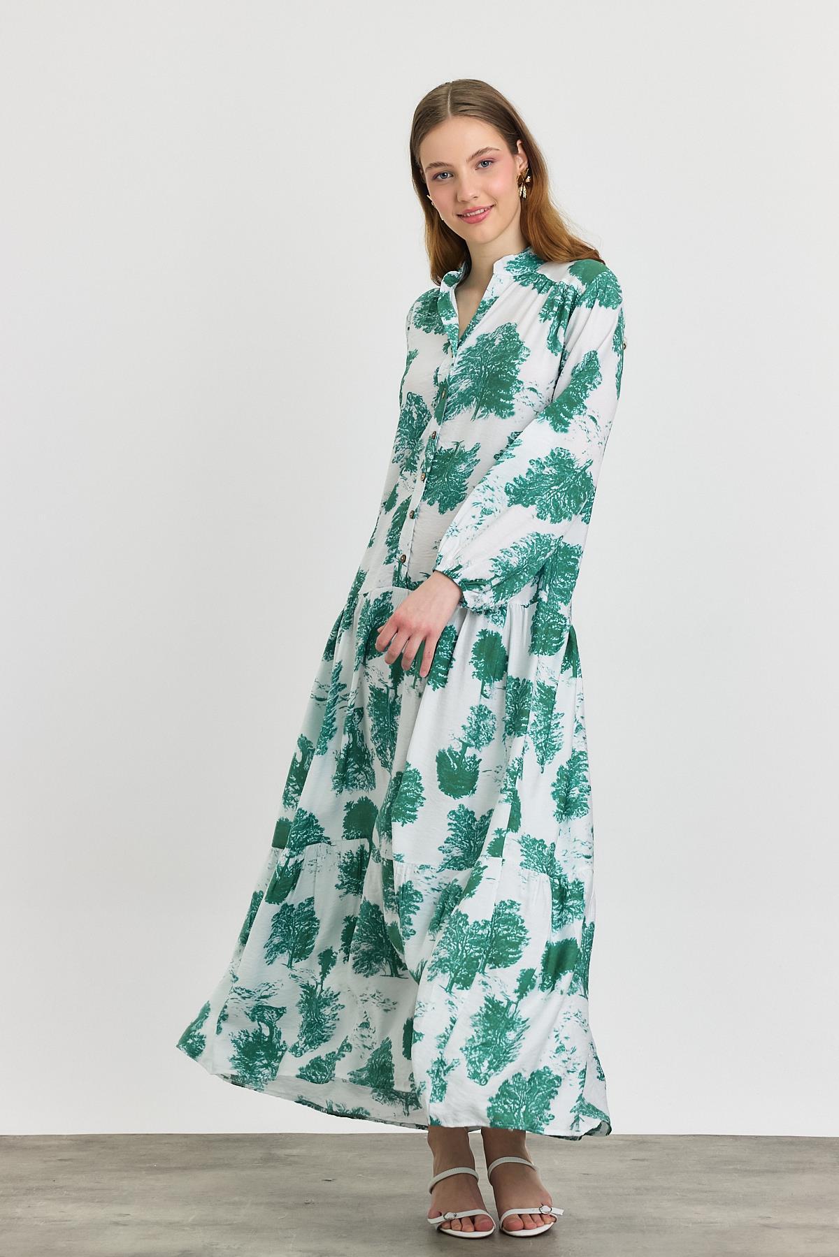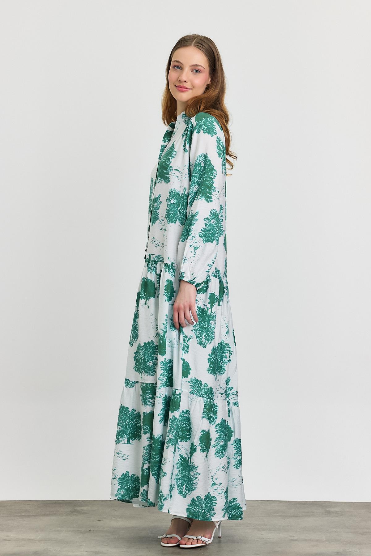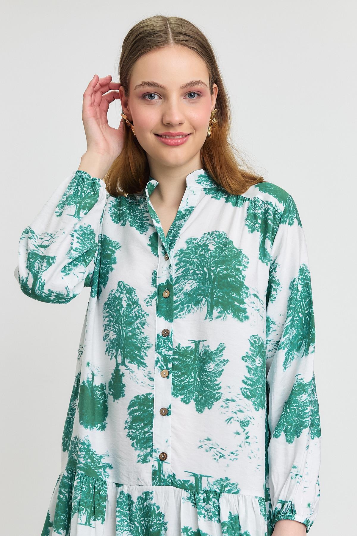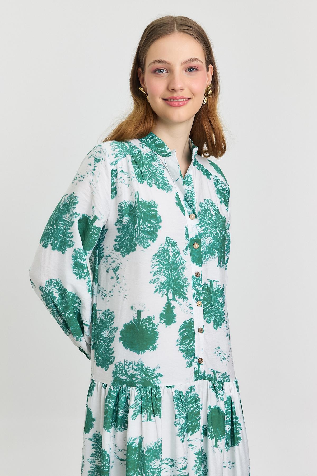 Turkuaz Ağaç Desen Düğmeli Elbise 4465A