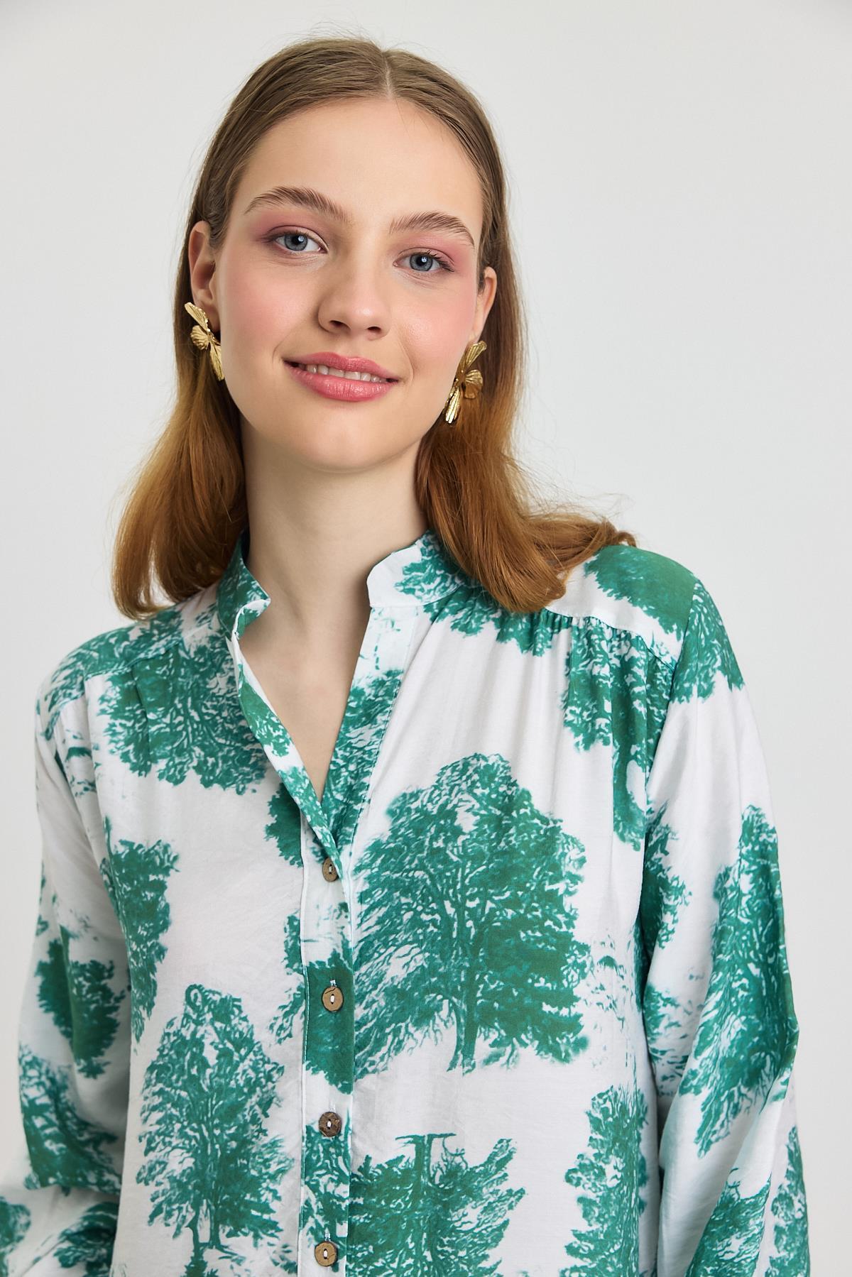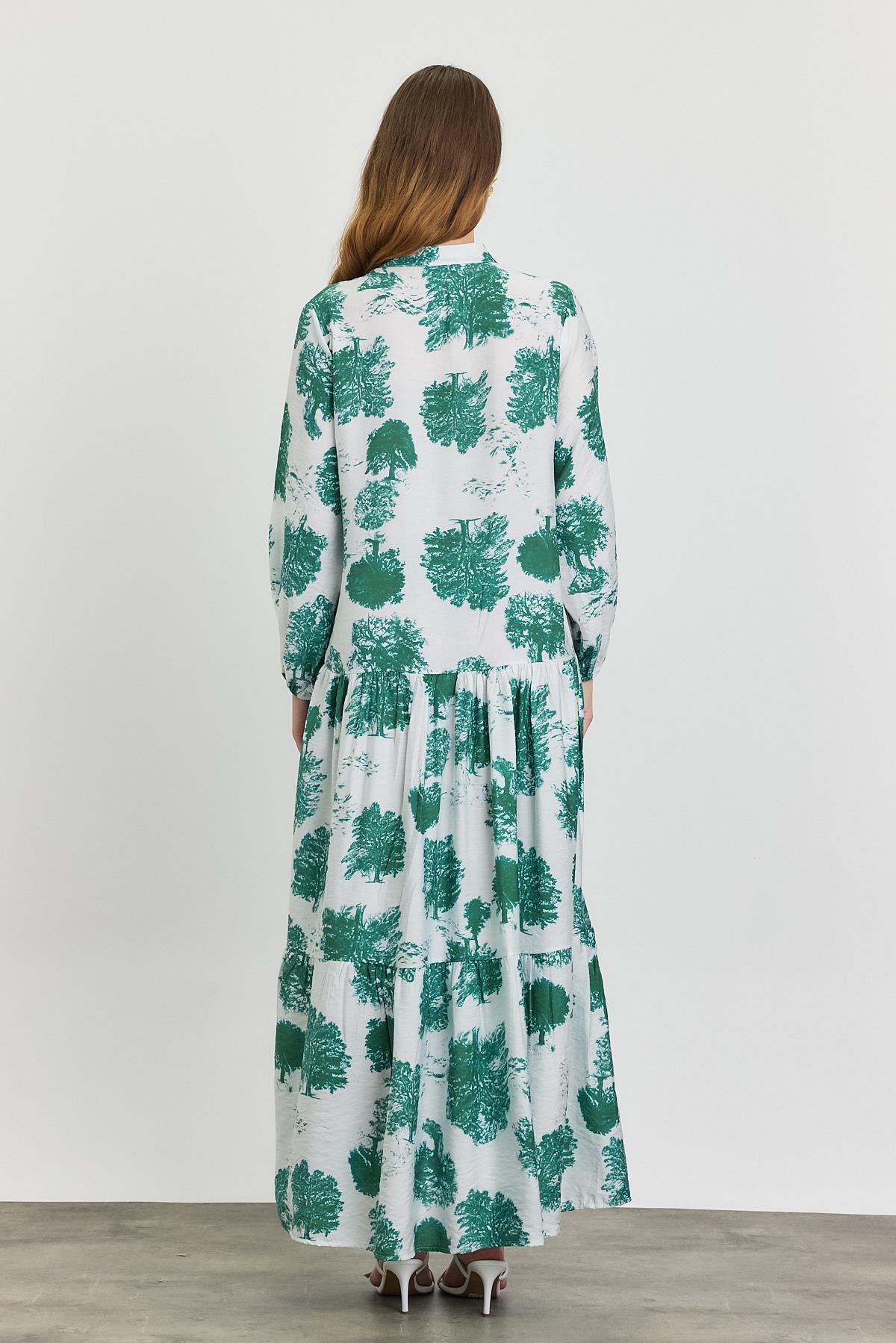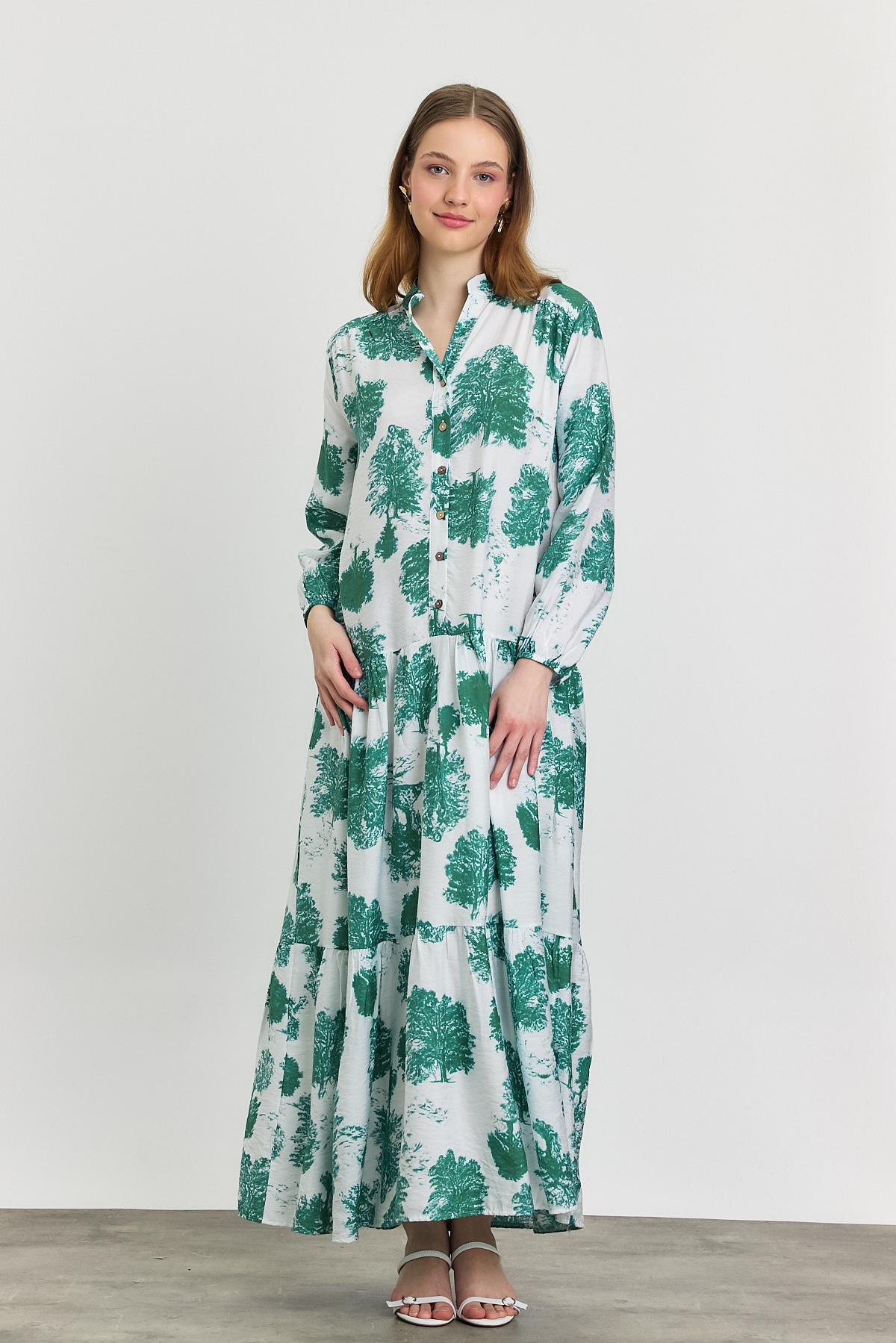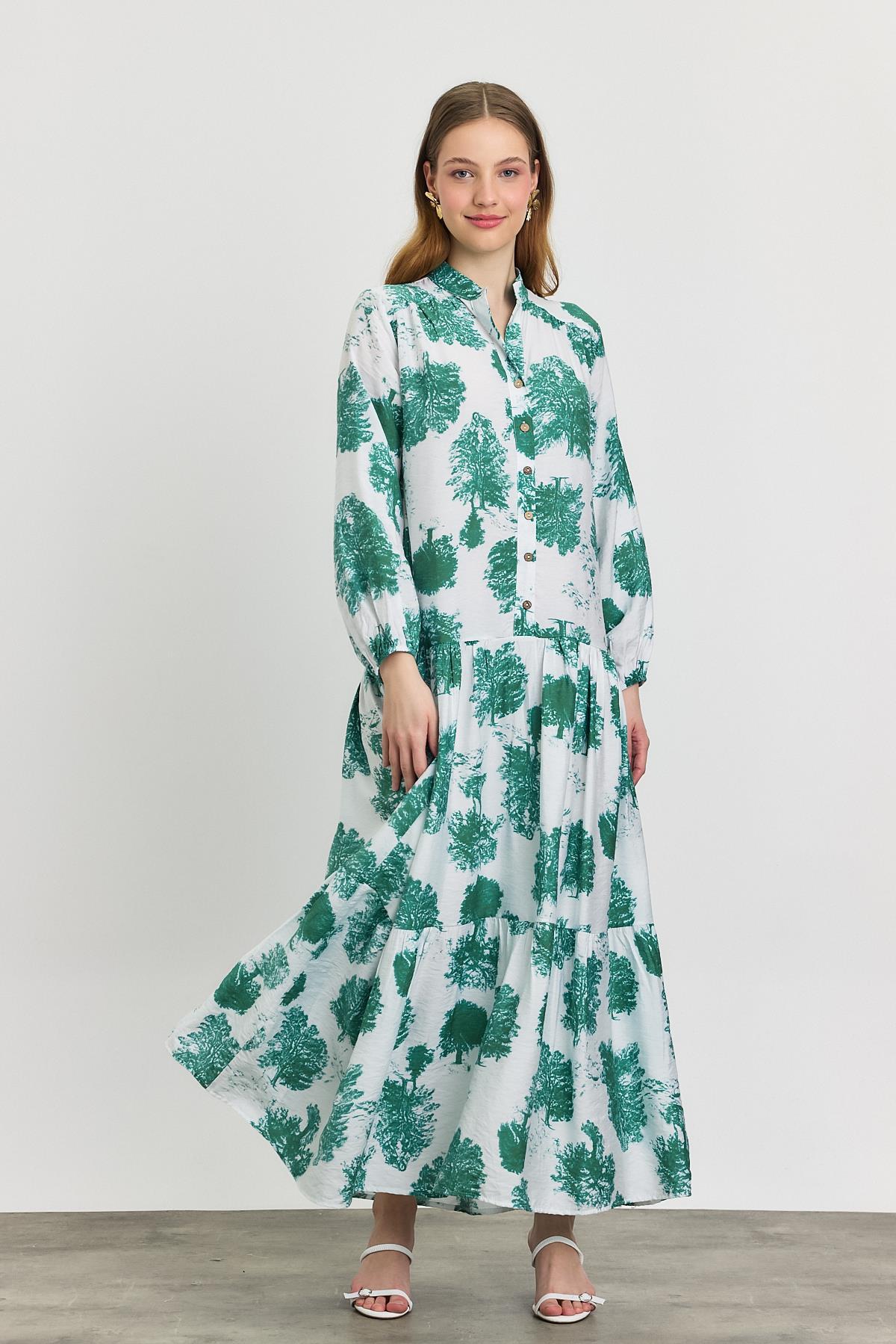 Turkuaz Ağaç Desen Düğmeli Elbise 4465A