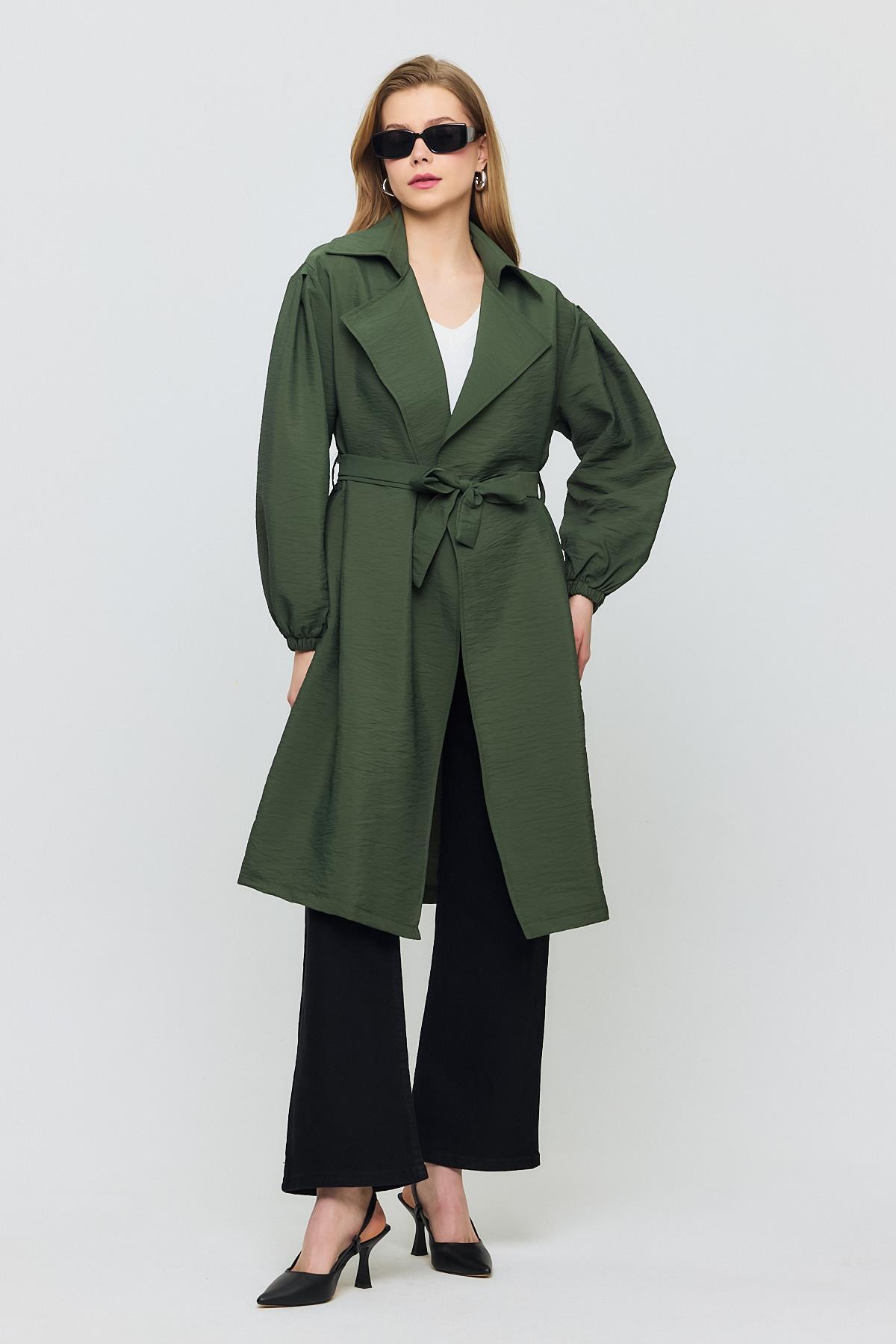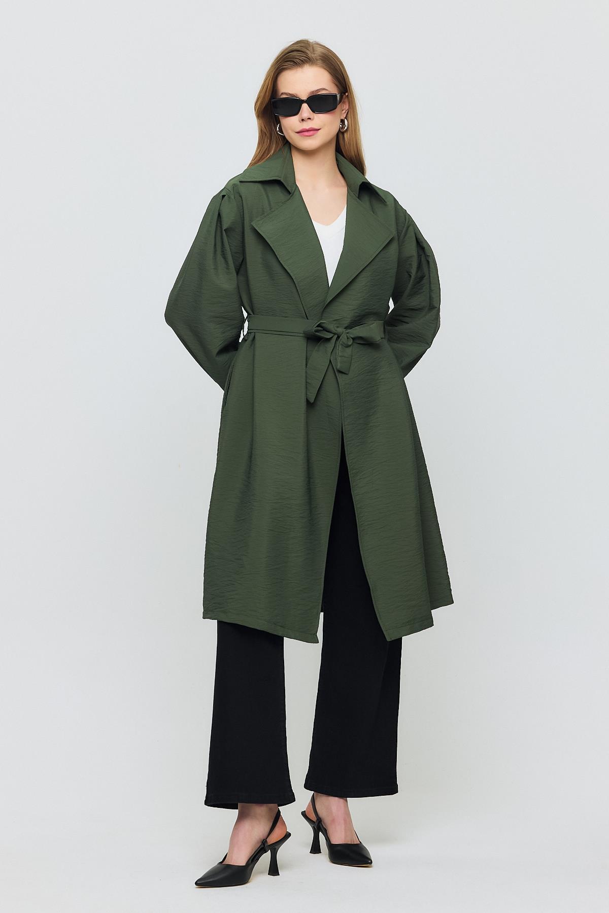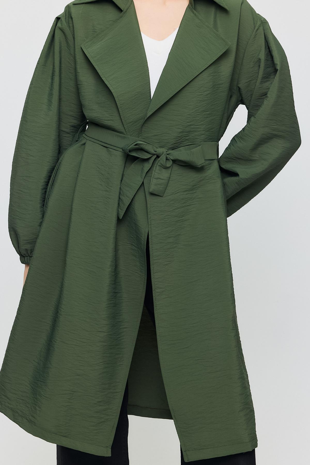 Haki Kuşaklı Kol Lastikli Trençkot 4579A