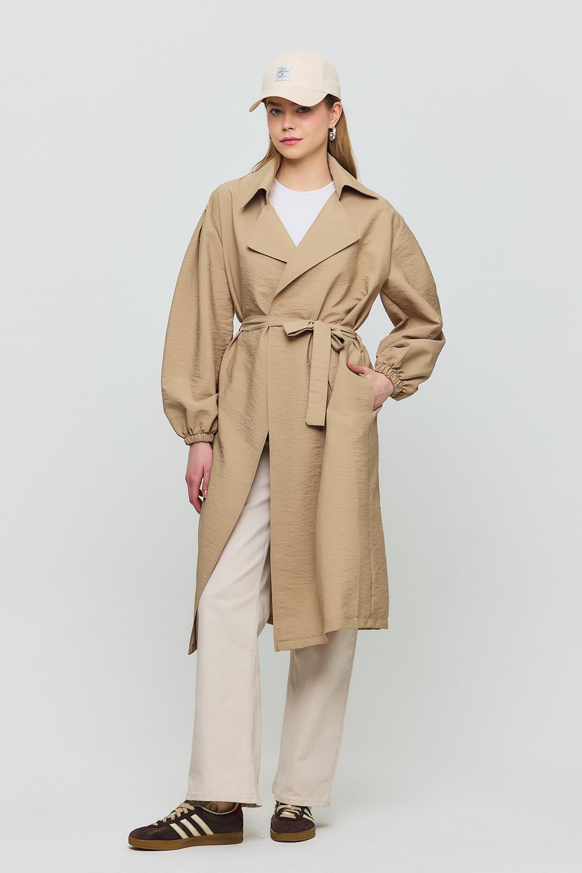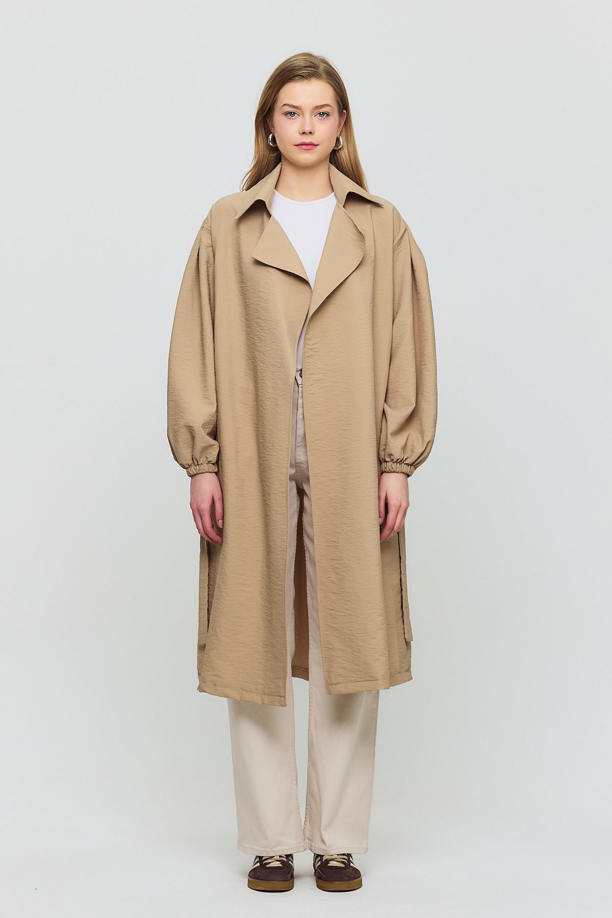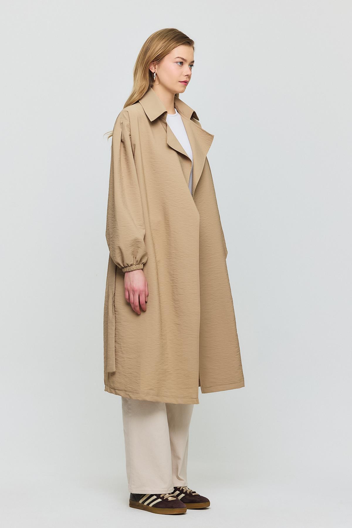 4579A Kuşaklı Kol Lastikli Trençkot Vizon