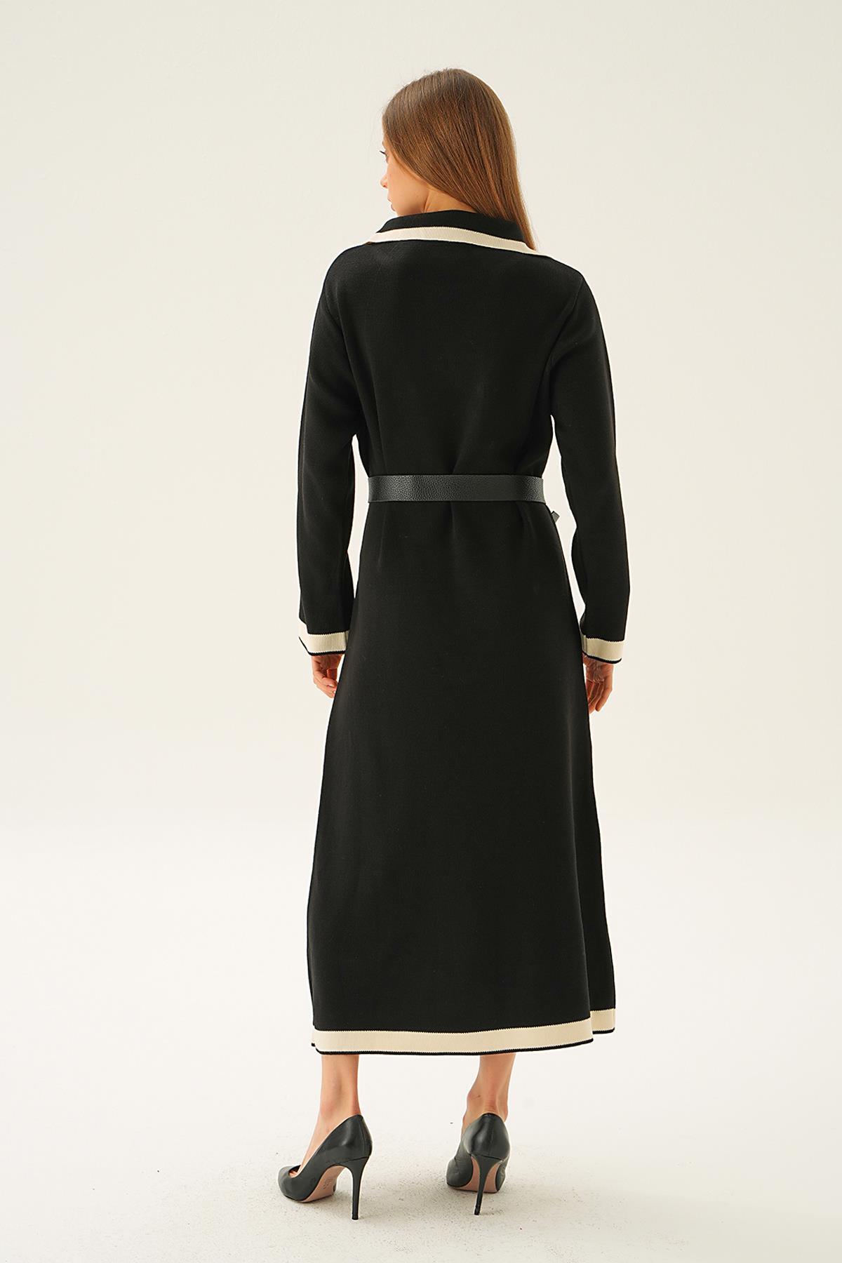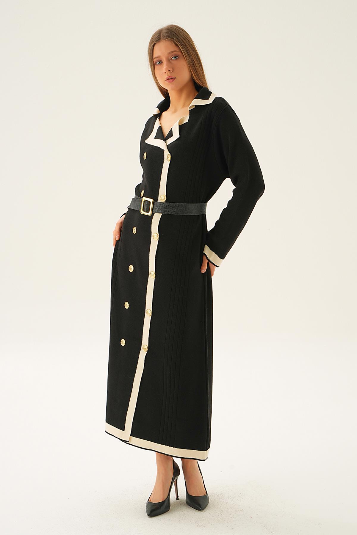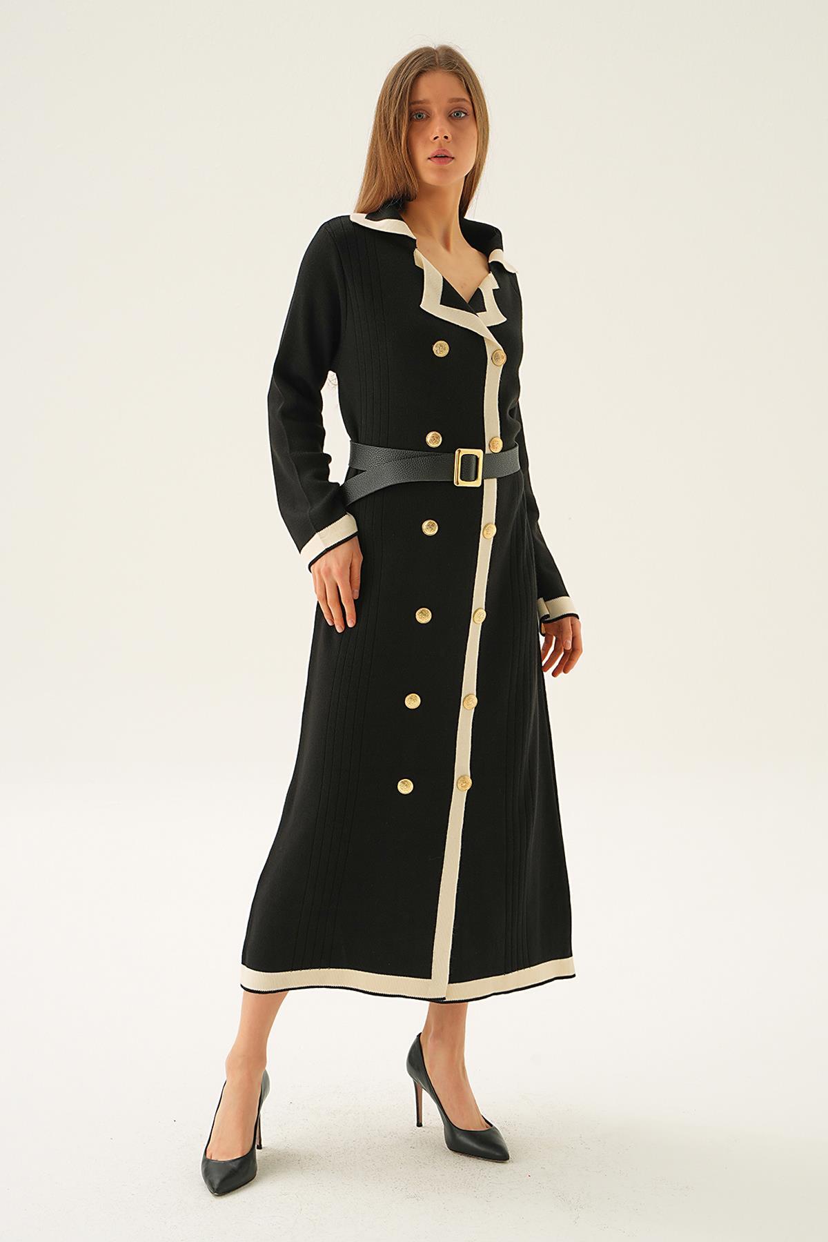 Siyah Kemerli Düğme Detay Elbise 4645