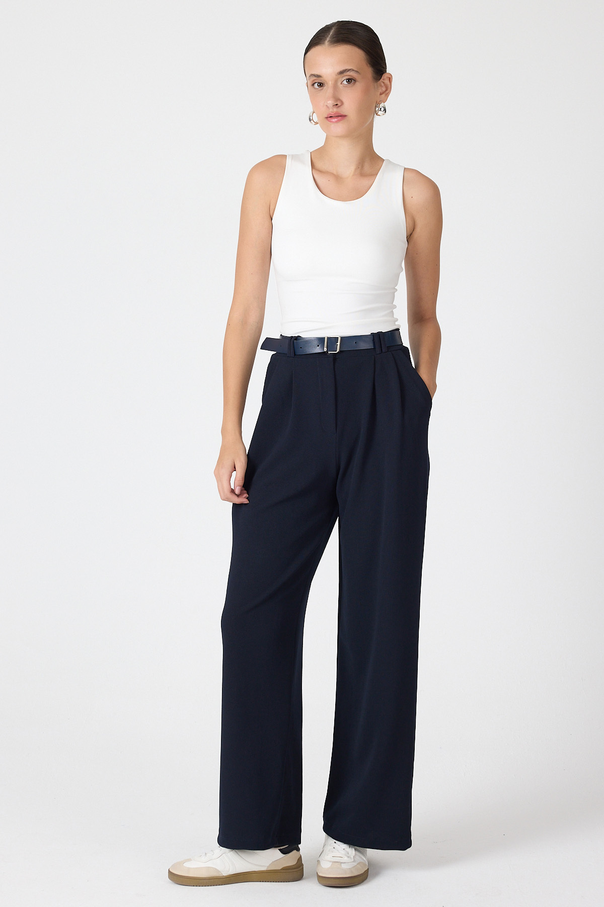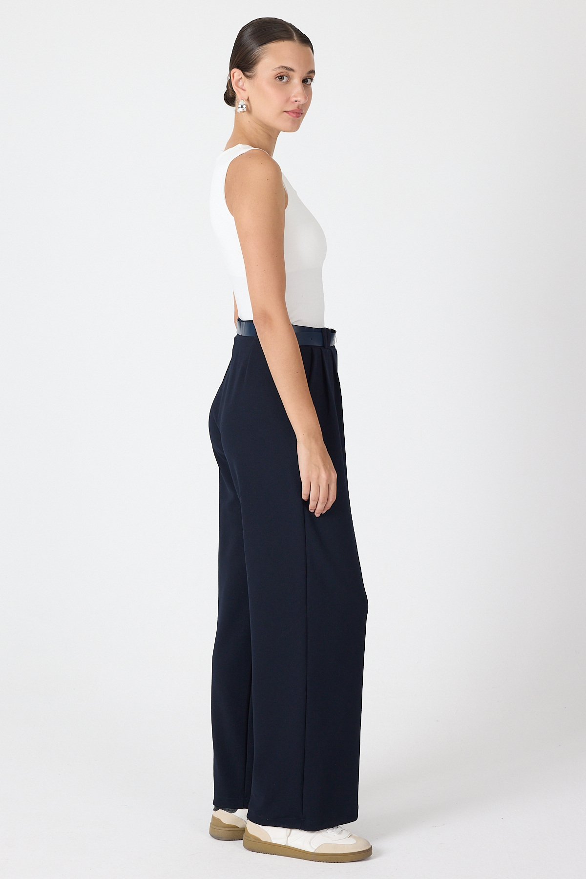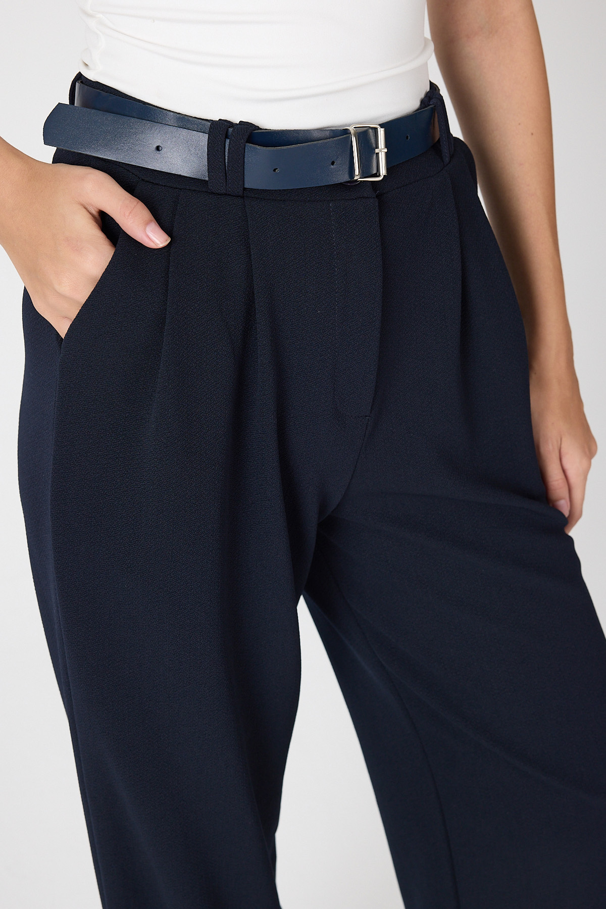 Gece Mavisi Çift Pile Detay Kemerli Kadın Pantolon 5009