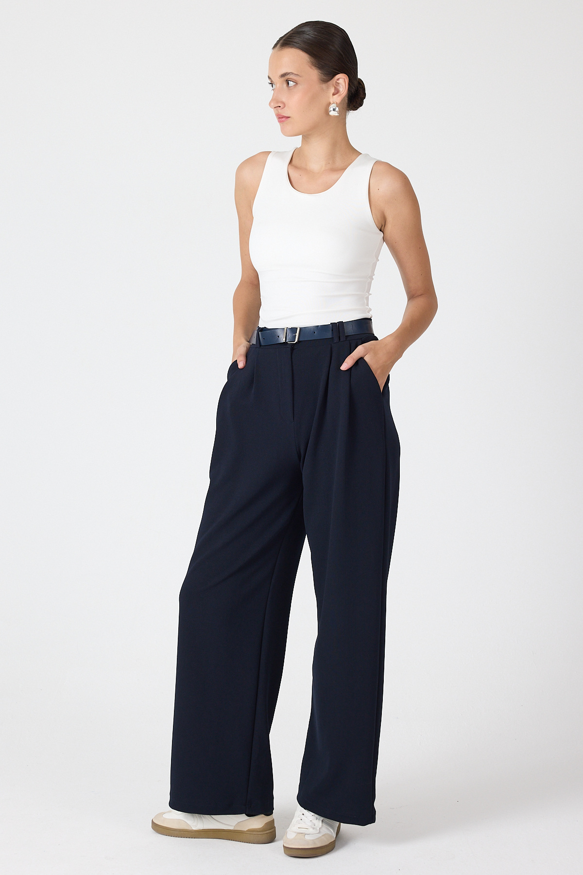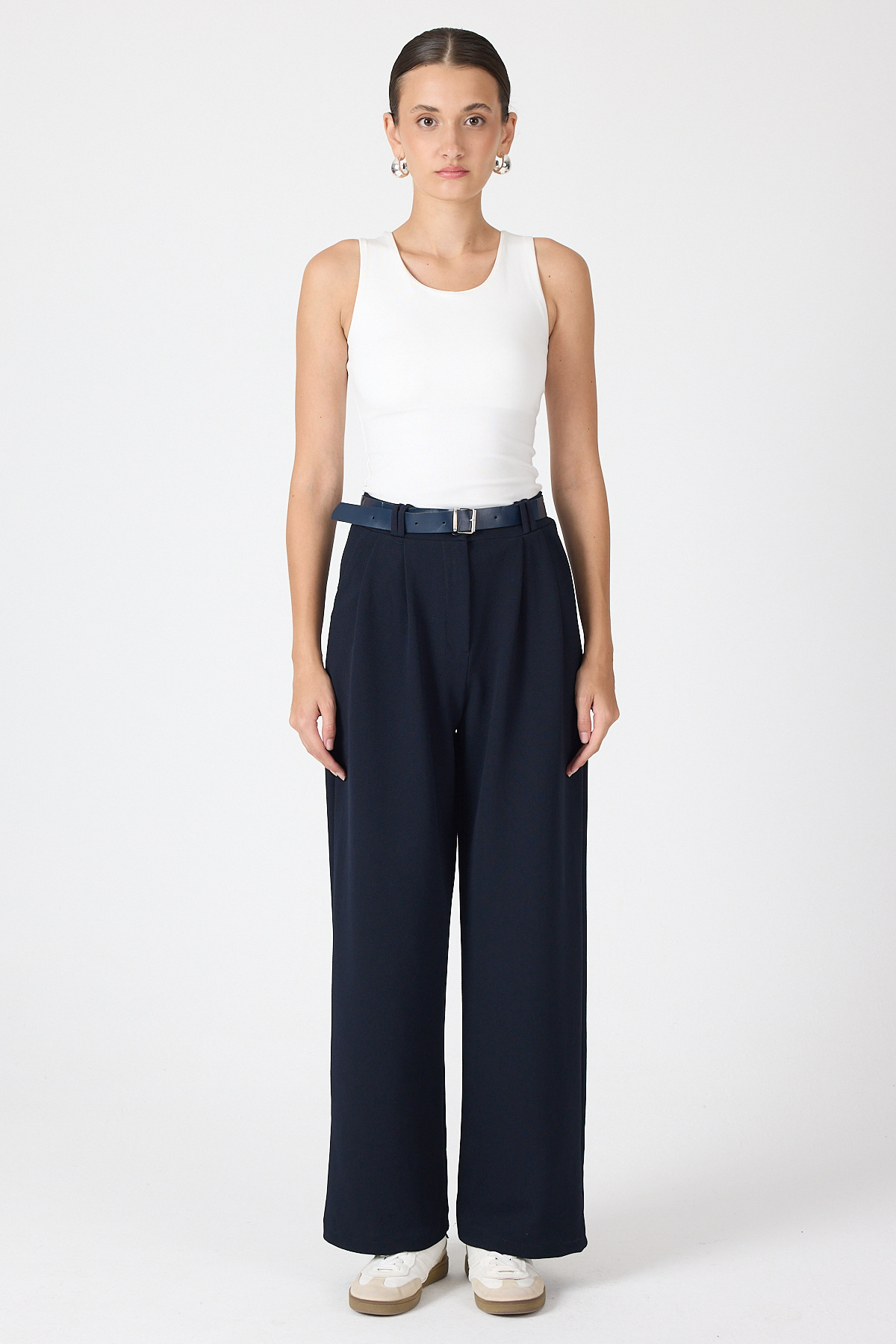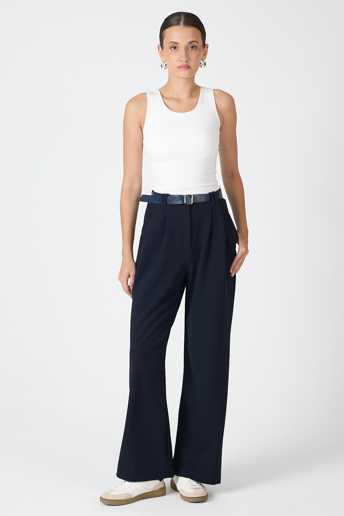 Gece Mavisi Çift Pile Detay Kemerli Kadın Pantolon 5009