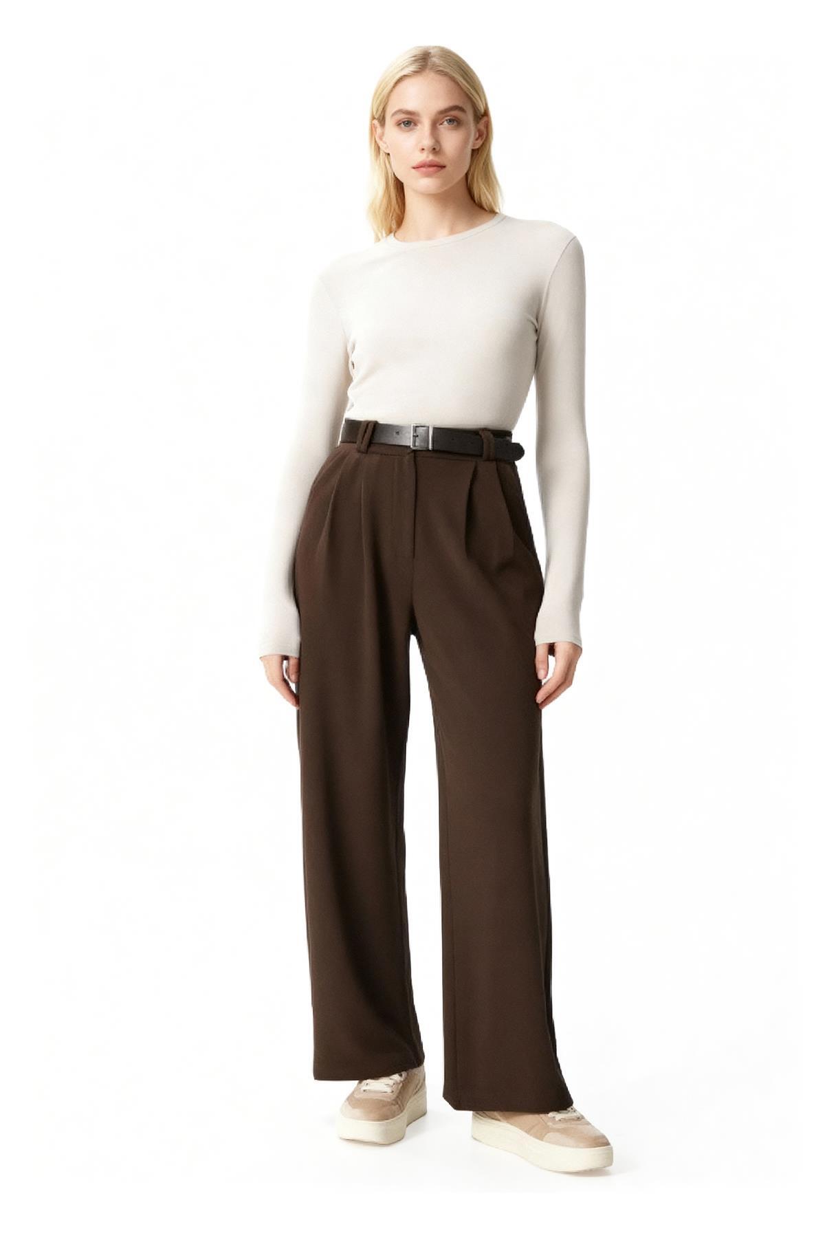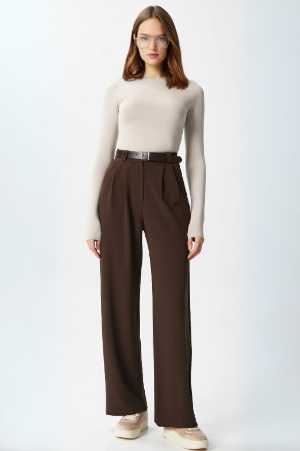 5009 Çift Pile Detay Kemerli Pantolon Kahve