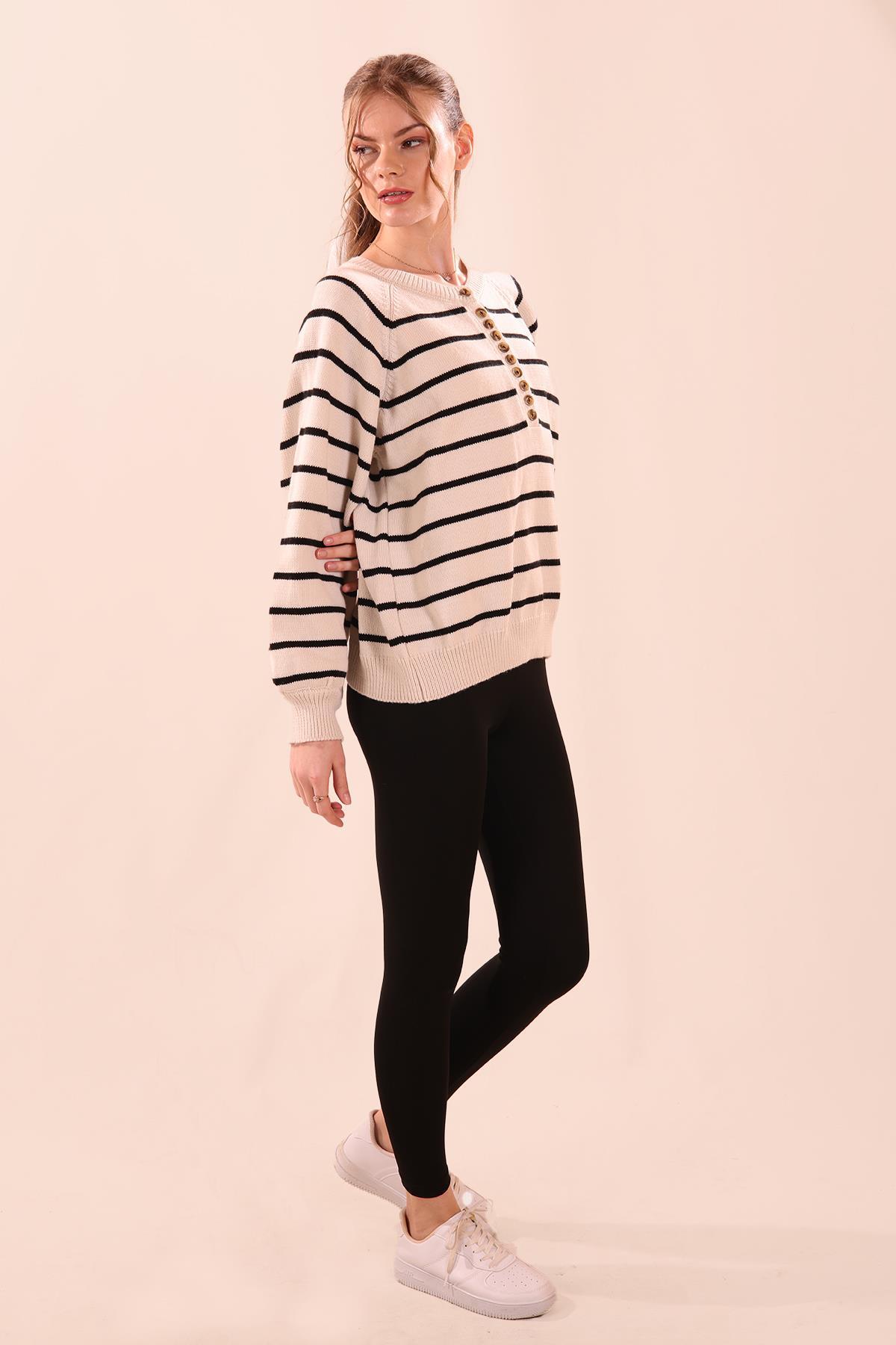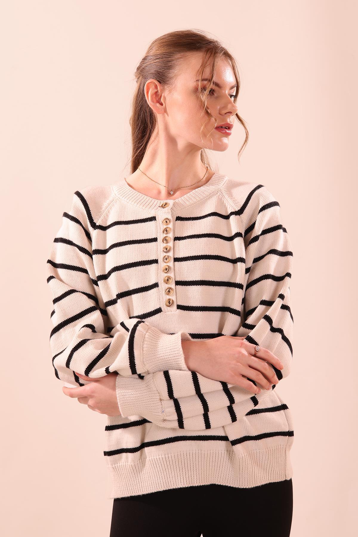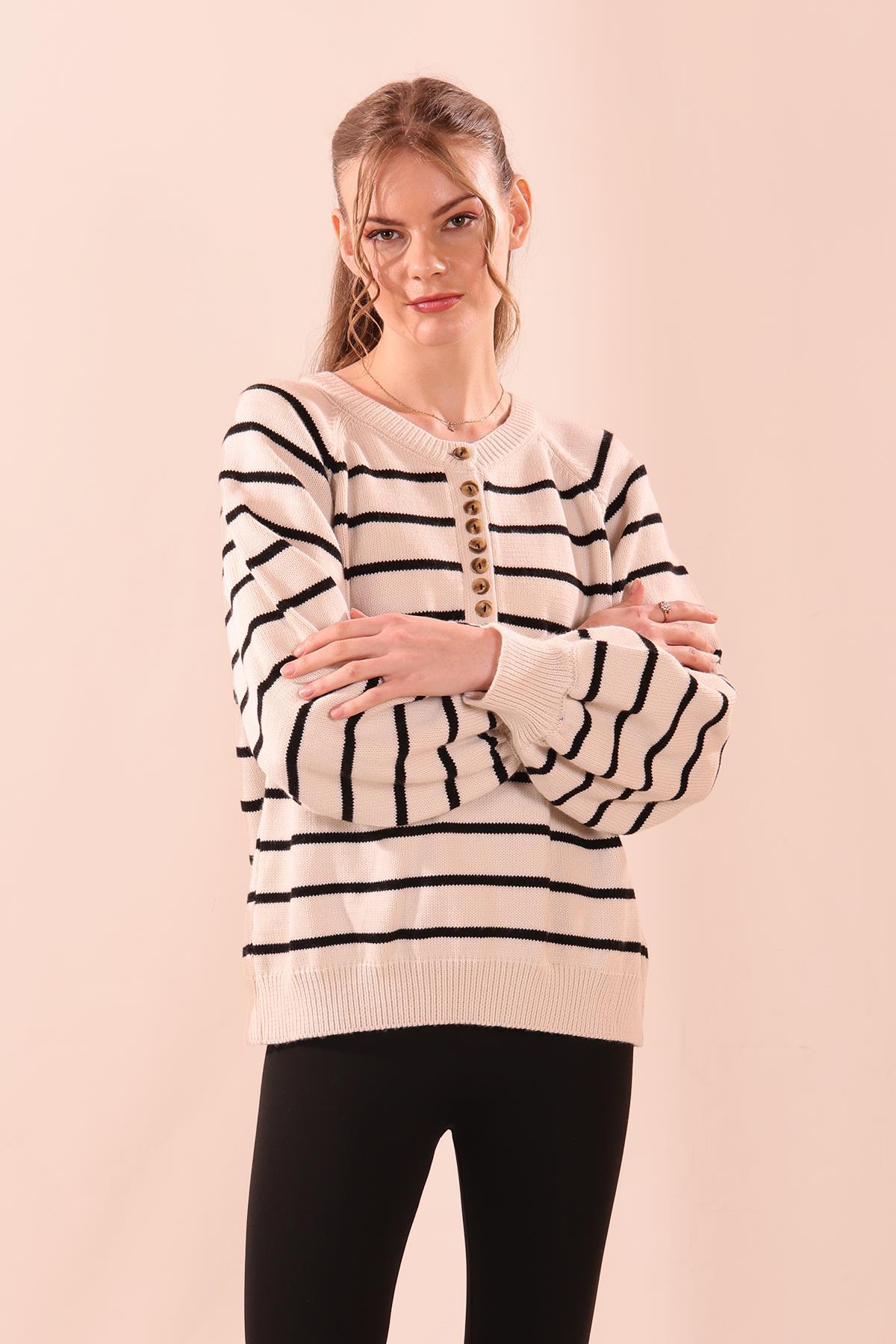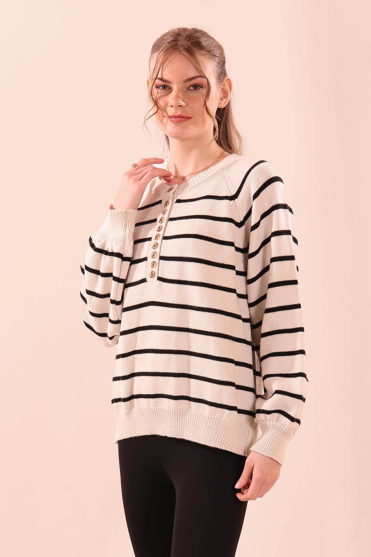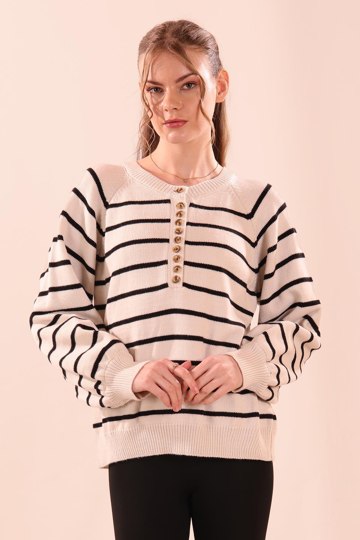 Taş Yaka Düğmeli Balon Kol Kazak 5156