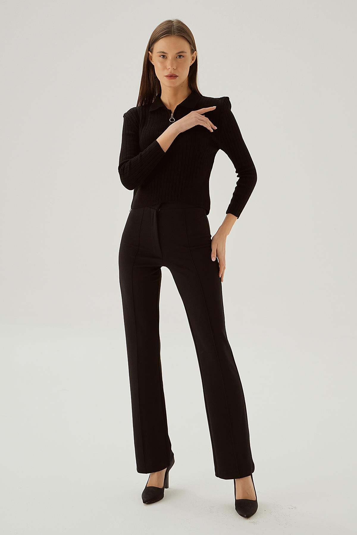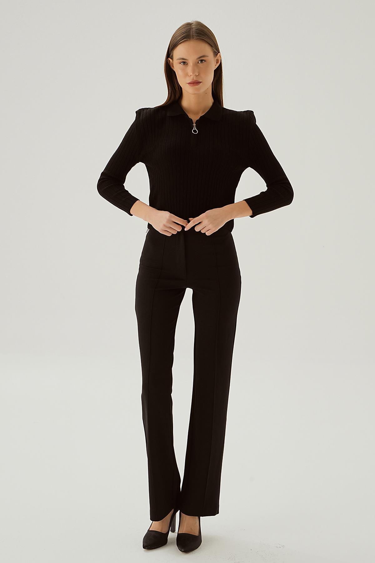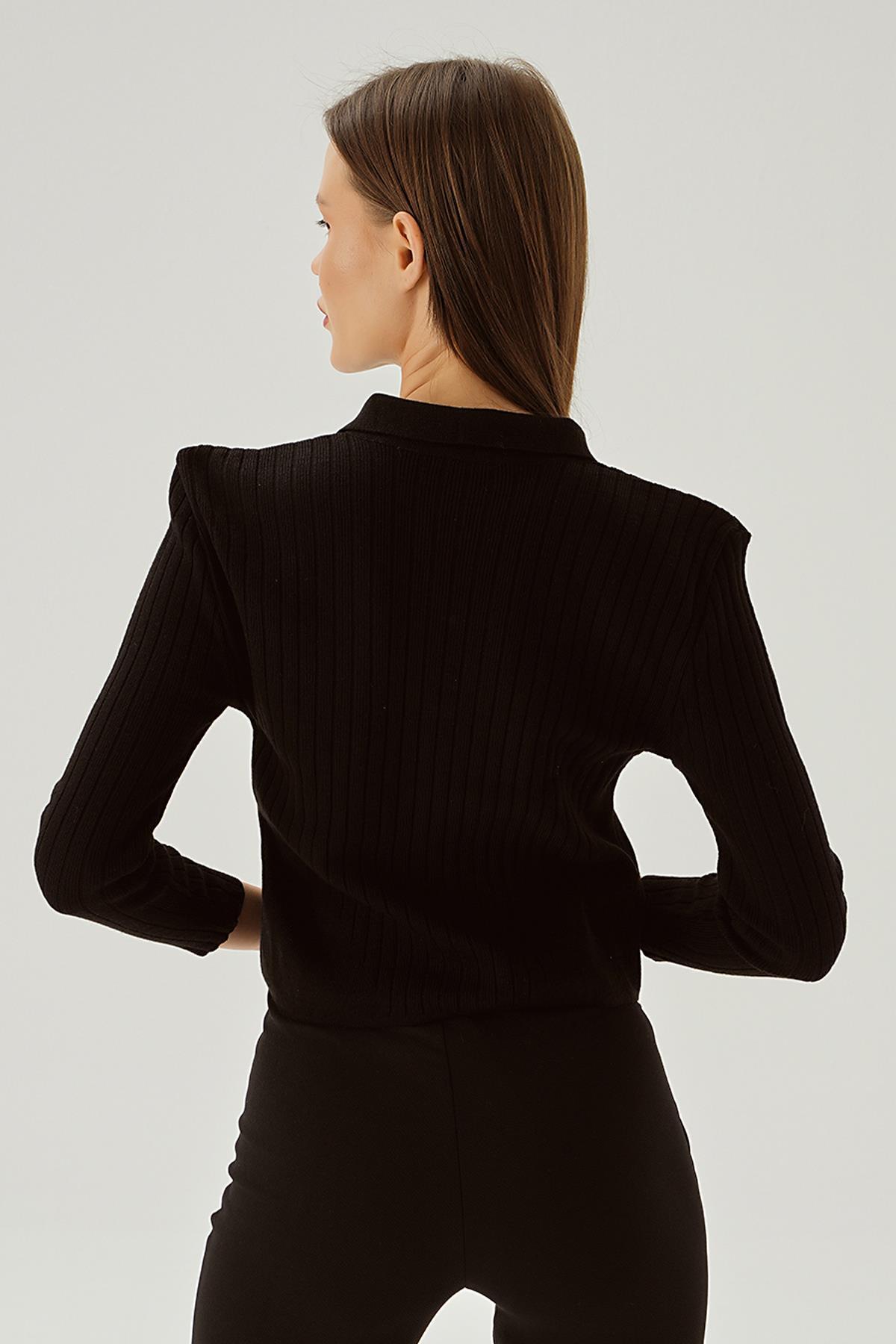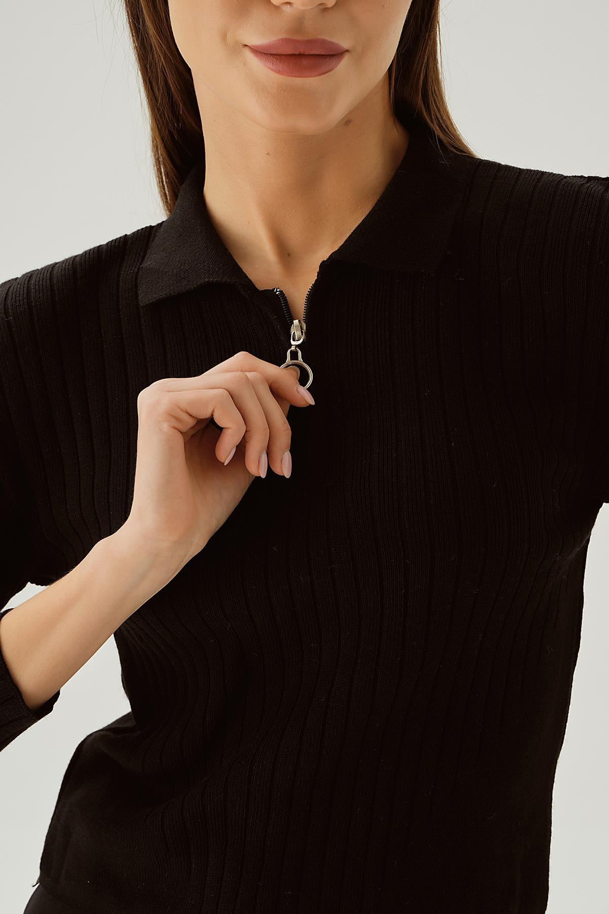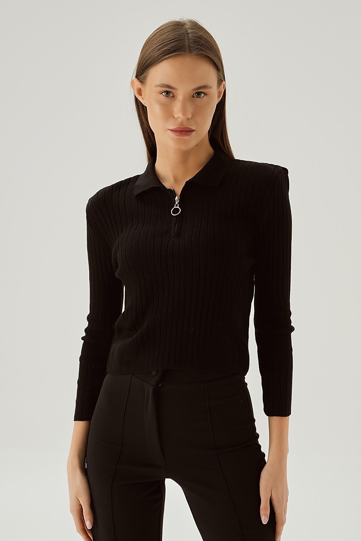Siyah Polo Yaka Fermuarlı Kazak 5272