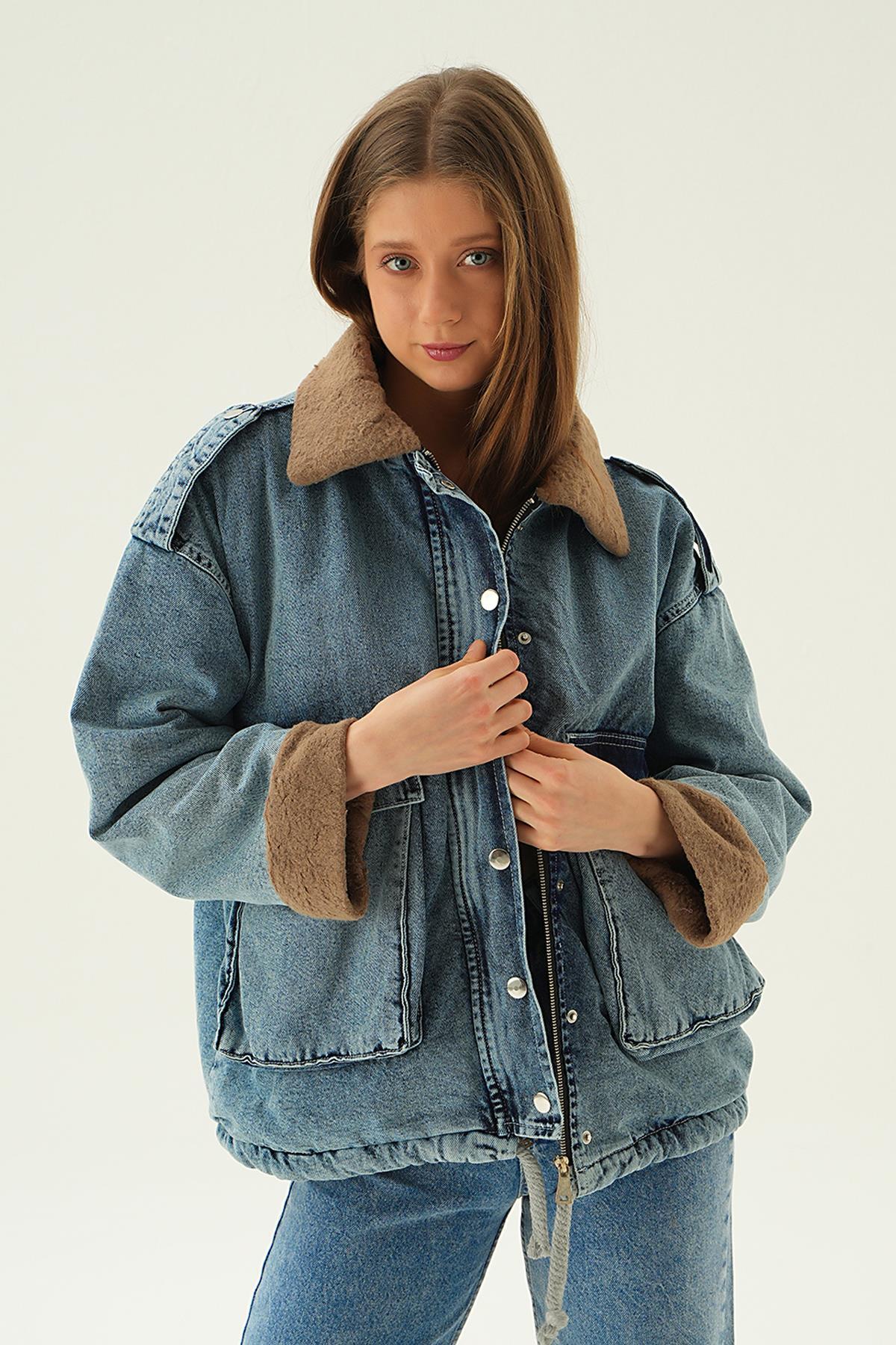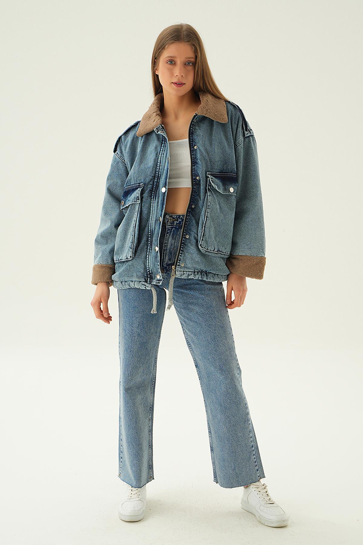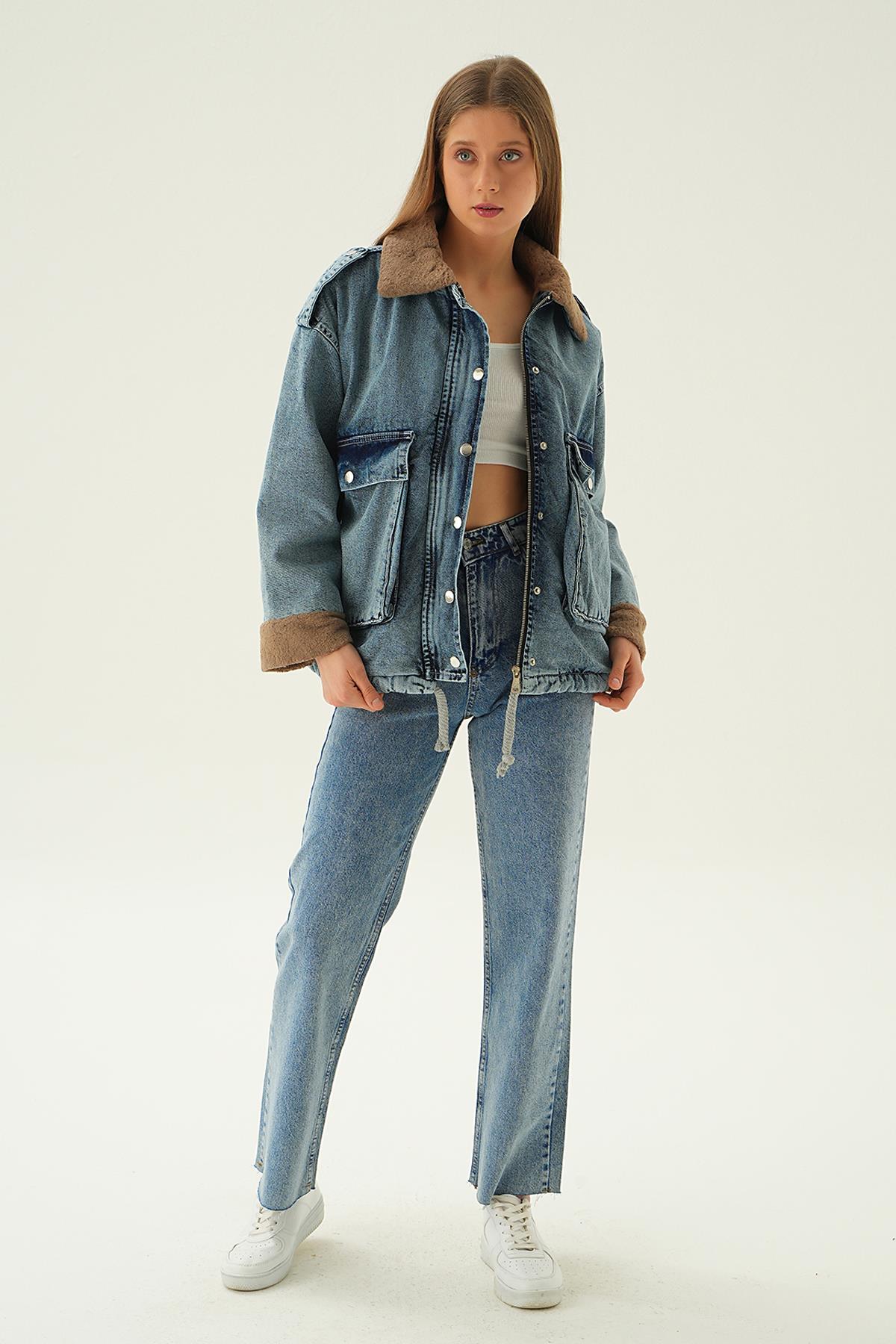 Koyu Kar Yıkama Kol Kürk Detay Jean Ceket 5320
