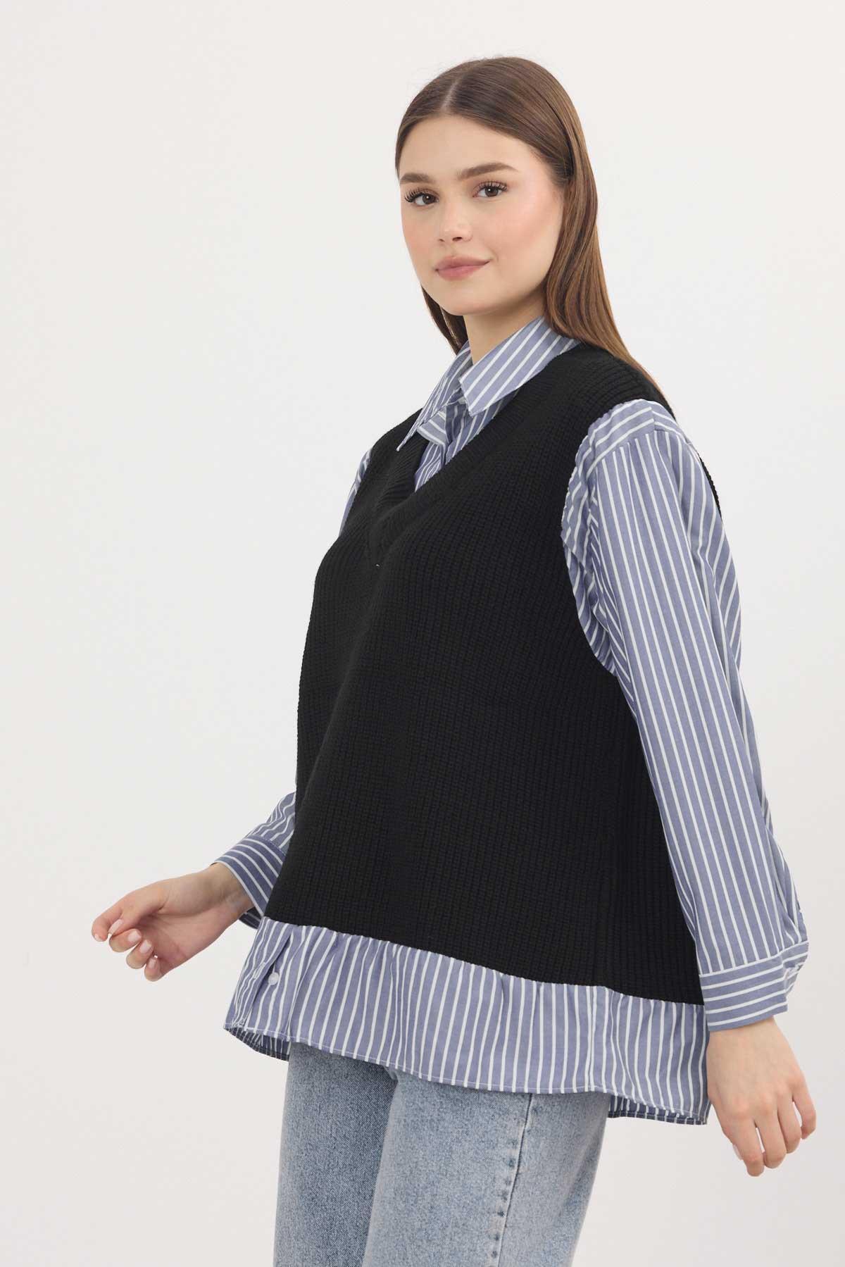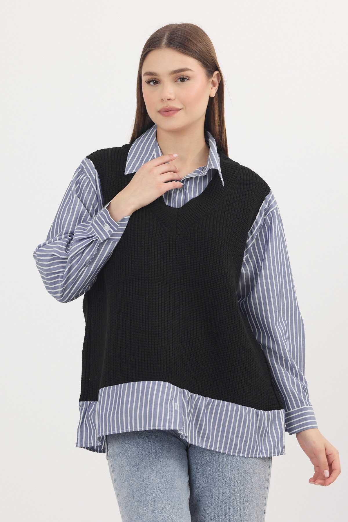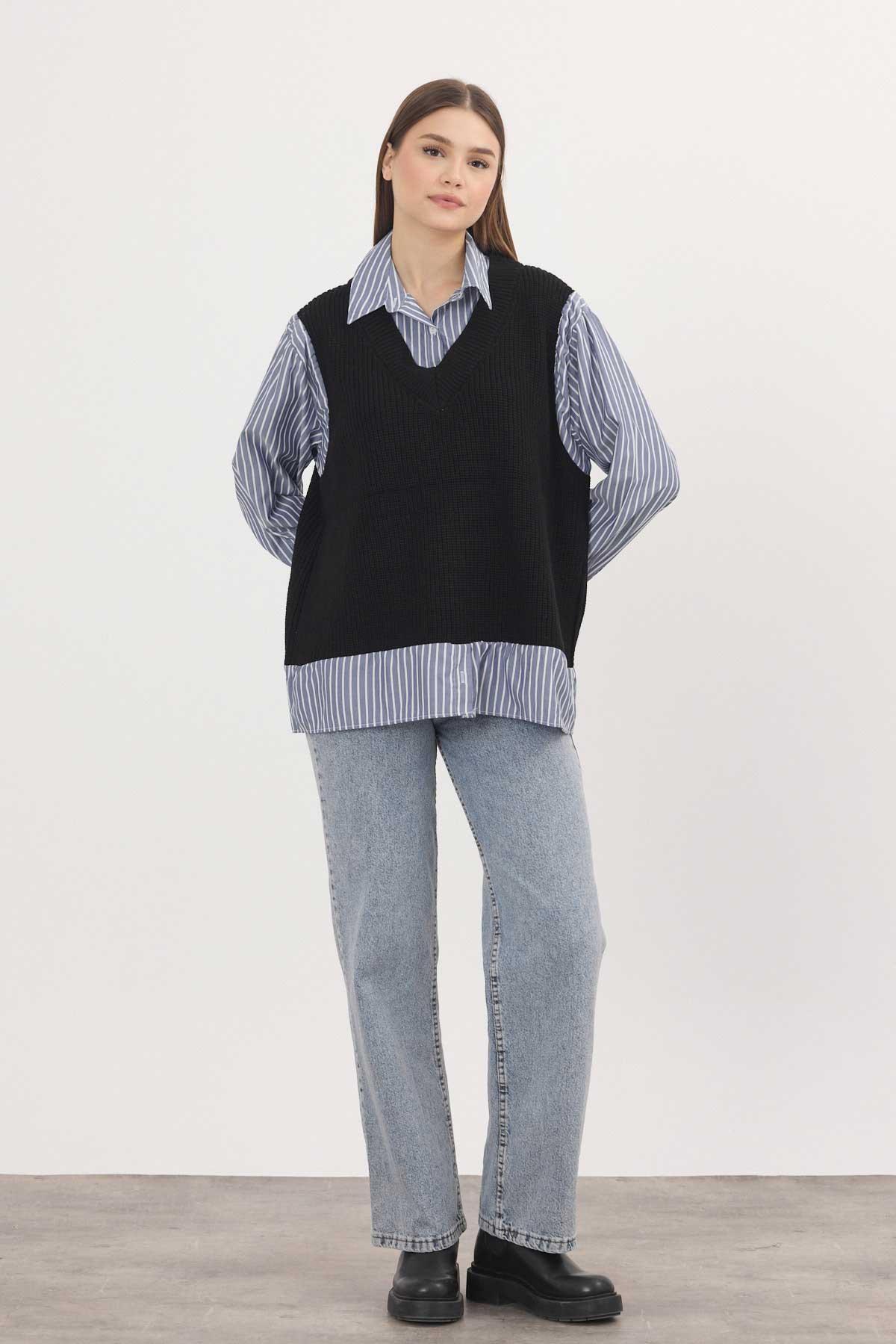 Siyah-Saks Gömlek Detay Kazak 5395