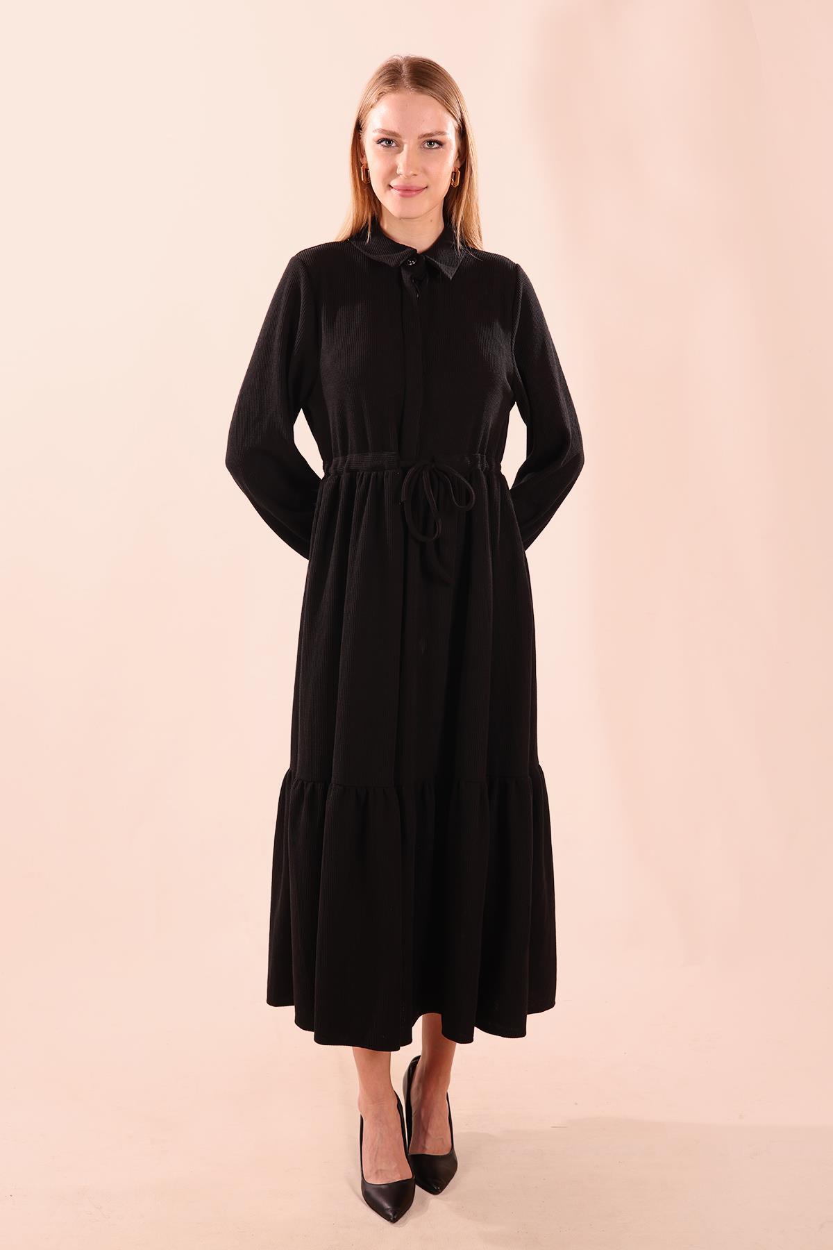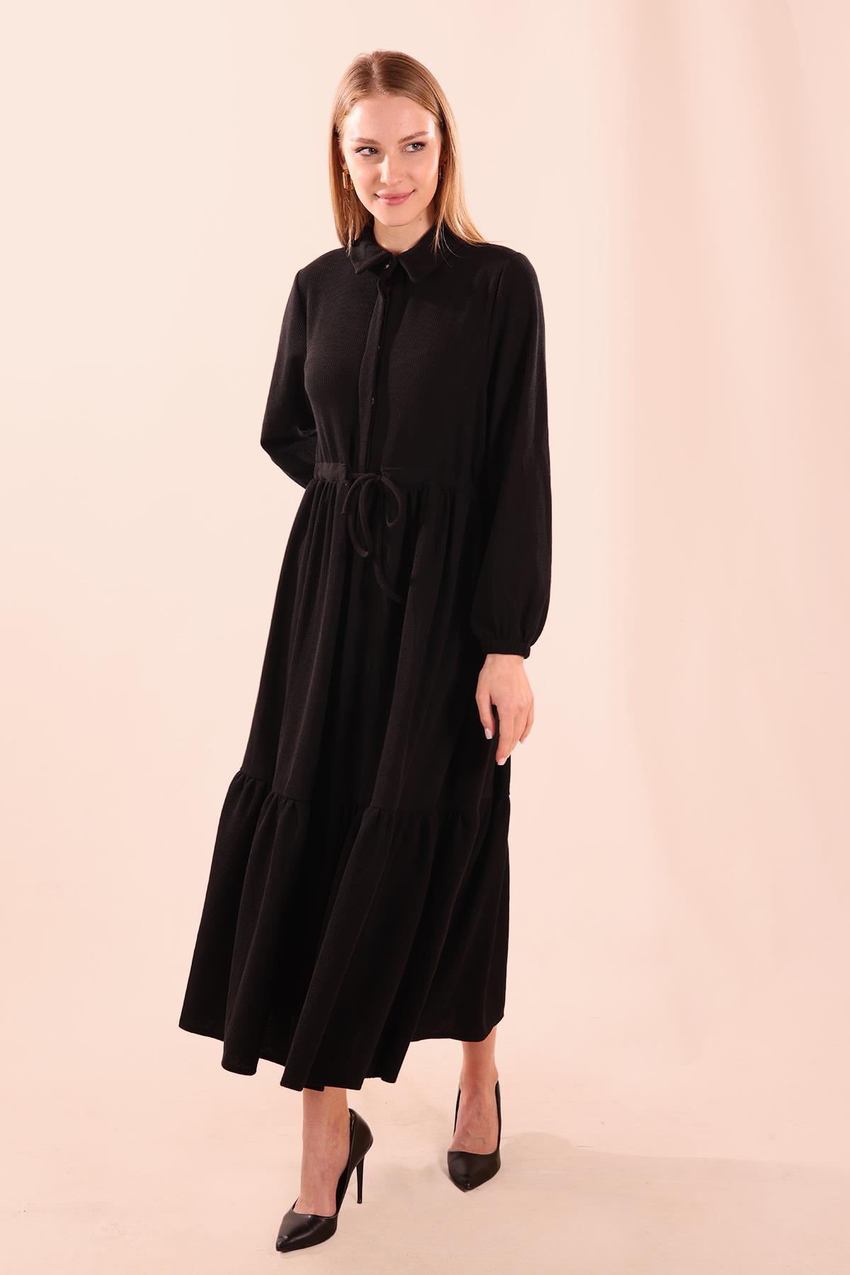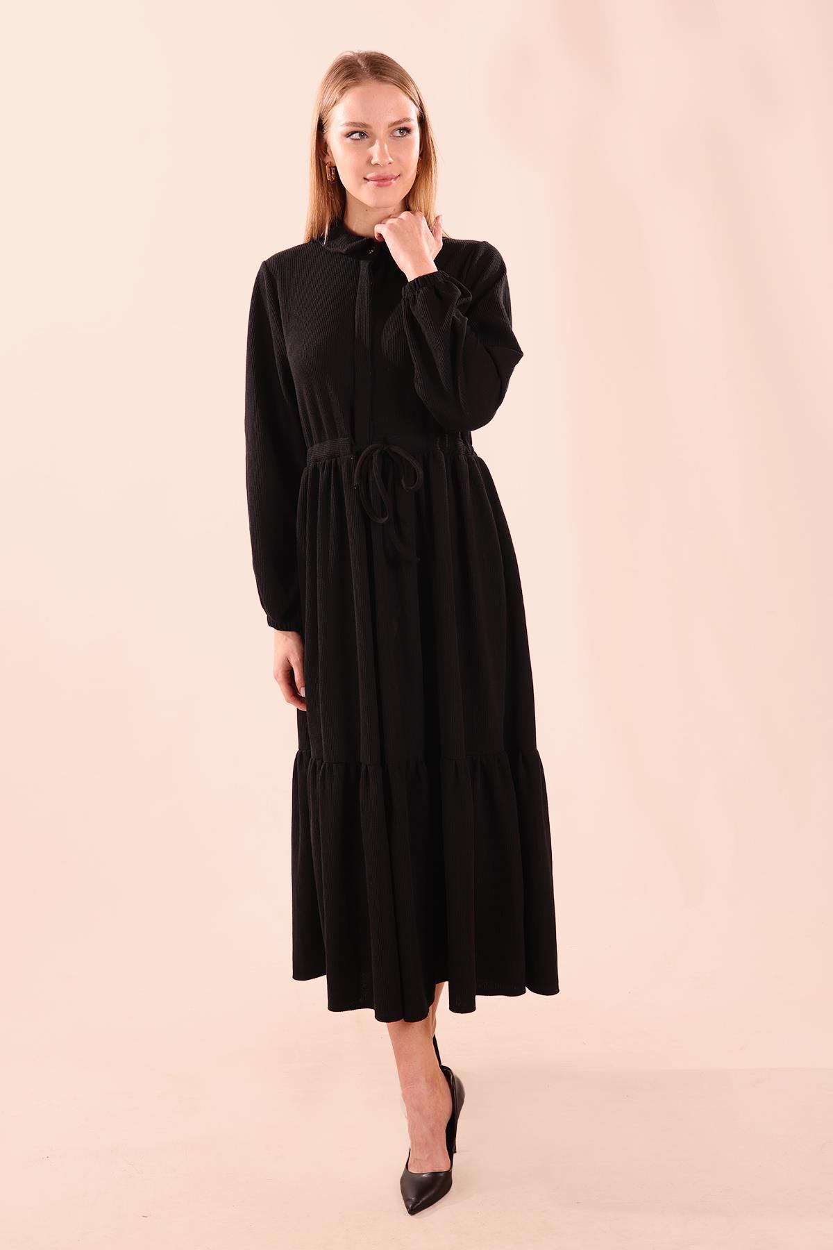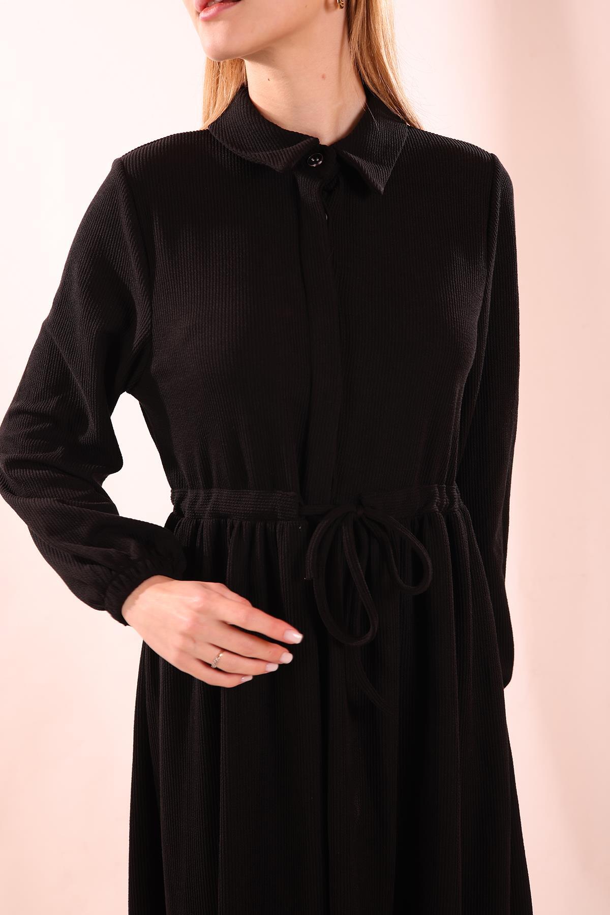 Siyah Bel Bağlamalı Düğmeli Elbise 5464