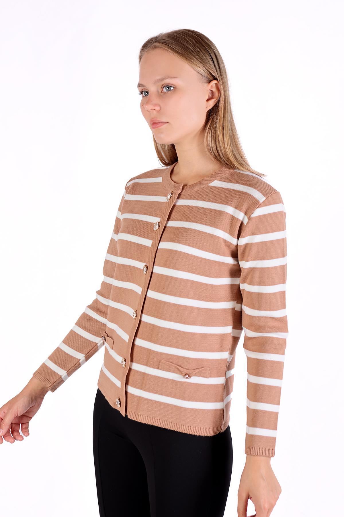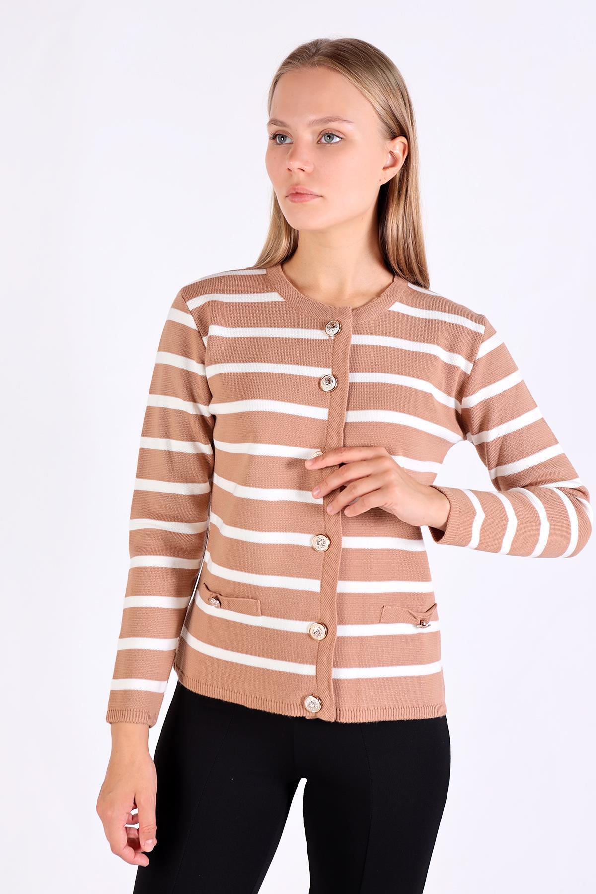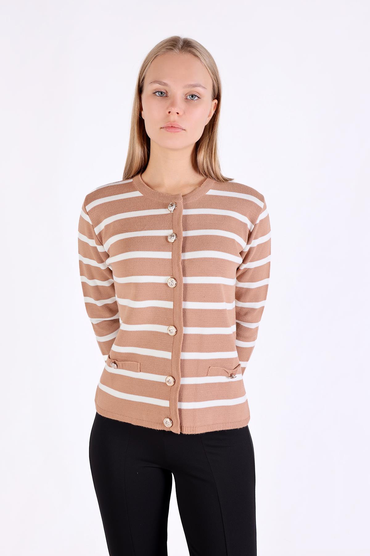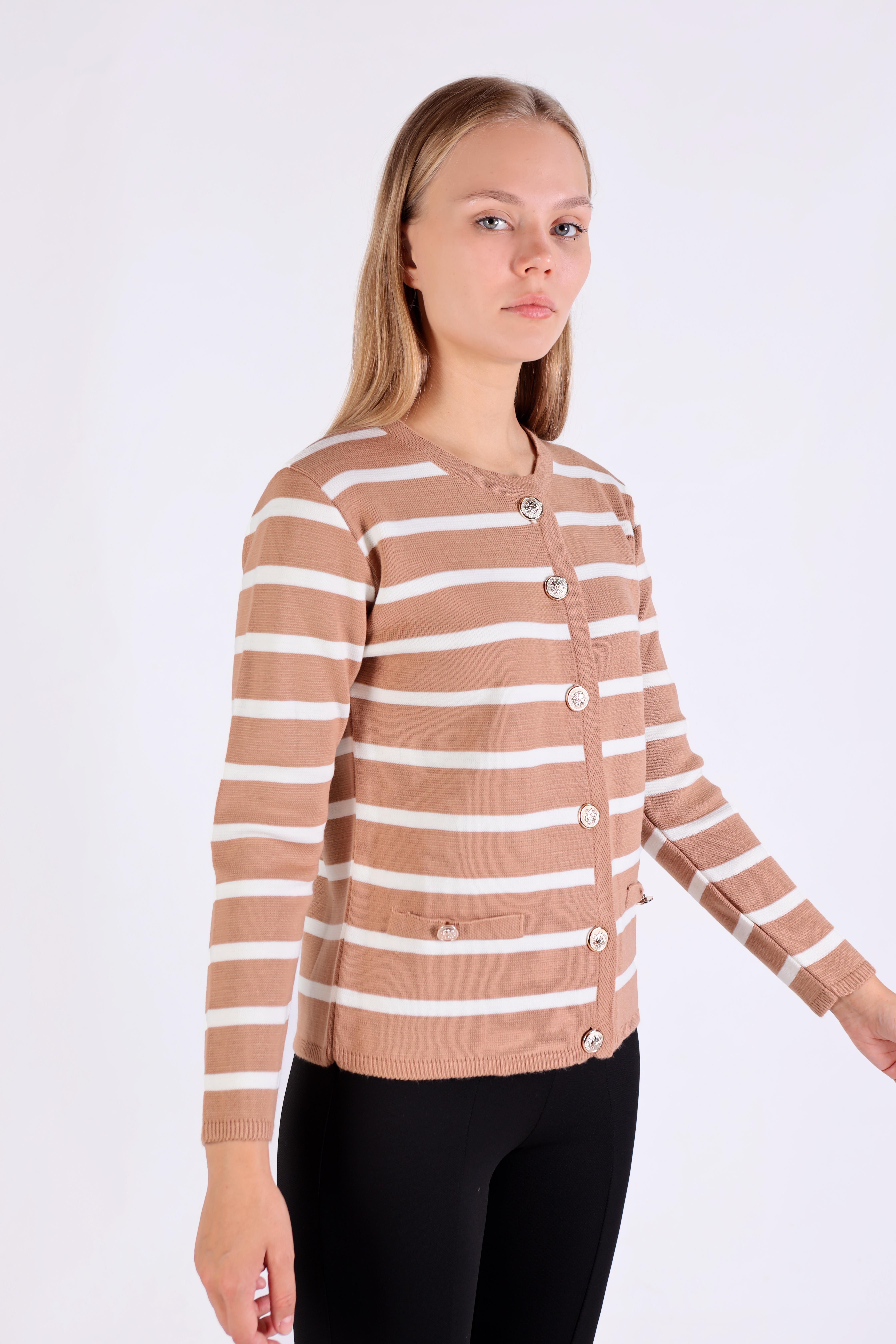 Camel Çizgili Kısa Düğme Detay Hırka 557