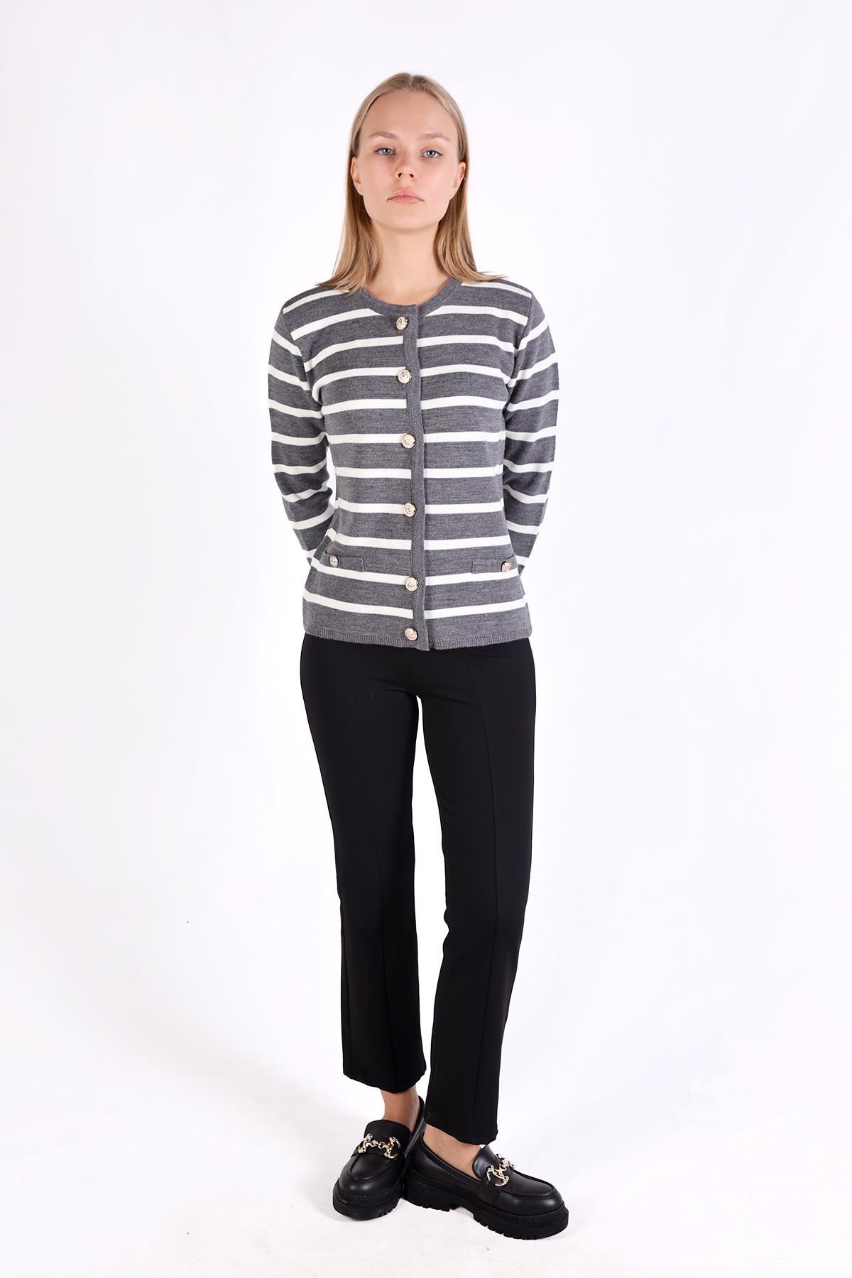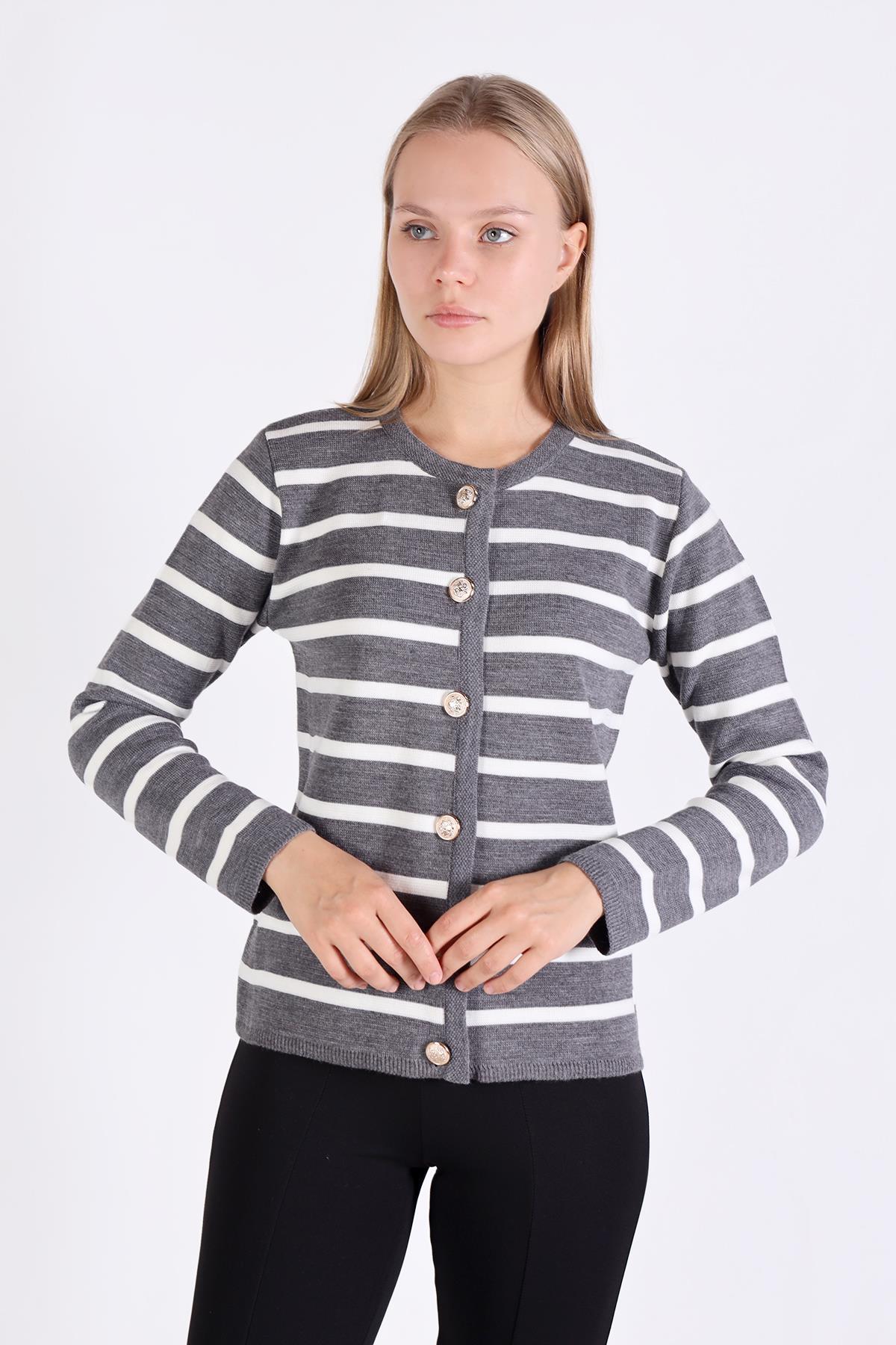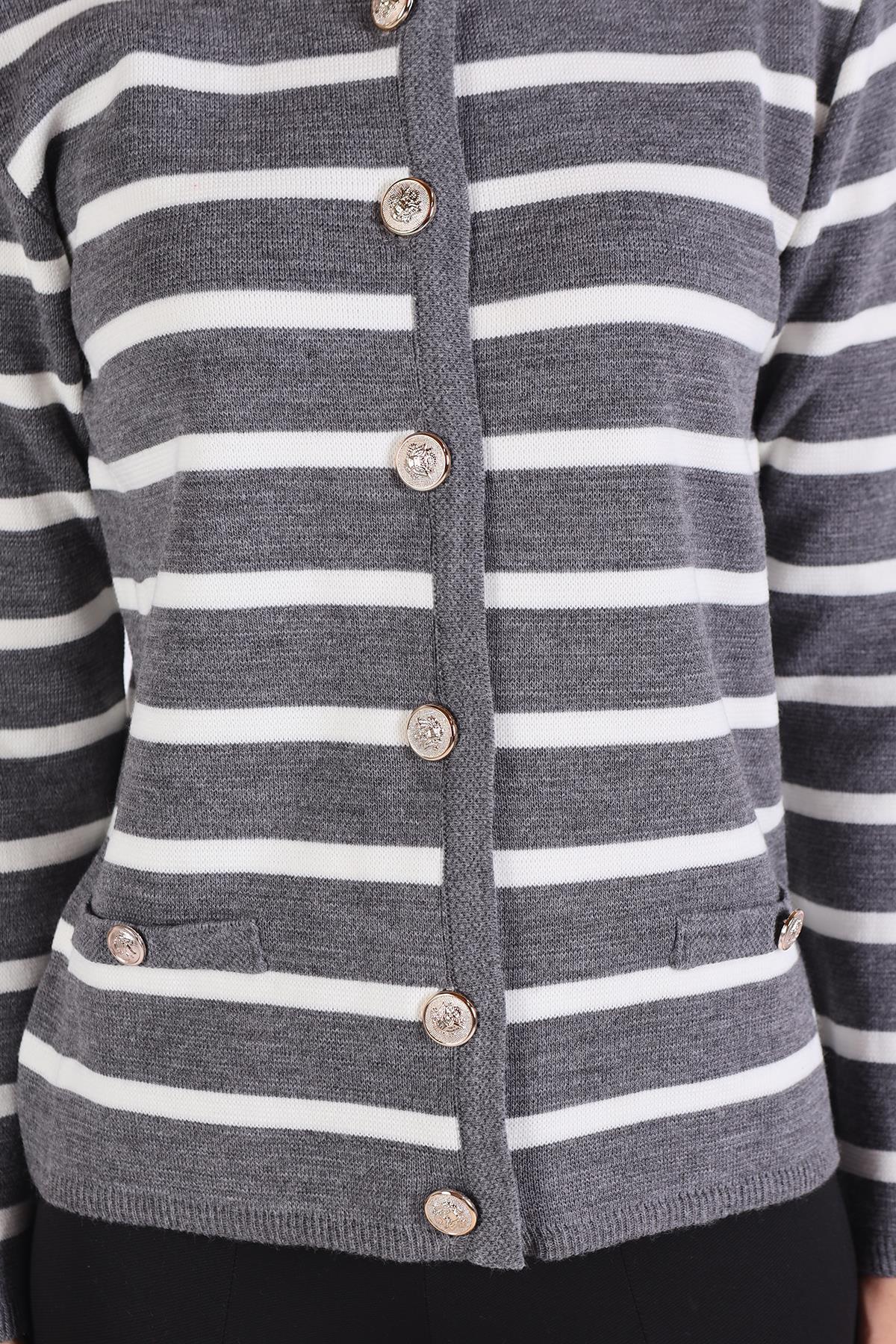 Gri Çizgili Kısa Düğme Detay Hırka 557