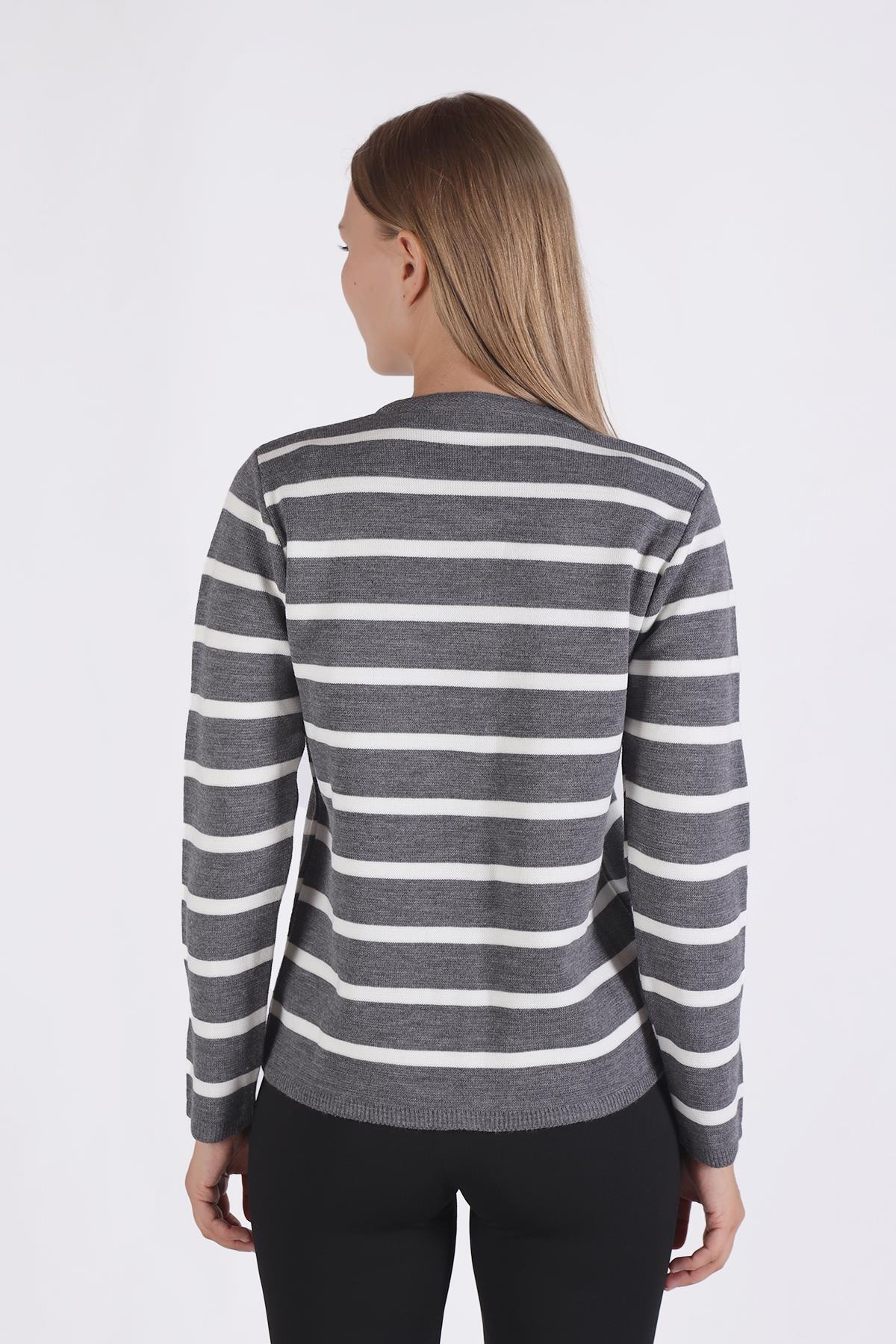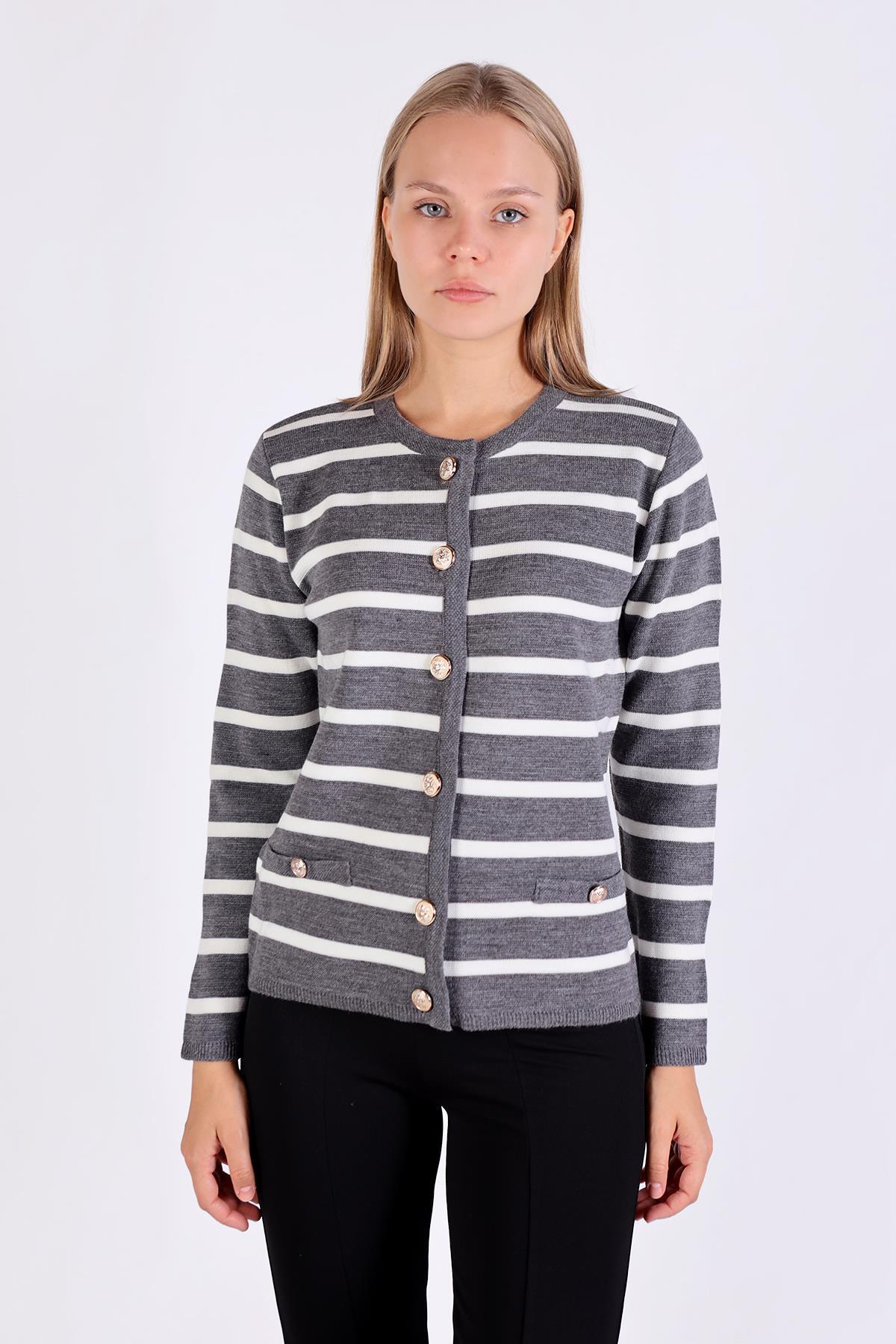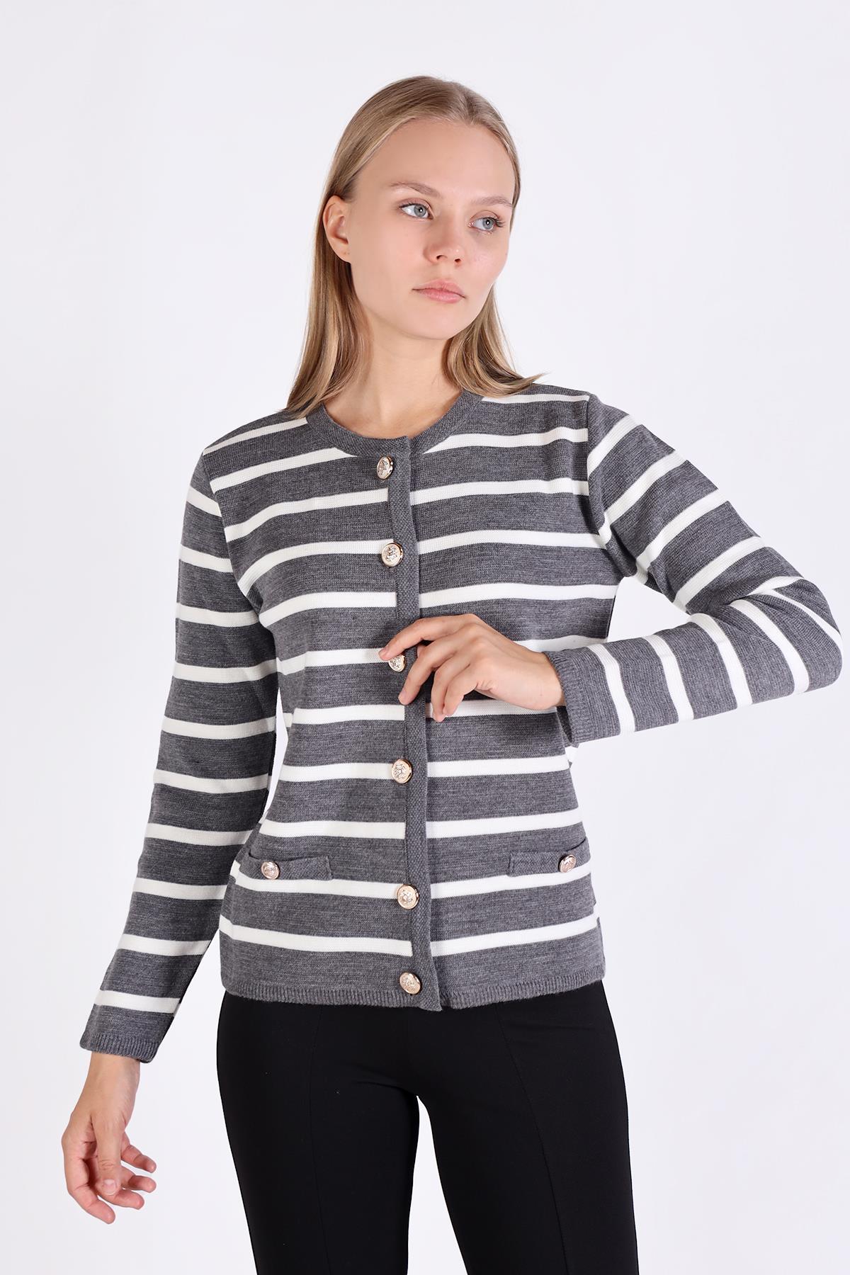 Gri Çizgili Kısa Düğme Detay Hırka 557