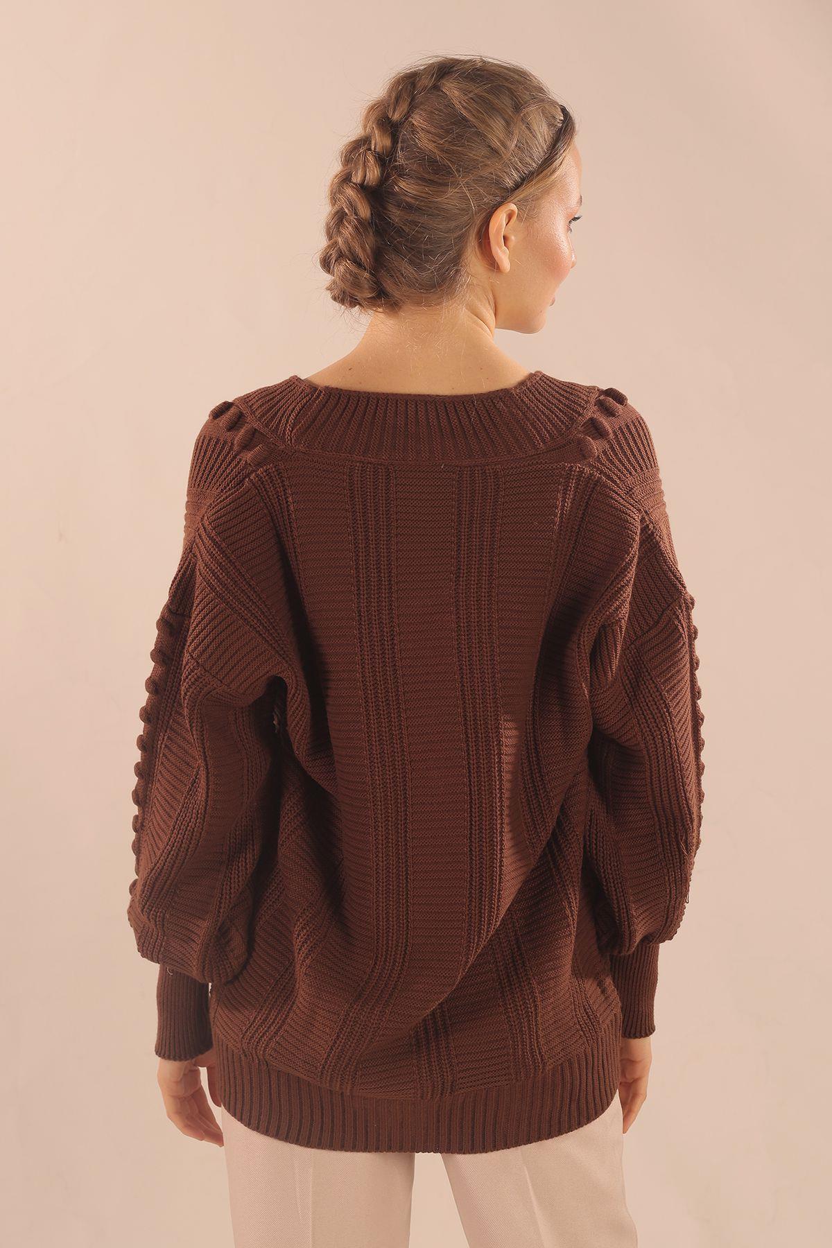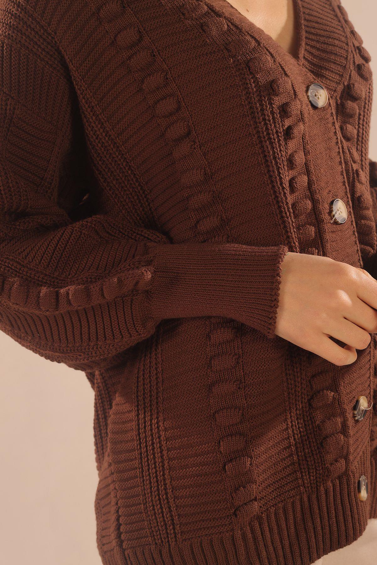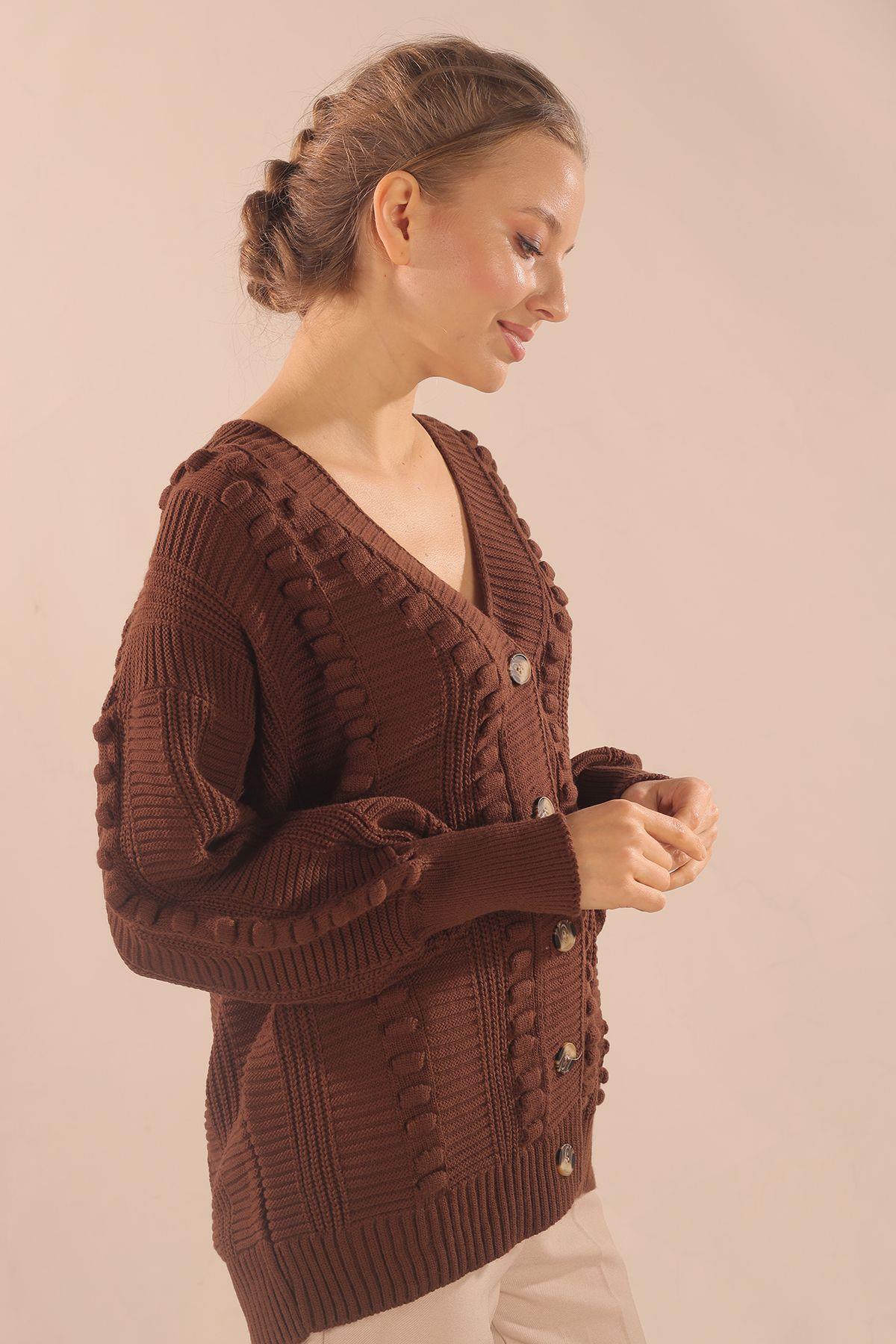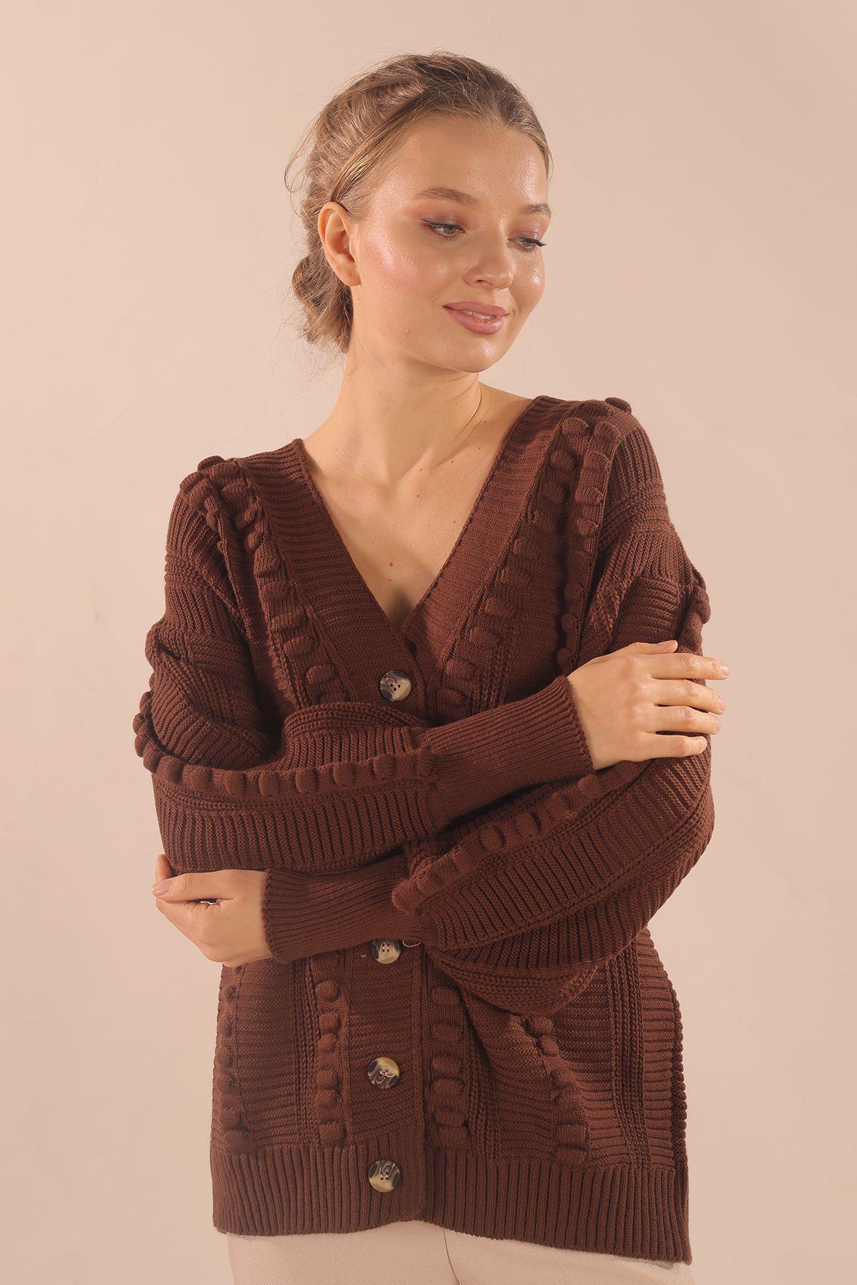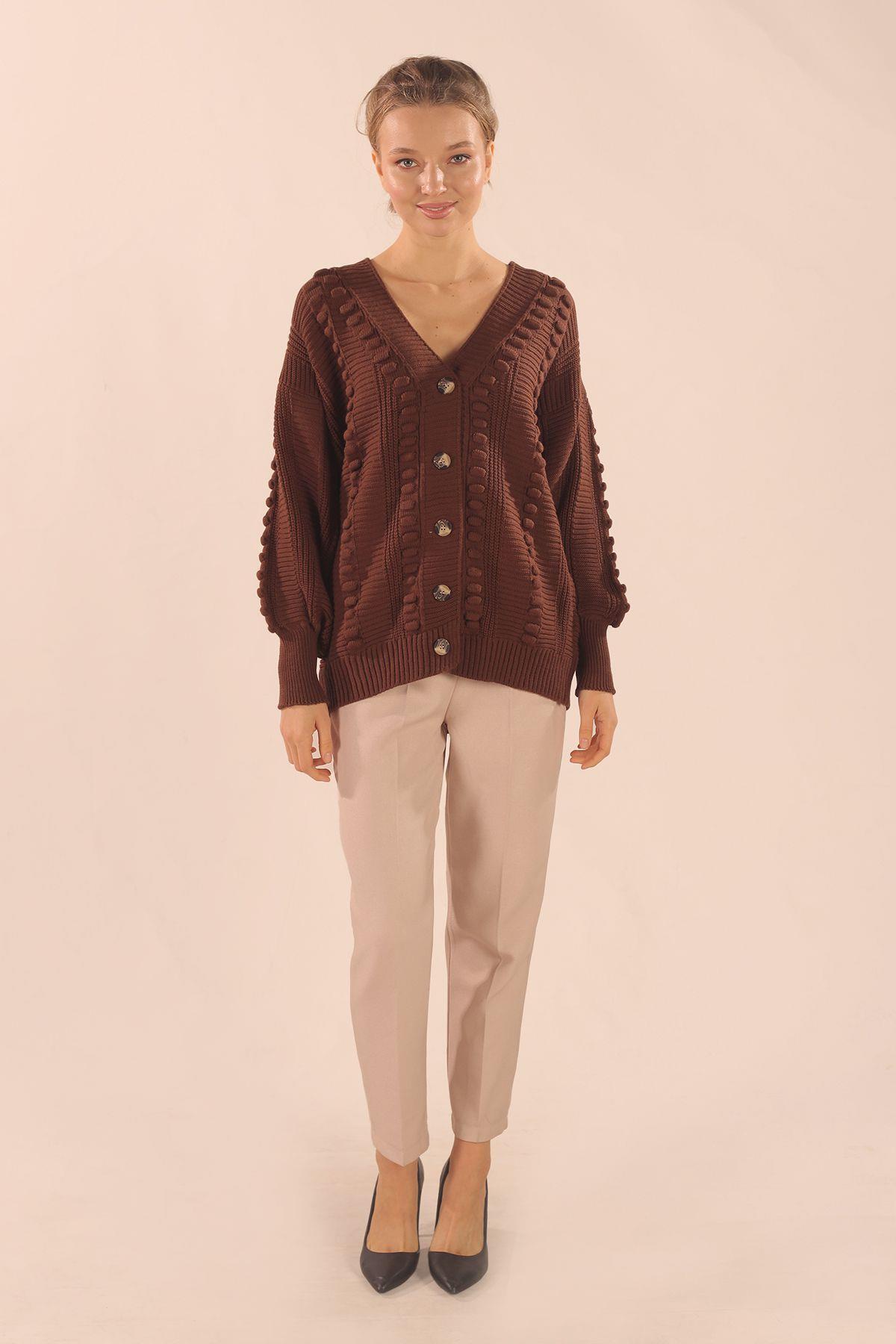 Kahve Düğmeli Balon Kol Hırka 6002
