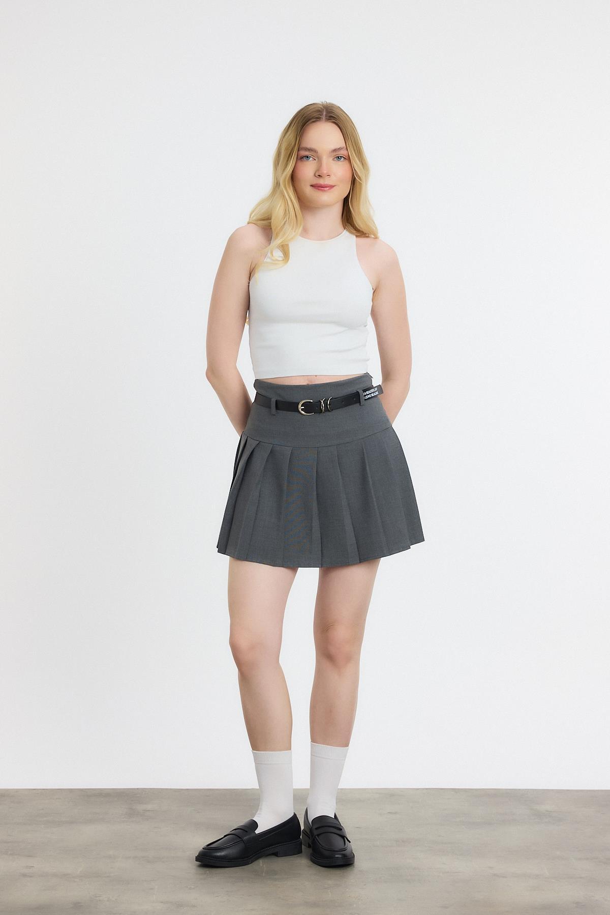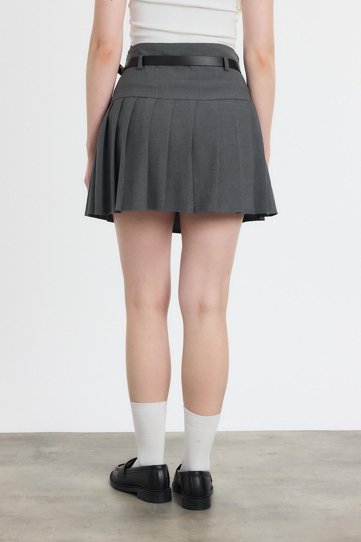 6024 Yazı Kemerli Şortlu Etek Gri