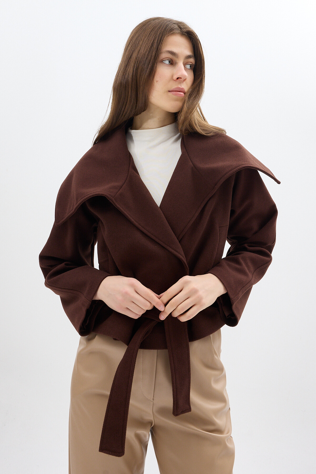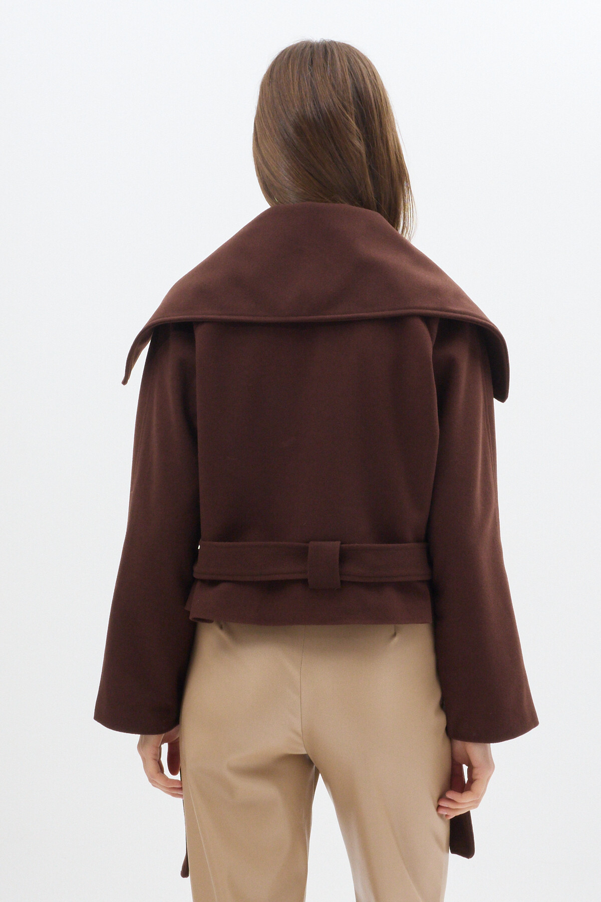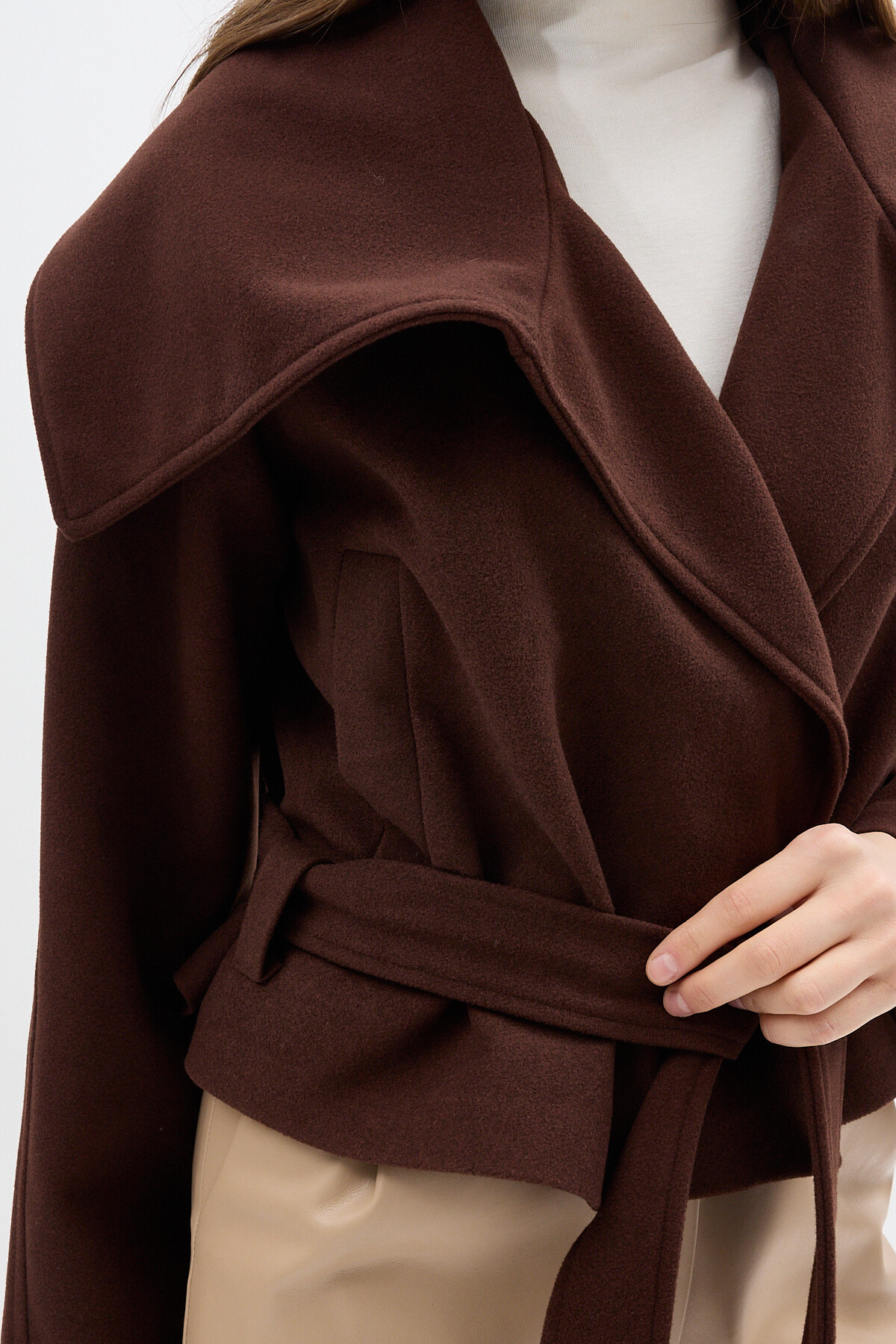 Acı Kahve Geniş Dökümlü Yaka Kuşaklı Kısa Kadın Kaban 60566