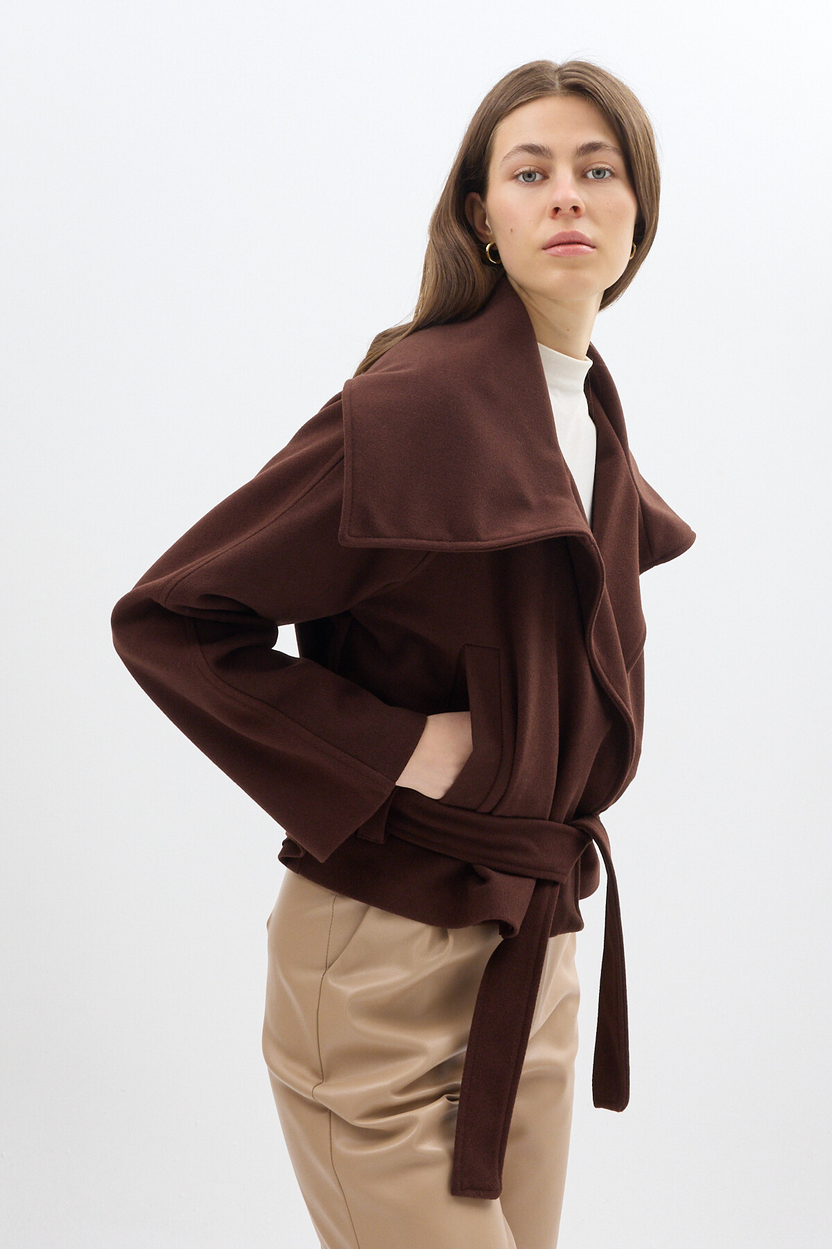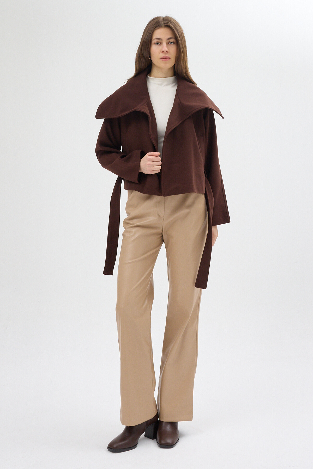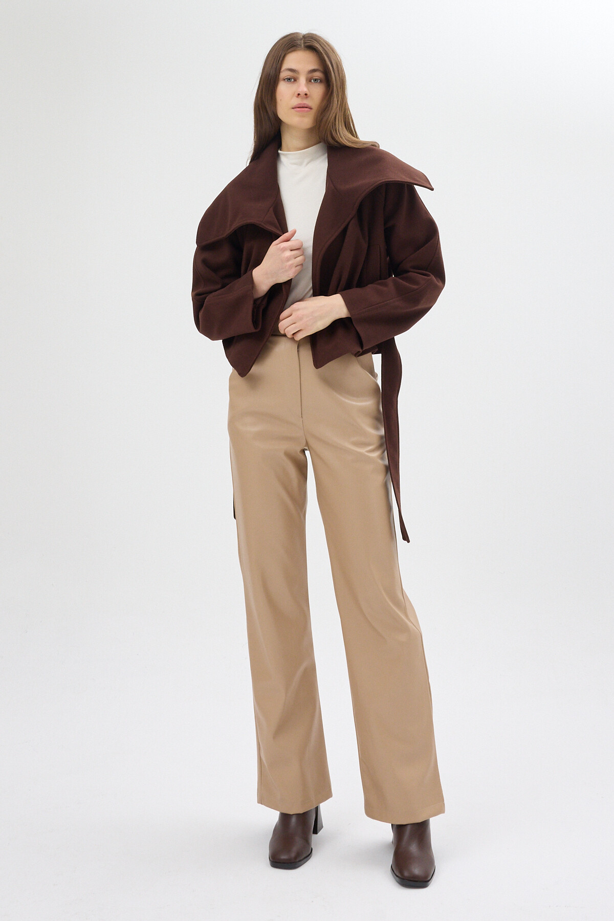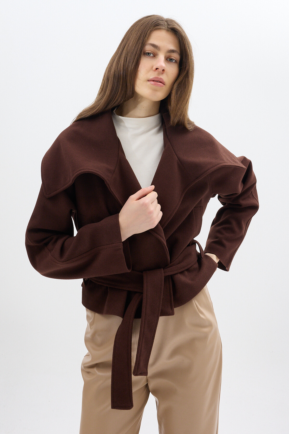 Acı Kahve Geniş Dökümlü Yaka Kuşaklı Kısa Kadın Kaban 60566