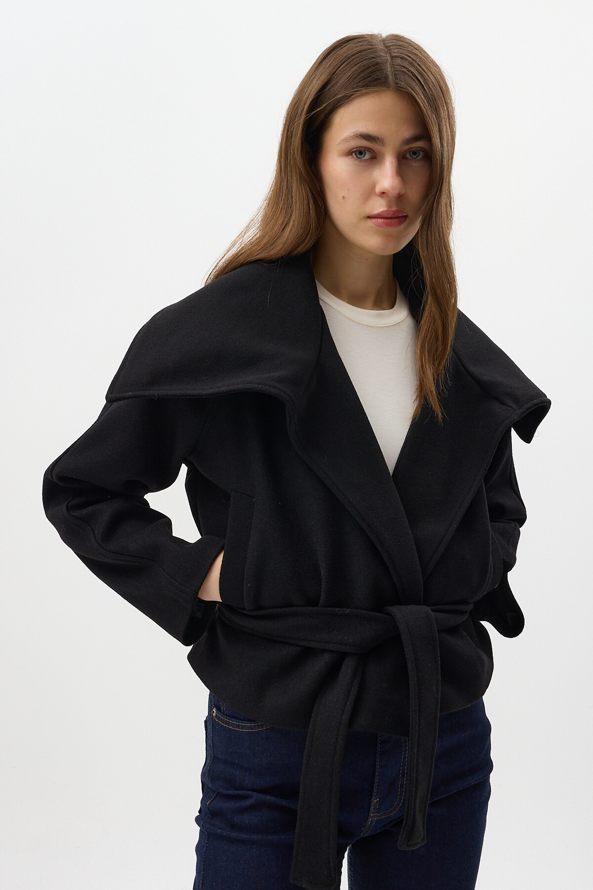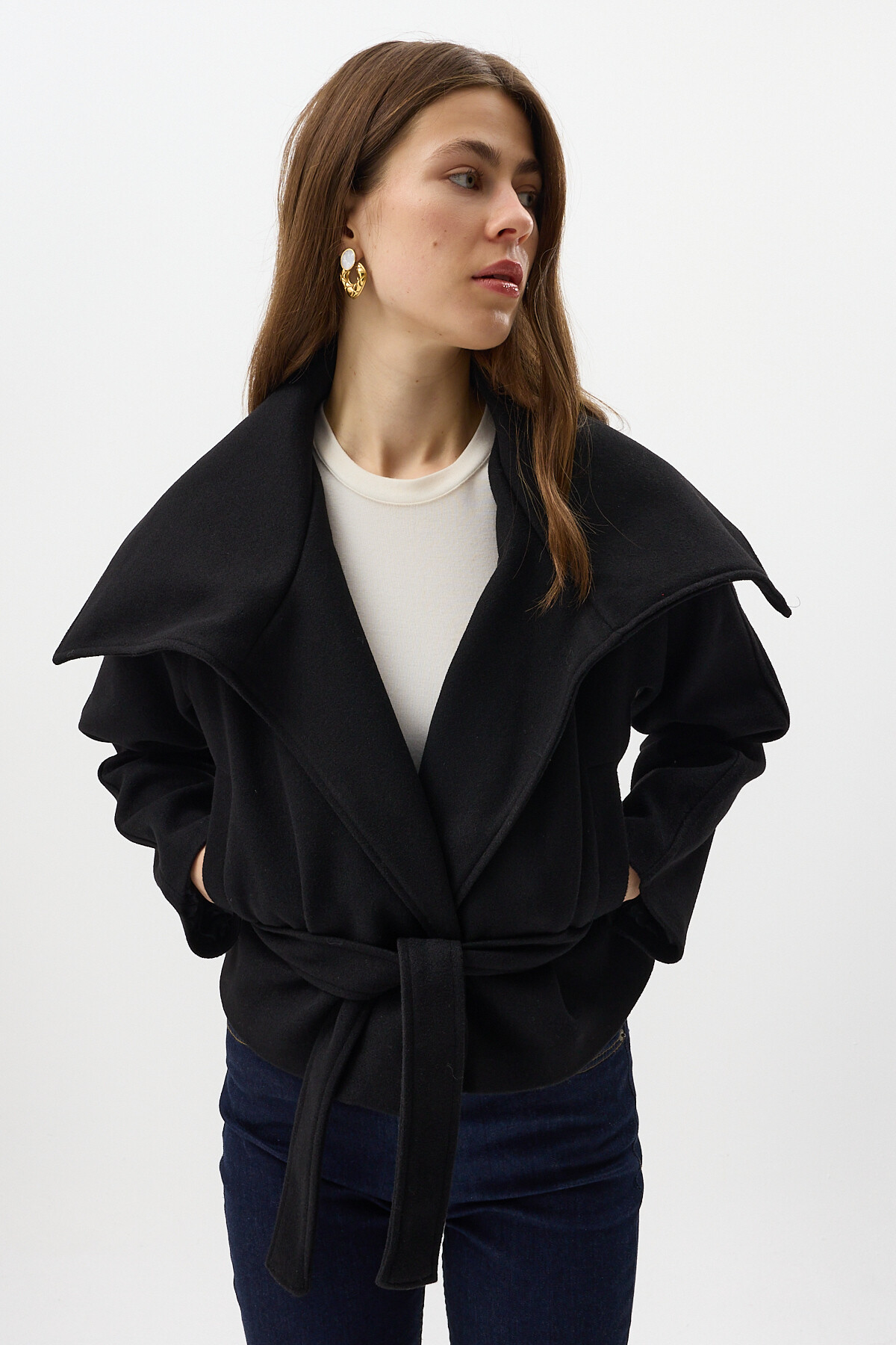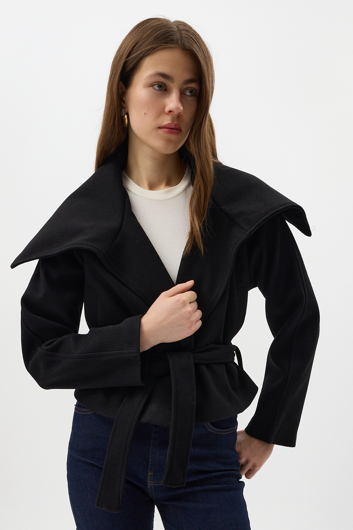 Siyah Geniş Dökümlü Yaka Kuşaklı Kısa Kadın Kaban 60566