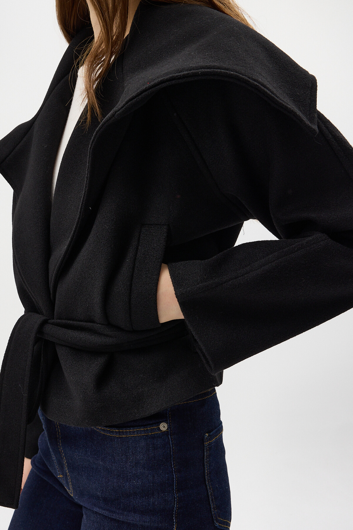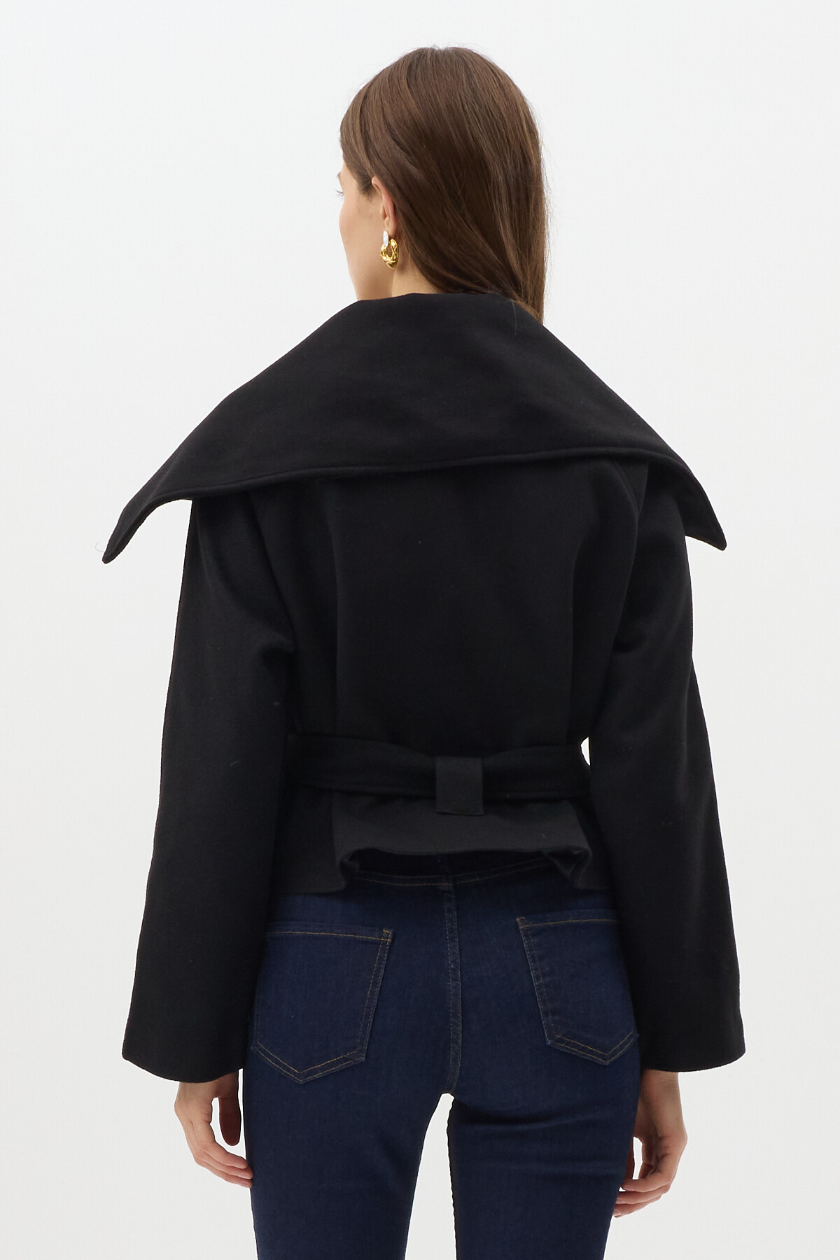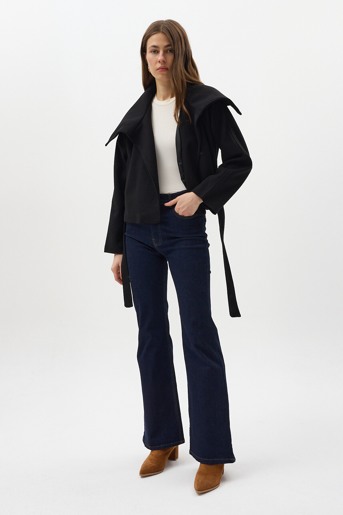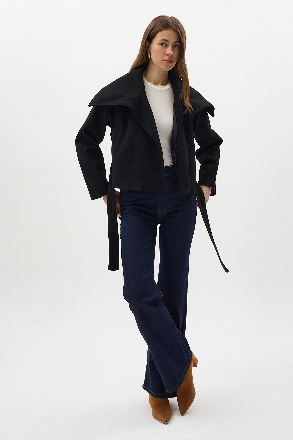 Siyah Geniş Dökümlü Yaka Kuşaklı Kısa Kadın Kaban 60566