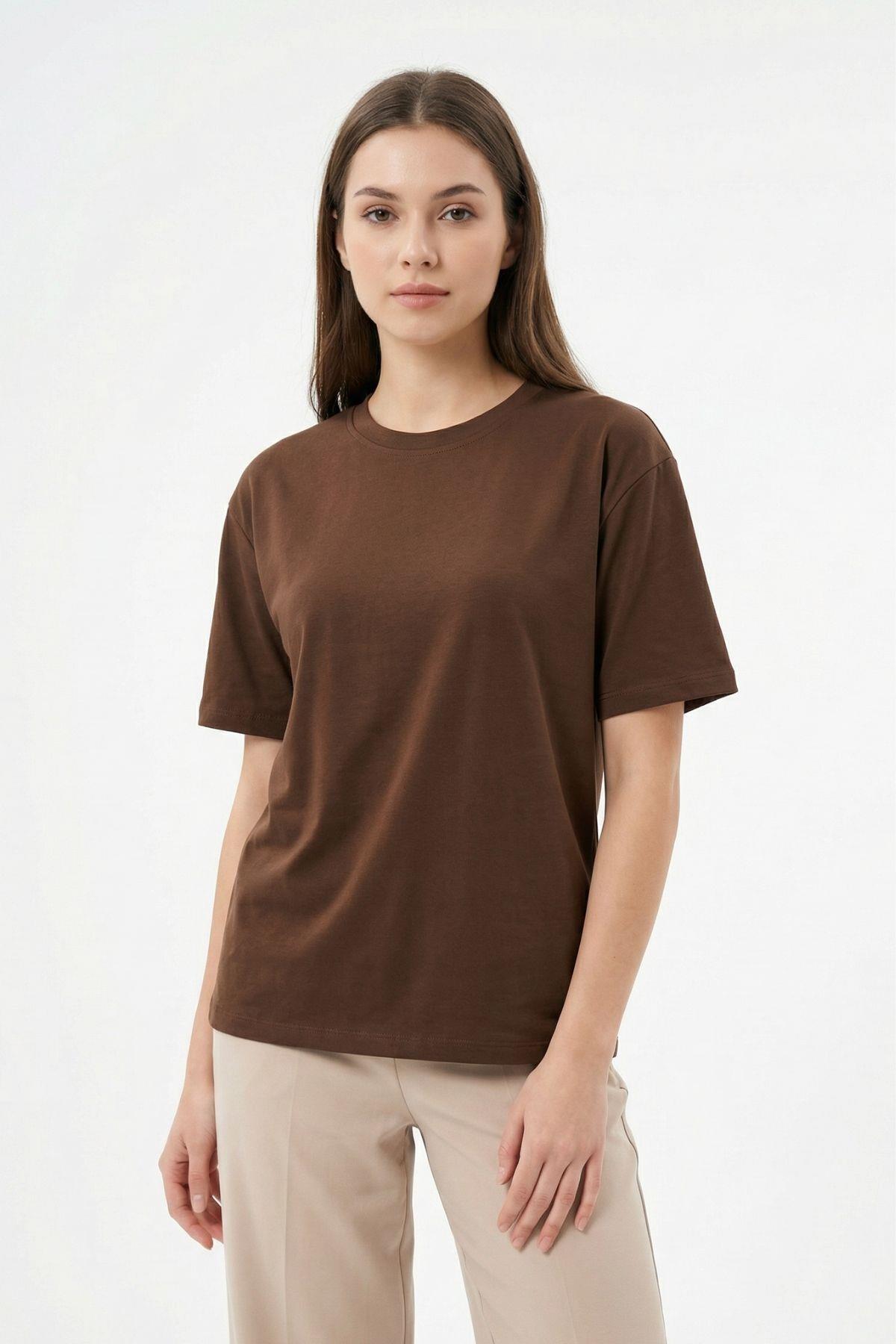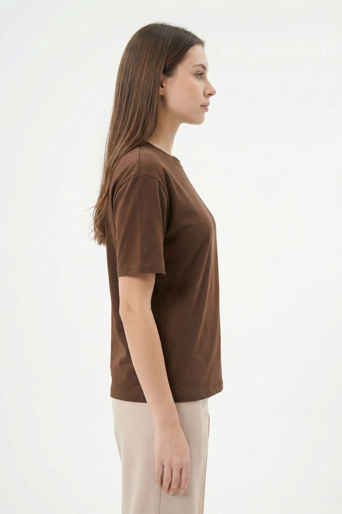 6109 Bisiklet Yaka Kısa Kol Tişört Kahve