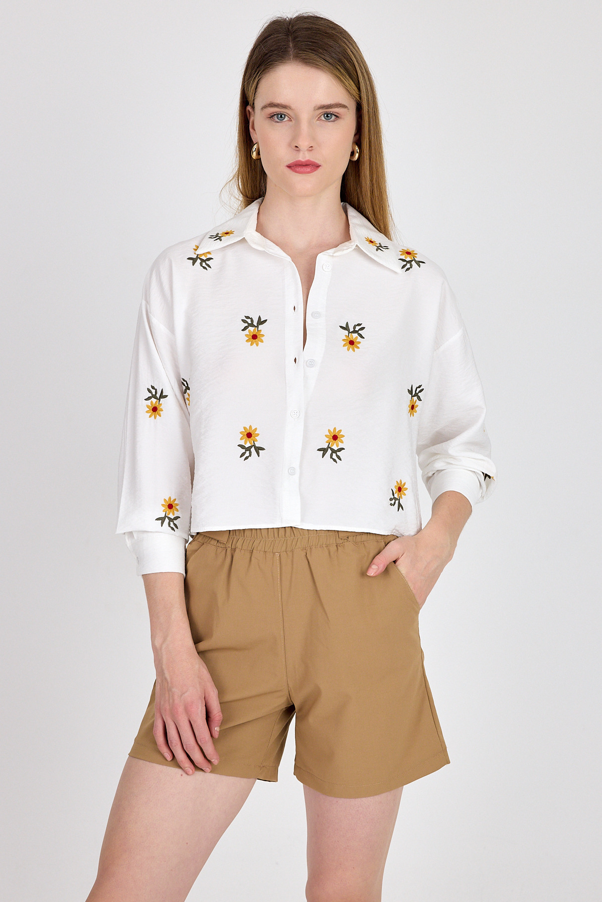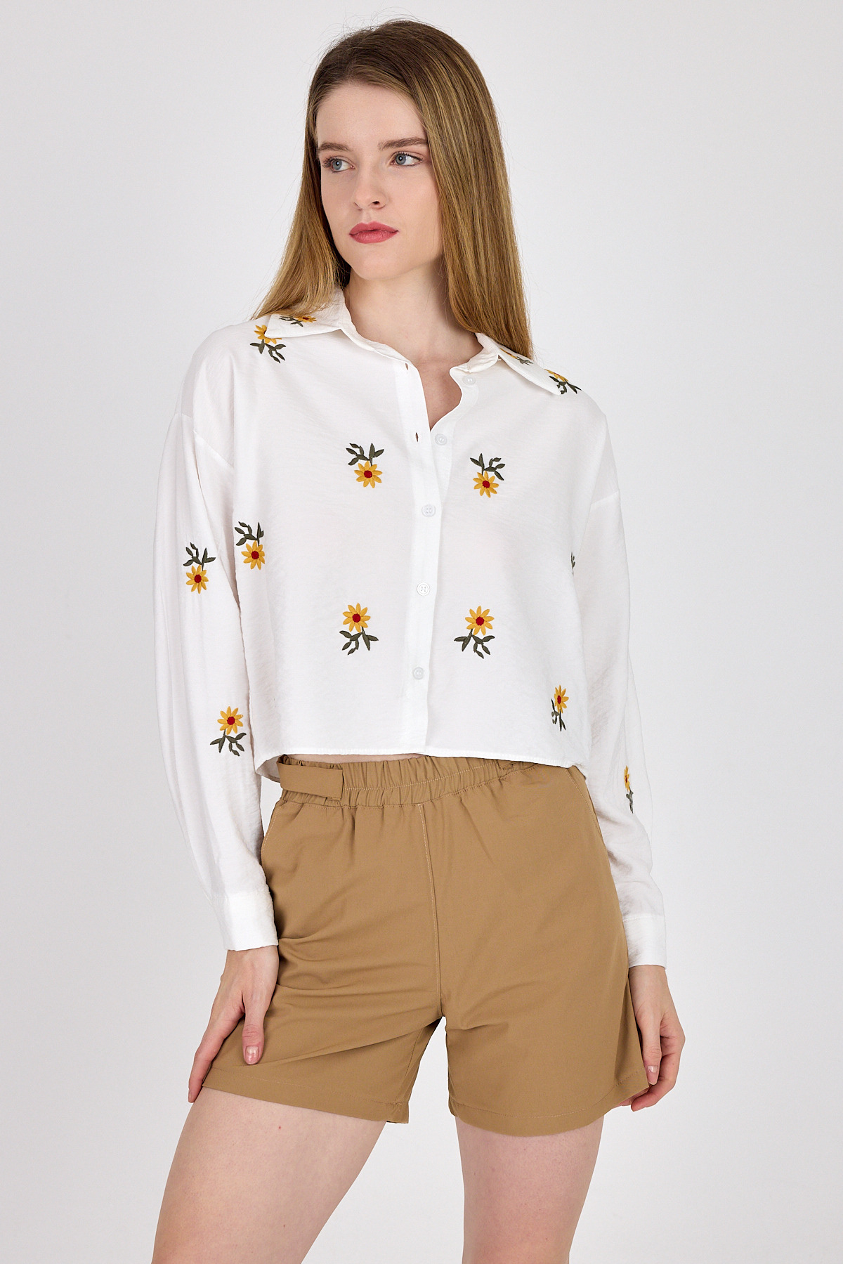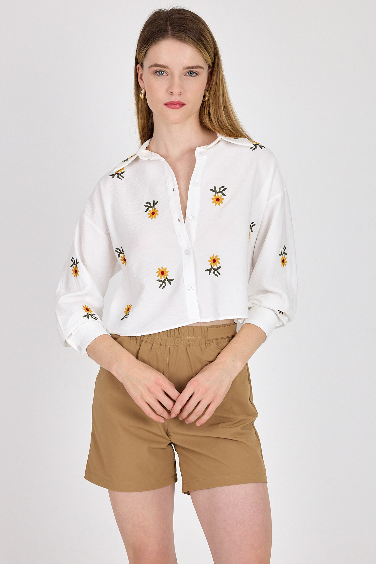 Beyaz Çiçek Nakışlı Gömlek 6232