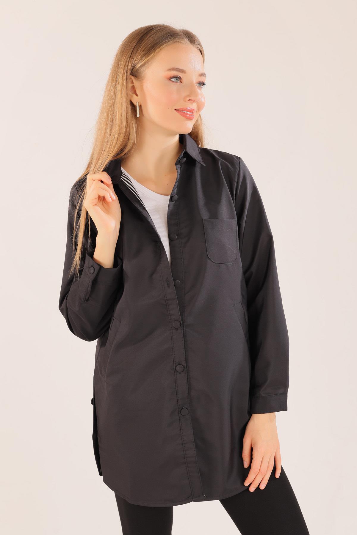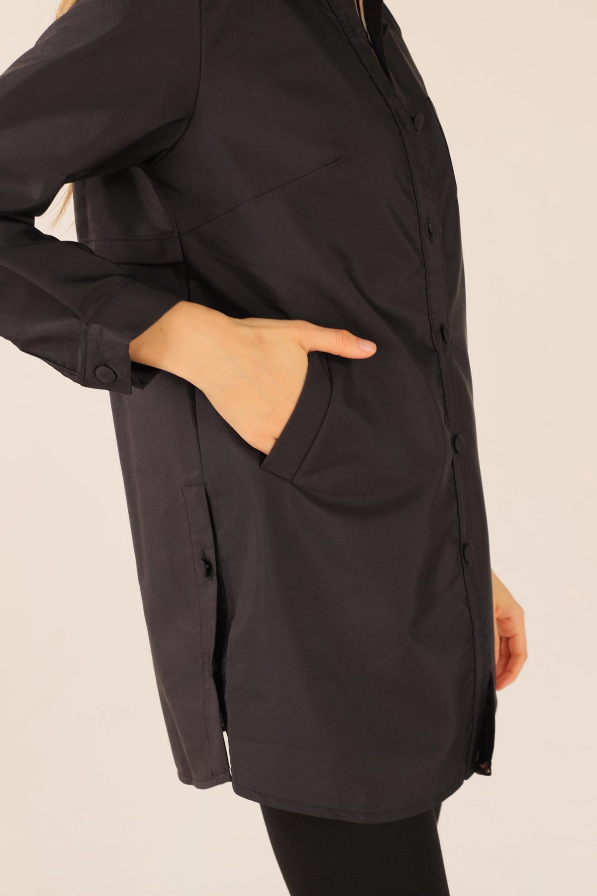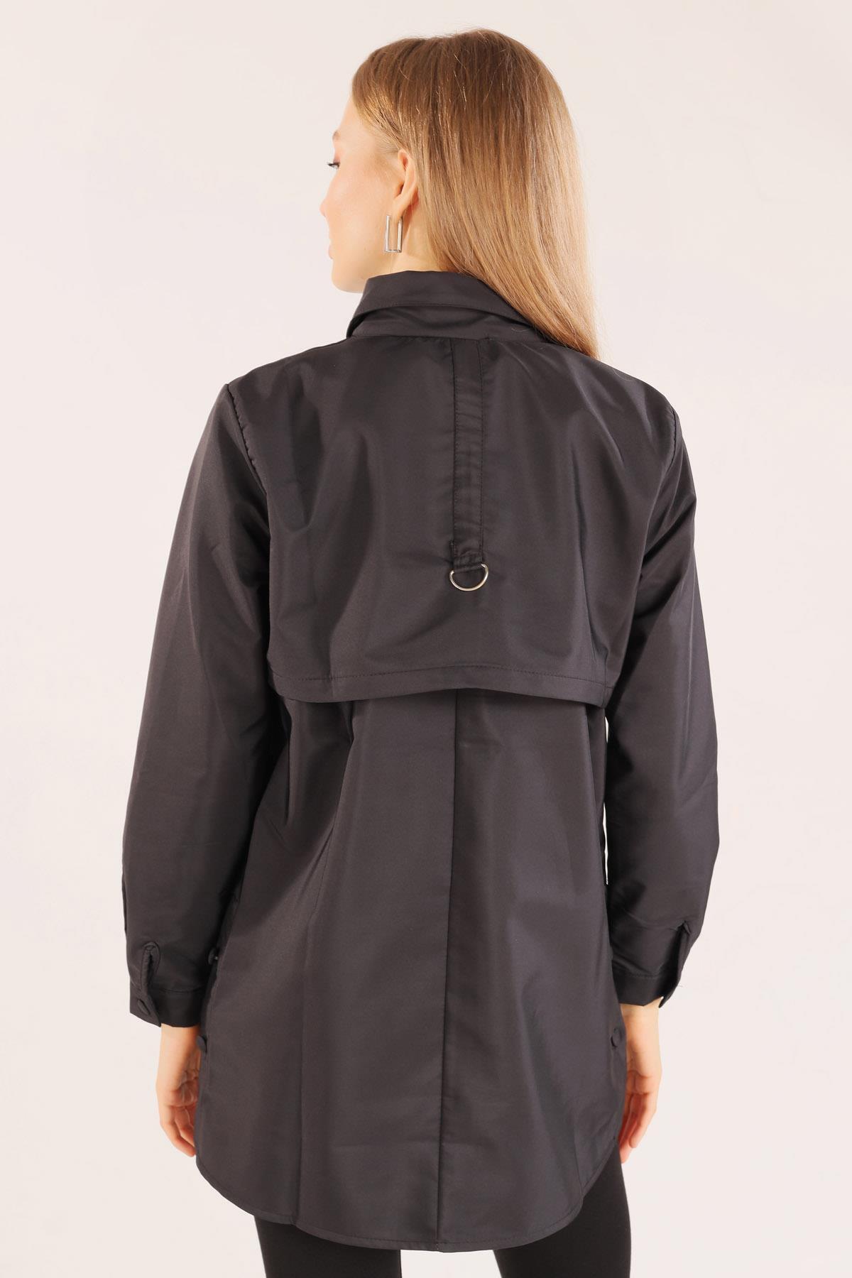 Siyah Cep Detay Düğmeli Trençkot 6265