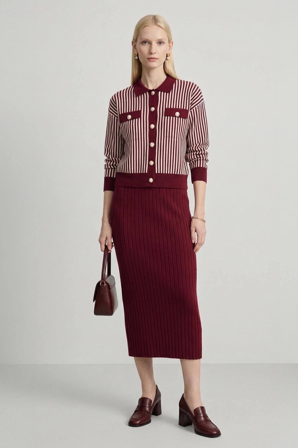 6425 Çizgili Düğmeli Etek Takım Bordo