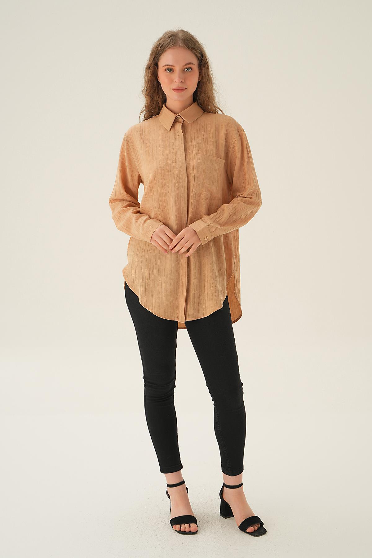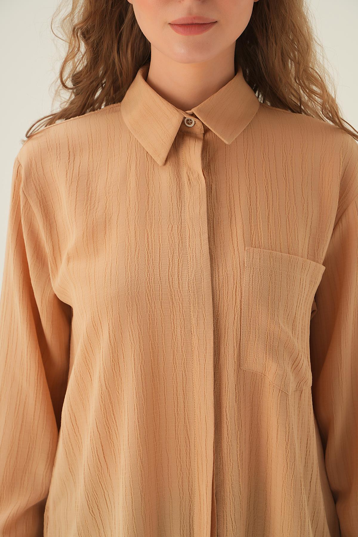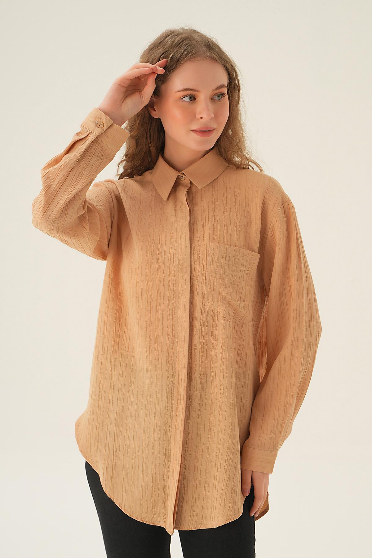 Bej Üçgen Fularlı Oversize Ekose Gömlek 5484