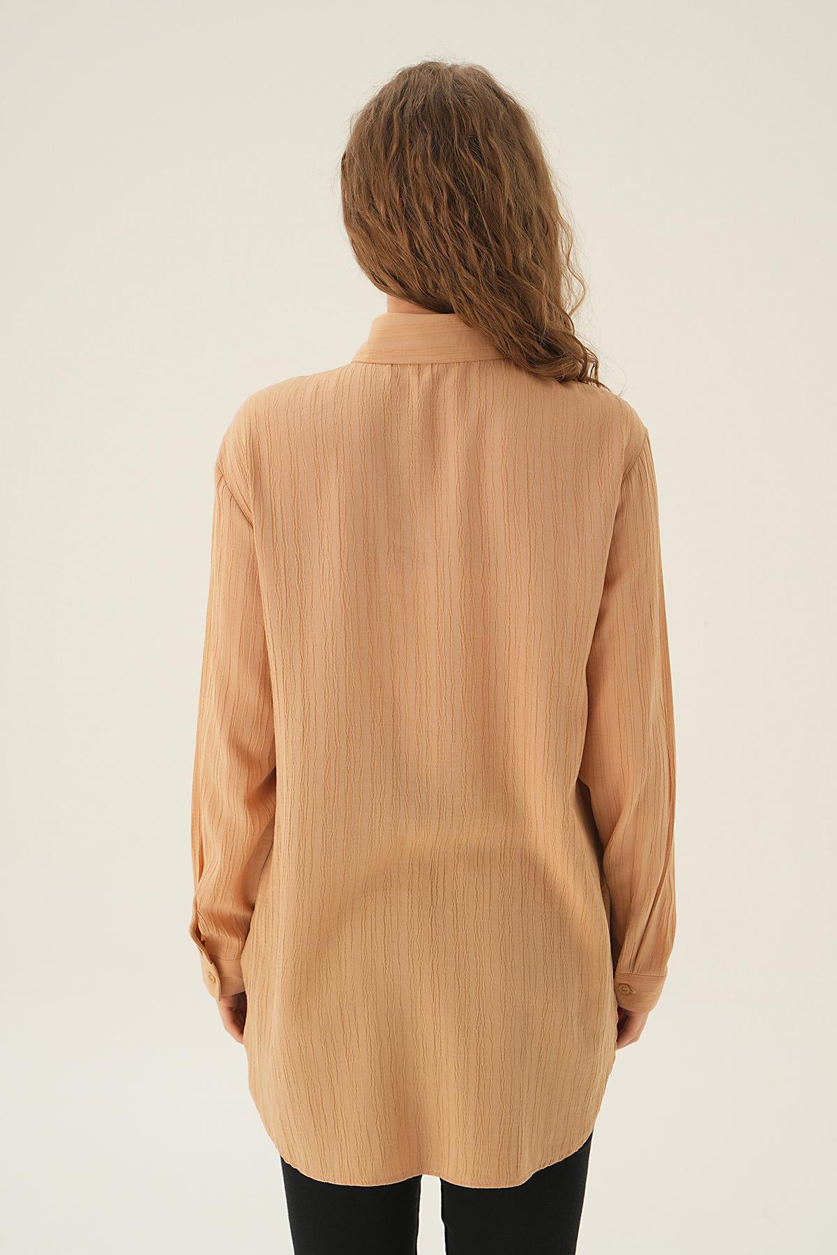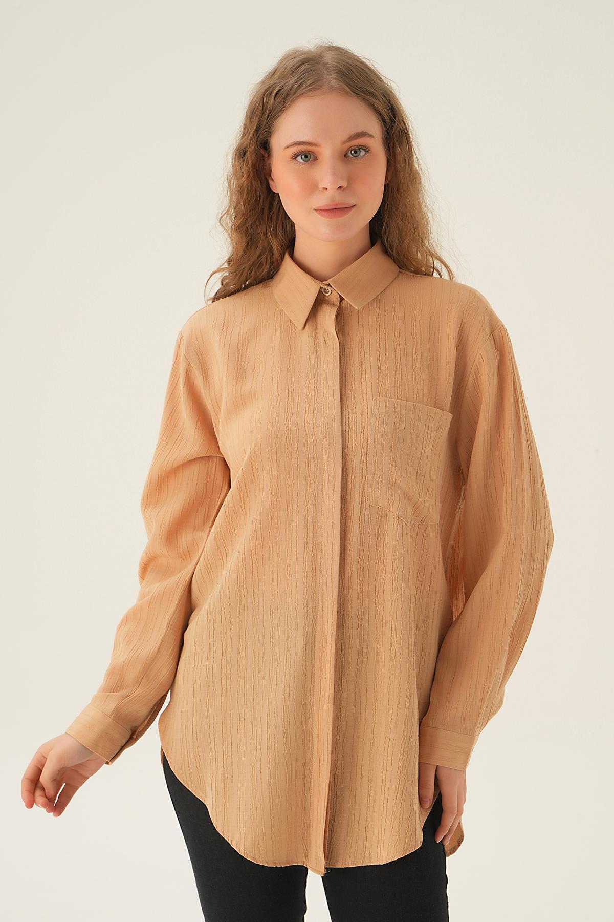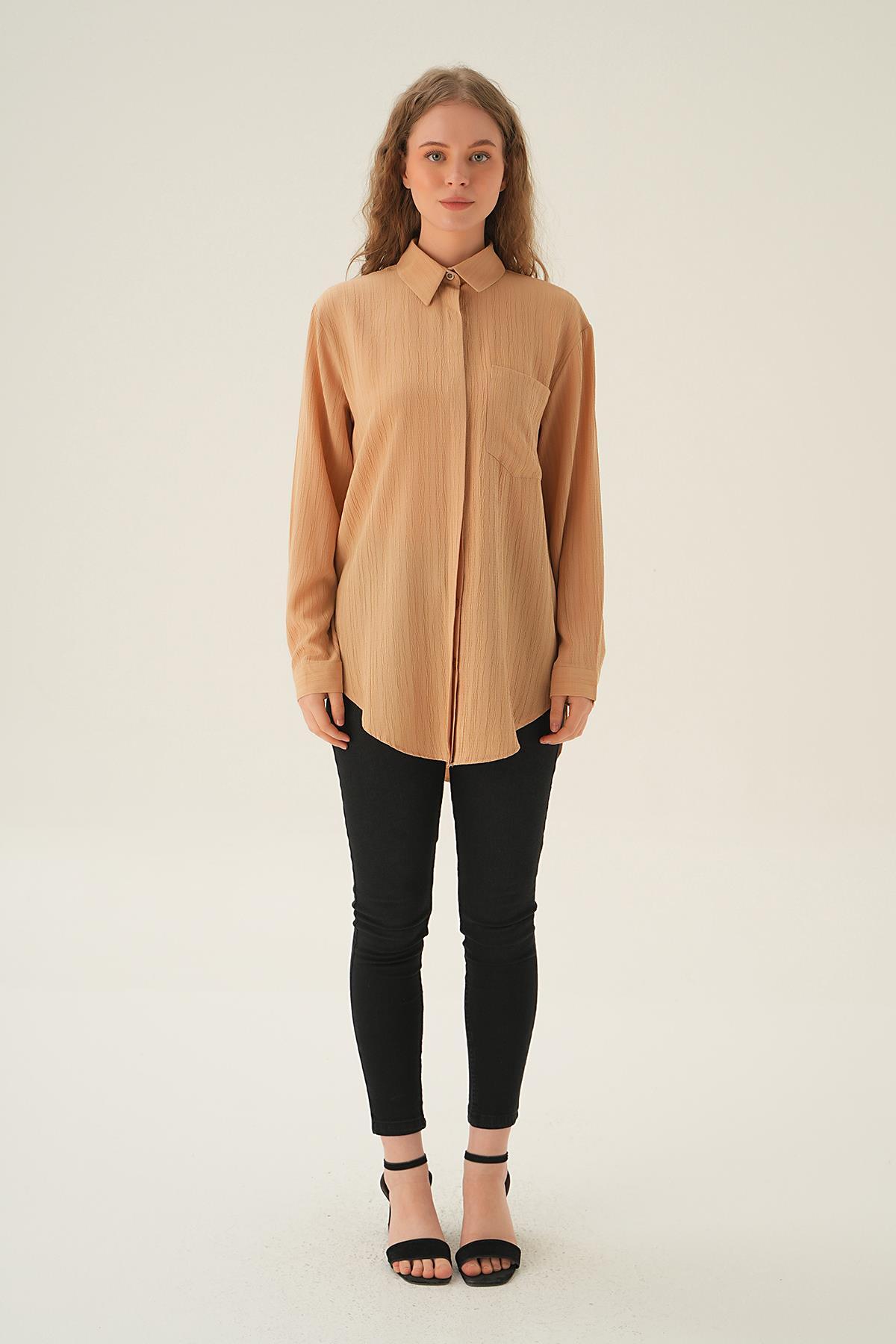Bej Üçgen Fularlı Oversize Ekose Gömlek 5484